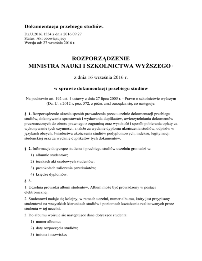 Dokumentacja przebiegu studiów. Dz.U.2016.1554 z dnia 2016.09.27 Status: Akt obowiązujący Wersja od: 27 września 2016 r. ROZPORZĄDZENIE MINISTRA NAUKI I SZKOLNICTWA WYŻSZEGO 1 z dnia 16 września 2016 r. w sprawie dokumentacji przebiegu studiów Na podstawie art. 192 ust. 1 ustawy z dnia 27 lipca 2005 r. - Prawo o szkolnictwie wyższym (Dz. U. z 2012 r. poz. 572, z późn. zm.) zarządza się, co następuje: § 1. Rozporządzenie określa sposób prowadzenia przez uczelnie dokumentacji przebiegu studiów, dokonywania sprostowań i wydawania duplikatów, uwierzytelniania dokumentów przeznaczonych do obrotu prawnego z zagranicą oraz wysokość i sposób pobierania opłaty za wykonywanie tych czynności, a także za wydanie dyplomu ukończenia studiów, odpisów w językach obcych, świadectwa ukończenia studiów podyplomowych, indeksu, legitymacji studenckiej oraz za wydanie duplikatów tych dokumentów. § 2. Informacje dotyczące studenta i przebiegu studiów uczelnia gromadzi w: 1) albumie studentów; 2) teczkach akt osobowych studentów; 3) protokołach zaliczenia przedmiotów; 4) księdze dyplomów. § 3. 1. Uczelnia prowadzi album studentów. Album może być prowadzony w postaci elektronicznej. 2. Studentowi nadaje się kolejny, w ramach uczelni, numer albumu, który jest przypisany studentowi na wszystkich kierunkach studiów i poziomach kształcenia realizowanych przez studenta w tej uczelni. 3. Do albumu wpisuje się następujące dane dotyczące studenta: 1) numer albumu; 2) datę rozpoczęcia studiów; 3) imiona i nazwisko; 4) datę i miejsce urodzenia; 5) numer PESEL, a w przypadku jego braku - nazwę i numer dokumentu tożsamości; 6) imiona rodziców; 7) informacje o dokumencie stanowiącym podstawę ubiegania się o przyjęcie na studia: a) nazwę szkoły lub okręgowej komisji egzaminacyjnej, numer oraz datę i miejsce wystawienia świadectwa dojrzałości albo świadectwa dojrzałości i zaświadczenia o wynikach egzaminu maturalnego z poszczególnych przedmiotów - w przypadku studiów pierwszego stopnia lub jednolitych studiów magisterskich, b) nazwę uczelni, numer oraz datę i miejsce wystawienia dyplomu ukończenia studiów - w przypadku studiów drugiego stopnia; 8) nazwę podstawowej jednostki organizacyjnej uczelni; 9) nazwę kierunku studiów; 10) rok studiów, na który został przyjęty; 11) datę i przyczynę opuszczenia uczelni. 4. Numer albumu wpisuje się w indeksie studenta i jego legitymacji studenckiej. Numerem albumu oznacza się teczkę akt osobowych studenta. § 4. 1. Uczelnia zakłada teczkę akt osobowych studenta, w której przechowuje się: 1) dokumenty wymagane od kandydata na studia, w tym: a) poświadczoną przez uczelnię kopię: – świadectwa dojrzałości albo świadectwa dojrzałości i zaświadczenia o wynikach egzaminu maturalnego z poszczególnych przedmiotów - w przypadku kandydata na studia pierwszego stopnia lub jednolite studia magisterskie, – dyplomu ukończenia studiów - w przypadku kandydata na studia drugiego stopnia, b) ankietę osobową zawierającą imiona i nazwisko, datę i miejsce urodzenia, numer PESEL, a w przypadku jego braku - nazwę i numer dokumentu tożsamości, adres zamieszkania oraz adres do korespondencji, c) poświadczoną przez uczelnię kopię dokumentu potwierdzającego tożsamość kandydata na studia; 2) dokumenty postępowania kwalifikacyjnego stanowiące podstawę do podjęcia decyzji o przyjęciu na studia, w tym decyzji o przyjęciu na studia w wyniku potwierdzenia efektów uczenia się; 3) kopię decyzji o przyjęciu na studia oraz oryginał potwierdzenia jej doręczenia; 4) podpisany przez studenta akt ślubowania; 5) umowę albo kopię umowy, o której mowa w art. 160a ust. 1 ustawy z dnia 27 lipca 2005 r. - Prawo o szkolnictwie wyższym, zwanej dalej "ustawą"; 6) potwierdzenie odbioru legitymacji studenckiej i indeksu, jeżeli regulamin studiów przewiduje dokumentowanie przebiegu studiów w indeksie, a także ich duplikatów; 7) karty okresowych osiągnięć studenta; 8) decyzje władz uczelni dotyczące przebiegu studiów; 9) dokumenty dotyczące przyznania studentowi pomocy materialnej; 10) oświadczenia o niepobieraniu świadczeń na innym kierunku, o których mowa w art. 184 ust. 7 ustawy; 11) pracę dyplomową; 12) recenzję (recenzje) pracy dyplomowej; 13) protokół egzaminu dyplomowego; 14) dyplom ukończenia studiów - egzemplarz do akt; 15) suplement do dyplomu - egzemplarz do akt; 16) potwierdzenie odbioru dyplomu i jego odpisów, suplementu do dyplomu, a także duplikatu dyplomu lub duplikatu suplementu do dyplomu. 2. Teczkę akt osobowych studenta przechowuje się w archiwum uczelni przez okres 50 lat. § 5. 1. W przypadku przeniesienia się studenta do innej uczelni dokumenty dotyczące przebiegu studiów przesyła się do uczelni, do której student się przeniósł, na wniosek tej uczelni. 2. W uczelni, którą student opuścił, pozostaje kopia pisma, przy którym przesłano dokumenty oraz ich wykaz. § 6. 1. Po rozpoczęciu studiów student otrzymuje: 1) indeks, którego wzór jest określony w załączniku nr 1 do rozporządzenia, jeżeli regulamin studiów przewiduje dokumentowanie przebiegu studiów w indeksie; 2) legitymację studencką. 2. Legitymacja studencka może mieć formę: 1) legitymacji, której wzór jest określony w załączniku nr 2 do rozporządzenia; 2) elektronicznej legitymacji studenckiej, której wzór jest określony w załączniku nr 3 do rozporządzenia. 3. Legitymację studencką może otrzymać również student zagranicznej uczelni odbywający w polskiej uczelni część studiów. 4. Wydanie indeksu i legitymacji studenckiej odnotowuje się w rejestrze wydanych indeksów i legitymacji, w którym wpisuje się: imiona i nazwisko studenta, numer albumu oraz datę wydania tych dokumentów. Rejestr może być prowadzony w postaci elektronicznej. § 7. 1. Legitymacja studencka jest dokumentem poświadczającym status studenta. 2. Prawo do p