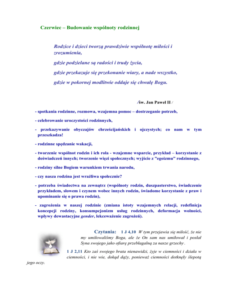 Czerwiec – Budowanie wspólnoty rodzinnej Rodzice i dzieci tworzą prawdziwie wspólnotę miłości i zrozumienia, gdzie podzielane są radości i trudy życia, gdzie przekazuje się przekonanie wiary, a nade wszystko, gdzie w pokornej modlitwie oddaje się chwałę Bogu. /św. Jan Paweł II / - spotkania rodzinne, rozmowa, wzajemna pomoc – dostrzeganie potrzeb, - celebrowanie uroczystości rodzinnych, - przekazywanie obyczajów chrześcijańskich i ojczystych; co nam w tym przeszkadza! - rodzinne spędzanie wakacji, - tworzenie wspólnot rodzin i ich rola - wzajemne wsparcie, przykład – korzystanie z doświadczeń innych; tworzenie więzi społecznych; wyjście z ”egoizmu” rodzinnego, - rodziny silne Bogiem warunkiem trwania narodu, - czy nasza rodzina jest wrażliwa społecznie? - potrzeba świadectwa na zewnątrz (wspólnoty rodzin, duszpasterstwo, świadczenie przykładem, słowem i czynem wobec innych rodzin, świadome korzystanie z praw i upominanie się o prawa rodzin), - zagrożenia w naszej rodzinie (zmiana istoty wzajemnych relacji, redefinicja koncepcji rodziny, konsumpcjonizm usług rodzinnych, deformacja wolności, wpływy dewastacyjne gender, lekceważenie zagrożeń). Czytania: 1 J 4,10 W tym przejawia się miłość, że nie my umiłowaliśmy Boga, ale że On sam nas umiłował i posłał Syna swojego jako ofiarę przebłagalną za nasze grzechy.. 1 J 2,11 Kto zaś swojego brata nienawidzi, żyje w ciemności i działa w ciemności, i nie wie, dokąd dąży, ponieważ ciemności dotknęły ślepotą jego oczy. Kol 3,14 Na to wszystko przyobleczcie miłość, która jest więzią doskonałości. Syr 3,17-20 Synu, w sposób łagodny prowadź swe sprawy, a każdy, kto jest prawy, będzie cię miłował. O ile wielki jesteś, o tyle się uniżaj, a znajdziesz łaskę u Pana. Wielka jest bowiem potęga Pana i przez pokornych bywa chwalony. 1 P 5,5-8 Tak samo wy, młodzieńcy, bądźcie poddani starszym! Wszyscy zaś wobec siebie wzajemnie przyobleczcie się w pokorę, Bóg bowiem pysznym się sprzeciwia, a pokornym łaskę daje. Upokórzcie się więc pod mocną ręką Boga, aby was wywyższył w stosownej chwili. Wszystkie troski wasze przerzućcie na Niego, gdyż Jemu zależy na was. 8 Bądźcie trzeźwi! Czuwajcie! 2206 Związki wewnątrz rodziny kształtują pokrewieństwo odczuć, uczuć i dążeń, które wypływają przede wszystkim z wzajemnego szacunku osób. Rodzina jest uprzywilejowaną wspólnotą, wezwaną do urzeczywistnienia” wspólnej wymiany myśli pomiędzy małżonkami oraz troskliwego współdziałania rodziców w wychowaniu dzieci”. (Sobór Watykański II, konst. Gaudium et spes, 52.) 2208 Rodzina powinna żyć w taki sposób, by jej członkowie otaczali troską i pomocą młodych i starych, osoby chore lub upośledzone oraz ubogich. Wiele rodzin w pewnych sytuacjach nie jest w stanie udzielać takiej pomocy. Wtedy inne osoby i rodziny oraz – w sposób pomocniczy – społeczeństwo powinny zatroszczyć się o ich potrzeby: „Religijność czysta i bez skazy wobec Boga i Ojca wyraża się w opiece nad sierotami i wdowami w ich utrapieniach i w zachowaniu siebie samego nieskalanym od wpływów świata” (Jk 1,27). Katechizm Kościoła Katolickiego, Pallottinum, Poznań 1994, s. 503 Wybrane fragmenty nauczania Prymasa KONIECZNOŚĆ OBECNOŚCI BOGA W RODZINIE „Rodzina jest Bogiem silna i musi być Bogiem silna. Jest jakaś niemalże biologiczna potrzeba, konieczność obecności Boga w rodzinie. Zważmy bowiem, Najmilsi, jak trudnym powołaniem jest rodzina. Nie każdego Bóg powołuje do życia rodzinnego, a tym, których powołuje, dwojgu rodzicom katolickim daje szczególną pomoc w sakramentalnej łasce stanu, ażeby zdołali wypełnić swoje tak trudne zadanie.” S. Wyszyński, Rodzina Bogiem silna. Kazanie Prymasa Polski ze szczytu Jasnej Góry, do wiernych z całej Polski podczas odnowienia Ślubów Narodu, w V roku Wielkiej Nowenny, Roku „Rodziny Bogiem silnej”, uroczystość Matki Bożej Jasnogórskiej, 26 VIII 1961, w: Stefan Kardynał Wyszyński Prymas Polski, Nauczanie o małżeństwie i rodzinie. Antologia tekstów 1925-1981, Instytut Papieża Jana Pawła II, Warszawa 2013, s. 333 *** „Aby zachować cel rodziny: wolę życia. Bóg jest niezbędny w rodzinie, z biologiczną niemal koniecznością, także dlatego, że Bóg życia budzi w nas wolę życia. Przez to sprawia, że rodzina przekazuje swoim potomkom życie z Niego wzięte. […] A wobec tego, wszystko co jest przeciwne przekazywaniu życia, co – że się tak wyrażę – tamuje przychodzące i rodzące się życie, to wszystko nie jest ludzkie, nie jest humanitarne ani humanistyczne. Jest z konieczności wrogie zdrowemu rozsądkowi i zdrowemu sensowi życia. […] Wszak do dziś byłoby nas już dużo więcej i wcześniej moglibyśmy się radować, gdyby nie zło, które zakorzeniło się w rodzinach naszych i które, niestety , zyskało nawet aprobatę prawa. Tak straszna jest kampania przeciwko rodzącemu się młodemu pokoleniu! Bóg to właśnie budzi wolę życia. Dlatego też, aby ona się utrzymała, niezbędna jest w rodzinie obecność Boga życia, która życie daje i obficie daje [ por. J 10, 10] […] Budzenie mocy i jedności narodu dokonuje się w rodzinie. Dlatego też rodzina musi być zjednoczona i Bogiem silna. Wtedy zagwarantuje byt, jedność i moc narodu. Słusznie więc Boga, który kładzie fundamenty pod rodzinę, zwie się Panem i Ojcem narodów. Jest więc On niezbędny i konieczny w rodzinie, aby rodzina była Bogiem silna. […] I jeszcze jeden argument, dlaczego Bóg jest konieczny w rodzinie. Bo rodzina urosła z postanowienia Bożego i Boża jest. Nie dzieci wybierają rodziców, tylko sam Bóg ich dobiera dzieciom. Rodzina z Boga pochodząca – matka, która z Boga i przez Boga poczyna, ojciec, który godność swą czerpie z Ojcostwa Bożego – muszą owoc życia swego oddać Bogu. Co jest Bożego – Bogu.” S. Wyszyński