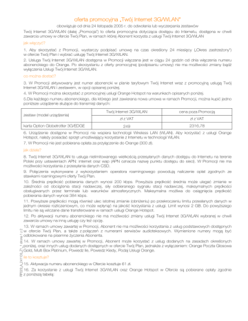 oferta promocyjna „Twój Internet 3G/WLAN" obowiązuje od dnia 24 listopada 2005 r. do odwołania lub wyczerpania zestawów Twój Internet 3G/WLAN (dalej „Promocja”) to oferta promocyjna dotycząca dostępu do Internetu, dostępna w chwili zawarcia umowy w ofercie Twój Plan, w ramach której Abonent korzysta z usługi Twój Internet 3G/WLAN jak włączyć? 1. Aby skorzystać z Promocji, wystarczy podpisać umowę na czas określony 24 miesięcy („Okres zastrzeżony") w ofercie Twój Plan i wybrać usługę Twój Internet 3G/WLAN. 2. Usługa Twój Internet 3G/WLAN dostępna w Promocji włączana jest w ciągu 24 godzin od dnia włączenia numeru abonenckiego do Orange. Po skorzystaniu z oferty promocyjnej (podpisaniu umowy) nie ma możliwości zmiany bądź wyłączenia Usługi Twój Internet 3G/WLAN. co można dostać? 3. W Promocji aktywowany jest numer abonencki w planie taryfowym Twój Internet wraz z promocyjną usługą Twój Internet 3G/WLAN i zestawem, w opcji opisanej poniżej. 4. W Promocji można skorzystać z promocyjnej usługi Orange Hotspot na warunkach opisanych poniżej. 5.Dla każdego numeru abonenckiego, dla którego jest zawierana nowa umowa w ramach Promocji, można kupić jedno poniższe urządzenie służące do transmisji danych: zestaw (model urządzenia) karta Option Globetrotter 3G/EDGE Twój Internet 3G/WLAN cena poza Promocją zł z VAT zł z VAT 249 2316,78 6. Urządzenie dostępne w Promocji nie wspiera technologii Wireless LAN (WLAN). Aby korzystać z usługi Orange Hotspot, należy posiadać sprzęt umożliwiający korzystanie z Internetu w technologii WLAN. 7. W Promocji nie jest pobierana opłata za przyłączenie do Orange (300 zł). RP029_A_241105_Z1_1 strona 1 z 2 jak działa? 8. Twój Internet 3G/WLAN to usługa nielimitowanego wielkością przesyłanych danych dostępu do Internetu na terenie Polski przy ustawieniach APN: internet oraz wap (APN oznacza nazwę punktu dostępu do sieci). W Promocji nie ma możliwości korzystania z przesyłania danych CSD. 9. Połączenia wykonywane z wykorzystaniem operatora roamingowego powodują naliczenie opłat zgodnych ze stawkami roamingowymi oferty Twój Plan. 10. Średnia prędkość pobierania danych wynosi 200 kbps. Powyższa prędkość średnia może ulegać zmianie w zależności od obciążenia stacji nadawczej, siły odbieranego sygnału stacji nadawczej, maksymalnych prędkości obsługiwanych przez terminale lub warunków atmosferycznych. Maksymalna możliwa do osiągnięcia prędkość pobierania danych wynosi 384 kbps. 11. Powyższe prędkości mogą również ulec istotnej zmianie (obniżeniu) po przekroczeniu limitu przesłanych danych w jednym okresie rozliczeniowym, co może wpłynąć na jakość korzystania z usługi. Limit wynosi 2 GB. Do powyższego limitu nie są wliczane dane transferowane w ramach usługi Orange Hotspot. 12. Po aktywacji numeru abonenckiego nie ma możliwości zmiany usługi Twój Internet 3G/WLAN wybranej w chwili zawarcia umowy na inną usługę czy też opcję. 13. W ramach umowy zawartej w Promocji, Abonent nie ma możliwości korzystania z usług podstawowych dostępnych w ofercie Twój Plan, a także z połączeń z numerami serwisów audioteksowych. Wymienione numery mogą być odblokowane na pisemne życzenia Abonenta. 14. W ramach umowy zawartej w Promocji, Abonent może korzystać z usług dodanych na zasadach określonych poniżej, oraz innych usług dodanych dostępnych w ofercie Twój Plan, jednakże z wyłączeniem: Orange Poczta Głosowa Gold, Multi Box Platinium, Powiedz Ile, Powiedz Kiedy, Podaj Usługi Orange. ile to kosztuje? 15. Aktywacja numeru abonenckiego w Ofercie kosztuje 61 zł. 16. Za korzystanie z usługi Twój Internet 3G/WLAN oraz Orange Hotspot w Ofercie są pobierane opłaty zgodnie z poniższą tabelą: Opcja usługi Twój Internet 3G/WLAN opłata miesięczna za Twój Internet opłata miesięczna za Orange Hotspot zł z VAT zł z VAT 120 Bez opłaty 17. Opłata miesięczna za usługę Twój Internet 3G/WLAN stanowi kwotę zobowiązania zgodnie z Ogólnymi warunkami świadczenia usług telekomunikacyjnych w ramach oferty Twój Plan i Twój Mix. 18. Za korzystanie z połączeń głosowych, SMS oraz MMS w Promocji pobierane są opłaty zgodne z poniższą tabelą: połączenie do wszystkich krajowych operatorów 1,50 zł/minuta SMS do wszystkich krajowych operatorów komórkowych (SMS standardowy) 0,20 zł/SMS MMS do wszystkich krajowych operatorów komórkowych 1,00 zł/MMS 19. Opłata za minutę połączenia w ramach usługi Wideo Rozmowa do Orange wynosi 3 zł (naliczanie sekundowe). RP029_A_241105_Z1_1 strona 2 z 2 dodatkowe informacje 20. Po upływie Okresu zastrzeżonego umowa przekształca się w umowę na czas nieokreślony. 21. PTK Centertel sp. z o.o. świadczy usługi transmisji danych w poszczególnych technologiach transmisji danych w zakresie istniejących możliwości technicznych. Orientacyjna mapa zasięgu poszczególnych technologii jest dostępna na stronie www.orange.pl/moc. Zasięg ma charakter informacyjny i nie może być podstawą do zawierania umowy o świadczenie usług telekomunikacyjnych. 22. W Okresie zastrzeżonym nie ma możliwości korzystania z innych promocji oraz usług promocyjnych, chyba że promocje te stanowią inaczej. 23. Po Okresie zastrzeżonym PTK Centertel sp. z o.o zastrzega sobie możliwość zmiany usługi Twój Internet 3G/WLAN na inną usługę podstawową w ofercie Twój Plan. 24. PTK Centertel sp. z o.o. nie ponosi odpowiedzialności za niekompatybilność oprogramowania zainstalowanego na komputerze Abonenta z oprogramowaniem dostarczanym lub udostępnianym przez producenta wraz z urządzeniem zakupionym w Promocji. 25. W pozostałym zakresie do Promocji stosuje się Regulamin promocyjnej usługi Orange Hotspot, Ogólne warunki świadczenia usług telekomunikacyjnych w ramach oferty Twój Plan i Twój Mix, Cennik usług w ofercie Twój Plan i Twój Mix oraz Regulamin świadczenia 