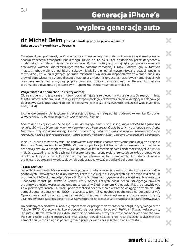 3.1 Generacja iPhone’a wypiera generację auto dr Michał Beim | [email protected], www.beim.pl Uniwersytet Przyrodniczy w Poznaniu Ostatnie dwie i pół dekady w Polsce to czas intensywnego wzrostu motoryzacji i systematycznego spadku znaczenia transportu publicznego. Dzieje się to na skutek hołdowania przez decydentów modernistycznym ideom miasta dla samochodu. Poziom motoryzacji w największych polskich miastach przekroczył wartości charakteryzujące miasta północno-zachodniej Europy. Podczas gdy w tamtych miastach obserwuje się od blisko dekady niewielki, ale jednak systematyczny spadek poziomu motoryzacji, to w największych polskich miastach trwa niczym niepohamowany wzrost. Niniejszy artykuł odpowiada na pytania dlaczego nastąpiła zmiana niekorzystnych zachowań komunikacyjnych oraz jaką lekcję można wyciągnąć przy tworzeniu polityk transportowych w Polsce. Rozważania o transporcie osadzone są w szerszym – społeczno–ekonomicznym kontekście. Wizja miasta dla samochodu a rzeczywistość Okres modernizmu jest czasem, który odcisnął największe piętno na kształcie współczesnych miast. Miasta Europy Zachodniej w dużo większym stopniu podlegały przekształceniom wynikającym z planowego dostosowywania przestrzeni do potrzeb masowej motoryzacji niż na skutek zniszczeń wojennych (por. Krier, 1984). Liczne dokumenty planistyczne i deklaracje polityczne najzgrabniej podsumowywał Le Corbusier w wydanej w 1935 roku książce La Ville radieuse. Pisał on: Miasto będzie częścią wsi. Będę żył 30 mil od mojego biura – pod sosną; moja sekretarka będzie żyła również 30 mil od biura, ale w innym kierunku – pod inną sosną. Oboje będziemy posiadać samochody. Będziemy zużywać nasze opony, ścierać nawierzchnię dróg oraz skrzynie biegów, konsumować ropę i benzynę. Każda z tych rzeczy będzie wymagać wielu nakładów pracy... ale one wystarczą dla wszystkich. Idee Le Corbusiera znalazły wielu naśladowców. Najbardziej charakterystyczną publikacją była książka Reichowa Autogerechte Stadt (1959). Wprawdzie publikacja Reichowa była – zarówno w stosunku do propozycji czołowych modernistów, jak i do praktyki lat sześćdziesiątych i siedemdziesiątych XX wieku – dość oszczędna w nakładach na infrastrukturę (np. propozycje przekształceń układu drogowego rzadko wskazywały na celowość budowy skrzyżowań wielopoziomowych), to jednak stanowiła praktyczny podręcznik wyznaczający, jak podporządkowywać urbanistykę drogownictwu. Teoria peak car Już od lat trzydziestych XX wieku w nauce podnoszona była kwestia granic wzrostu liczby samochodów osobowych. Rozważania te miały bardziej kształt dyskusji futurystycznych niż realnych wyliczeń lub prognoz. W 1963 roku zespół profesora Sir Colina Buchanana przygotował dla brytyjskiego Ministerstwa Transportu raport pt. Traffic in Towns, który oprócz licznych analiz stanu istniejącego zawierał prognozy odnośnie wzrostu poziomu motoryzacji w Zjednoczonym Królestwie. Raport przewidywał, że w pierwszych latach XXI wieku poziom motoryzacji przestanie wzrastać, osiągając poziom ok. 540 samochodów osobowych na 1000 mieszkańców (ok. 1,3 samochodu osobowego na gospodarstwo). Opracowanie podnosiło też kwestie kosztów masowej motoryzacji (m.in. środowiskowe i czasu), a także zawierało katalog zaleceń dotyczących ograniczania motoryzacji na obszarach zurbanizowanych. Do podobnych wniosków skłaniał się raport również przygotowany na zlecenie rządu brytyjskiego przez Tulpule (1973). Opracowanie, które odnosiło się pośrednio do pozycji Traffic in Towns, wskazywało, iż około 2010 roku w Wielkiej Brytanii zostanie odnotowany szczyt w liczbie posiadanych samochodów. Po tym czasie poziom motoryzacji miał zacząć powoli spadać, choć równocześnie wykorzystanie samochodu (liczba i długość podróży) miało przez pewien czas jeszcze powoli wzrastać. 39 Obserwacje brytyjskich uczonych potwierdzają dane statystyczne z ostatnich dwóch dekad (por. rys. 1). W pierwszych latach XXI wieku widać w miastach Europy Zachodniej spadek poziomu motoryzacjiprzy równoczesnym wzroście liczby posiadanych samochodów przez mieszkańców miast Europy ŚrodkowoWschodniej. Cechą charakterystyczną jest również fakt, że motoryzacja zarówno w polskich, jak i w wielu innych środkowoeuropejskich, największych miastach przekracza średnią krajową, podczas gdy w Niemczech, Francji, Holandii czy Wielkiej Brytanii wyższy od średniej krajowej poziom motoryzacji obserwowany jest na prowincji, gdzie oferta transportu publicznego jest mniej atrakcyjna. Rys. 1: Poziom motoryzacji w wybranych miastach (samochody osobowe na 1000 mieszkańców) Źródło: opracowanie własne na podstawie Eurostatu, DeStatis i GUS Należy podkreślić, że zjawisko peak car obserwowane jest nie tylko w Europie. Badania amerykańskie pokazują, iż w Stanach Zjednoczonych spada nie tylko poziom motoryzacji, ale również maleje pokonywany dystans, zarówno w przeliczeniu na samochód, jak i na osobę posiadającą prawo jazdy (Sivak, 2013). Poziom motoryzacji i pokonywany dystans wracają do wartości obserwowanych na początku lat dziewięćdziesiątych XX wieku. Motywy zmian zachowań komunikacyjnych Newman i Kenworthy (2011) stawiają tezę, że na zmniejszanie się poziomu motoryzacji ma wpływ szereg czynników, nie zawsze będących elementem świadomego działania w zakresie kształtowania polityki transportowej. Wśród tych czynników autorzy wymieniają (Newman, Kenworthy, 2011, s. 33): 1) osiągnięcie bariery Marchettiego odnośnie budżetu czasowego poświęcanego na dojazdy (por. Marchetti, 1994), 2) rozwój transportu publicznego, 3) reurbanizację jako proces odwracający skutki urban sprawl, 4) starzenie się społeczeństw (zmiany demograficzne), 5) wzrost popularności miejskiego stylu życia (kultury miejskości), 6) wzrost kosztów paliwa i posiadania samo