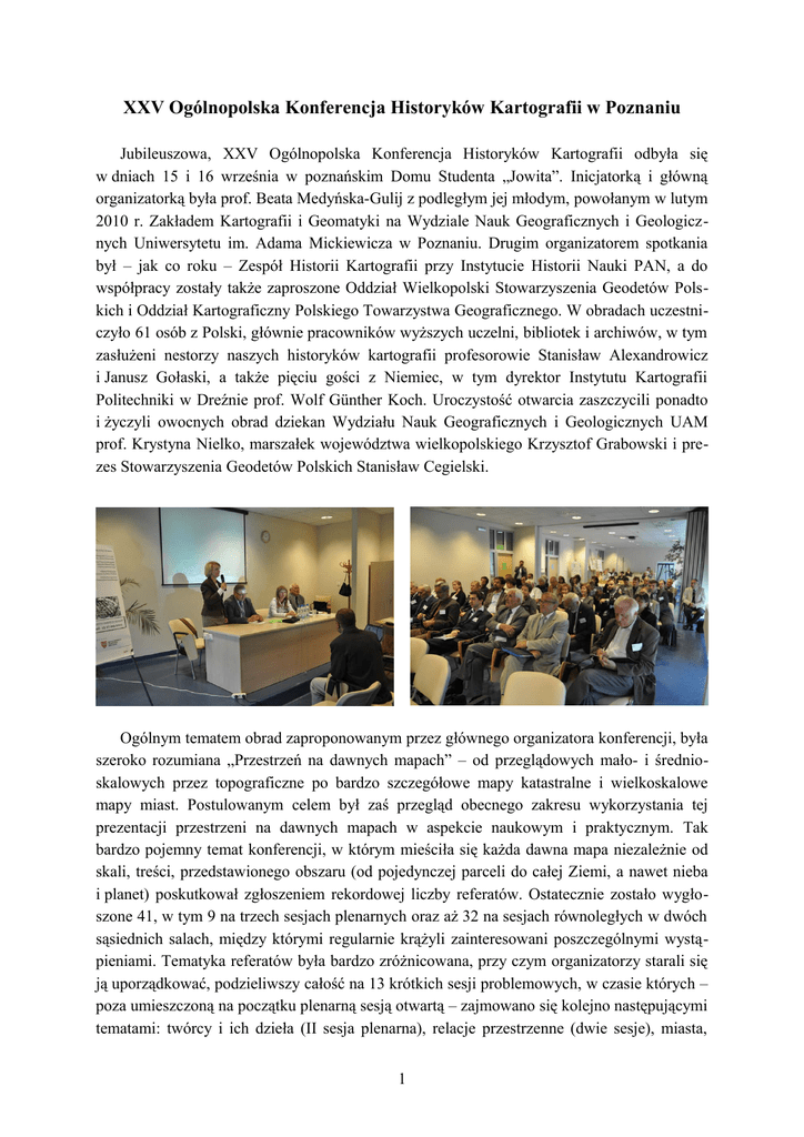 XXV Ogólnopolska Konferencja Historyków Kartografii w Poznaniu Jubileuszowa, XXV Ogólnopolska Konferencja Historyków Kartografii odbyła się w dniach 15 i 16 września w poznańskim Domu Studenta „Jowita”. Inicjatorką i główną organizatorką była prof. Beata Medyńska-Gulij z podległym jej młodym, powołanym w lutym 2010 r. Zakładem Kartografii i Geomatyki na Wydziale Nauk Geograficznych i Geologicznych Uniwersytetu im. Adama Mickiewicza w Poznaniu. Drugim organizatorem spotkania był – jak co roku – Zespół Historii Kartografii przy Instytucie Historii Nauki PAN, a do współpracy zostały także zaproszone Oddział Wielkopolski Stowarzyszenia Geodetów Polskich i Oddział Kartograficzny Polskiego Towarzystwa Geograficznego. W obradach uczestniczyło 61 osób z Polski, głównie pracowników wyższych uczelni, bibliotek i archiwów, w tym zasłużeni nestorzy naszych historyków kartografii profesorowie Stanisław Alexandrowicz i Janusz Gołaski, a także pięciu gości z Niemiec, w tym dyrektor Instytutu Kartografii Politechniki w Dreźnie prof. Wolf Günther Koch. Uroczystość otwarcia zaszczycili ponadto i życzyli owocnych obrad dziekan Wydziału Nauk Geograficznych i Geologicznych UAM prof. Krystyna Nielko, marszałek województwa wielkopolskiego Krzysztof Grabowski i prezes Stowarzyszenia Geodetów Polskich Stanisław Cegielski. Ogólnym tematem obrad zaproponowanym przez głównego organizatora konferencji, była szeroko rozumiana „Przestrzeń na dawnych mapach” – od przeglądowych mało- i średnioskalowych przez topograficzne po bardzo szczegółowe mapy katastralne i wielkoskalowe mapy miast. Postulowanym celem był zaś przegląd obecnego zakresu wykorzystania tej prezentacji przestrzeni na dawnych mapach w aspekcie naukowym i praktycznym. Tak bardzo pojemny temat konferencji, w którym mieściła się każda dawna mapa niezależnie od skali, treści, przedstawionego obszaru (od pojedynczej parceli do całej Ziemi, a nawet nieba i planet) poskutkował zgłoszeniem rekordowej liczby referatów. Ostatecznie zostało wygłoszone 41, w tym 9 na trzech sesjach plenarnych oraz aż 32 na sesjach równoległych w dwóch sąsiednich salach, między którymi regularnie krążyli zainteresowani poszczególnymi wystąpieniami. Tematyka referatów była bardzo zróżnicowana, przy czym organizatorzy starali się ją uporządkować, podzieliwszy całość na 13 krótkich sesji problemowych, w czasie których – poza umieszczoną na początku plenarną sesją otwartą – zajmowano się kolejno następującymi tematami: twórcy i ich dzieła (II sesja plenarna), relacje przestrzenne (dwie sesje), miasta, 1 mapy katastralne, użytkowanie ziemi, zmiany w środowisku (dwie sesje), przestrzeń geologiczna, kartografia regionów, mapy topograficzne, parcele oraz problemy konserwatorskie. Nie sposób w tej krótkiej relacji wymienić nawet tylko autorów i tytuły wszystkich referatów, ograniczmy się zatem do przytoczenia przykładów reprezentujących wymienione wyżej tematy. Tak więc w czasie pierwszej sesji plenarnej prof. Beata Medyńska-Gulij (UAM w Poznaniu) przypomniała znaną mapę A. Rizzi-Zannoniego Carte de la Pologne z 1772 r., uznając ją za pierwszą profesjonalną mapę generalną Polski, prof. Adam Linsenbarth (IGiK) przedstawił w skrócie ewolucję metod prezentacji na dawnych mapach biblijnych od XV do XIX wieku, prof. Wiesława Żyszkowska (Uniwersytet Wrocławski) poddała analizie bogatą treść mało znanej rękopiśmiennej mapy Departamentu Poznańskiego E. Raczyńskiego z lat 1807–1818, a dr Radosław Skrycki (Uniwersytet Szczeciński) pokazał i omówił przykłady map nieistniejących krain idealnych (na czele ze słynną Utopią) w kartografii XVI–XVIII wieku. Drugą sesję plenarną wypełniły wystąpienia gości zagranicznych. Thomas Horst (Uniwersytet Bundeswehry w Monachium) przypomniał postać Gerarda Merkatora i jego wielki atlas z 1595 roku, Steffi Mittenzwei (Biblioteka Państwowa w Berlinie) scharakteryzowała pierwszą jednolitą mapę Prus Fryderyka W.K. von Schmettaua z drugiej połowy XVIII wieku, a prof. Wolf G. Koch (Politechnika w Dreźnie) przedstawił dwie nieznane dotychczas mapy topograficzne fragmentów Saksonii z wczesnymi zastosowaniami metody kreskowej J.G. Lehmanna. W ramach dwóch sesji zatytułowanych „Relacje przestrzenne” dr Jarosław Łuczyński (Wyższa Szkoła Kultury społecznej i Medialnej w Toruniu) skomentował treść znanej mapy Wielkiego Księstwa Litewskiego, tzw. „radziwiłłowskiej” z 1613 roku ze szczególnym uwzględnieniem umieszczonych na niej łacińskich tekstów, dr Maria Jankowska (Uniwersytet Przyrodniczy w Poznaniu) przedstawiła wyniki analizy przestrzeni przyrodniczo-kulturowej wsi na pruskiej XIX-wiecznej mapie topograficznej w skali 1:25 000, Ewa Szynkiewicz (Uniwersytet Wrocławski) przeanalizowała i porównała obraz Ziemi Kłodzkiej na niemieckich mapach 1:25 000 i 1:100 000, dr Teresa Bogacz (Wyższa Szkoła Zarządzania „Edukacja” we Wrocławiu) mówiła o przestrzeni symbolicznej na dawnych mapach Śląska, 2 a Anna Osowska (Uniwersytet Wrocławski) o przestrzeni społeczno-gospodarczej ziem polskich w świetle kartografii okresu zaborów. Osobną sesję poświęcono mapom i planom miast, w czasie której Dorota Bartnik (Biblioteka Uniwersytetu Łódzkiego) zaprezentowała dawne plany Łodzi, a Dariusz Gierczak (Instytut Herdera w Marburgu) przedstawił założenia i stan prac nad ambitnym polskoniemieckim projektem edytorskim, jakim jest realizowany już Historyczno-topograficzny atlas miast śląskich. Również głównie planów miast dotyczył wygłoszony w ramach sesji „Mapy katastralne” (!) referat dr Beaty Konopskiej (IGiK) o zniekształceniach obrazu przestrzeni na polskich mapach do użytku ogólnego, wydawanych po drugiej wojnie światowej. Pierwszy raz na konferencjach historyków kartografii dużo czasu poświęcono kartografii wielkoska