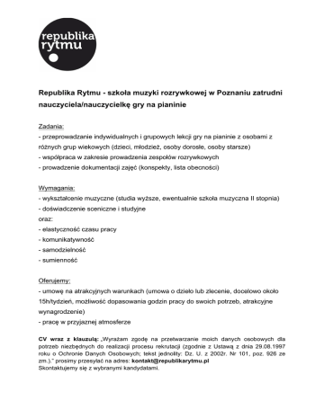 Republika Rytmu - szkoła muzyki rozrywkowej w Poznaniu zatrudni nauczyciela/nauczycielkę gry na pianinie Zadania: - przeprowadzanie indywidualnych i grupowych lekcji gry na pianinie z osobami z różnych grup wiekowych (dzieci, młodzież, osoby dorosłe, osoby starsze) - współpraca w zakresie prowadzenia zespołów rozrywkowych - prowadzenie dokumentacji zajęć (konspekty, lista obecności) Wymagania: - wykształcenie muzyczne (studia wyższe, ewentualnie szkoła muzyczna II stopnia) - doświadczenie sceniczne i studyjne oraz: - elastyczność czasu pracy - komunikatywność - samodzielność - sumienność Oferujemy: - umowę na atrakcyjnych warunkach (umowa o dzieło lub zlecenie, docelowo około 15h/tydzień, możliwość dopasowania godzin pracy do swoich potrzeb, atrakcyjne wynagrodzenie) - pracę w przyjaznej atmosferze CV wraz z klauzulą: „Wyrażam zgodę na przetwarzanie moich danych osobowych dla potrzeb niezbędnych do realizacji procesu rekrutacji (zgodnie z Ustawą z dnia 29.08.1997 roku o Ochronie Danych Osobowych; tekst jednolity: Dz. U. z 2002r. Nr 101, poz. 926 ze zm.).” prosimy przesyłać na adres: [email protected] Skontaktujemy się z wybranymi kandydatami.