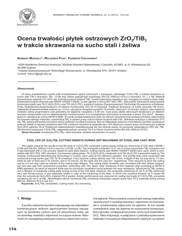 MATERIA£Y CERAMICZNE /CERAMIC MATERIALS/, 65, 2, (2013), 156-162 www.ptcer.pl/mccm Ocena trwaáoĞci páytek ostrzowych ZrO2/TiB2 w trakcie skrawania na sucho stali i Īeliwa NORBERT MOSKAàA1*, WALDEMAR PYDA1, KAZIMIERZ CZECHOWSKI2 AGH Akademia Górniczo-Hutnicza, Wydziaá InĪynierii Materiaáowej i Ceramiki, KCiMO, al. A. Mickiewicza 30, 30-059 Kraków 2 Instytut Zaawansowanych Technologii Wytwarzania, ul. Wrocáawska 37A, 30-011 Kraków *e-mail: [email protected] 1 Streszczenie W pracy przedstawiono wyniki prób trwaáoĞciowych páytek ostrzowych z kompozytu ziarnistego Y-ZrO2/TiB2 w trakcie skrawania na sucho stali C45 o twardoĞci 165 r 6 HB oraz Īeliwa specjalnego stopowego EN-GJL-XNiCuCr15-6-2 o twardoĞci 121 r 2 HB. Materiaá kompozytowy zawieraá (12–37)% obj. submikronowych wtrąceĔ TiB2 i zostaá wytworzony metodą in situ, bazującą na reakcji w fazie staáej. Zastosowano páytki ostrzowe typu SNGN 120408 T 02020, co jest zgodne z normą ISO 1832.1991. Jako próbki odniesienia wykorzystano komercyjne páytki typu TA-Z (Al2O3/ZrO2) oraz TW (Al2O3/TiC), produkcji Instytutu Zaawansowanych Technologii Wytwarzania w Krakowie. Próby trwaáoĞciowe przeprowadzono na tokarce numerycznej TZC-32 N Uniwersal. PrĊdkoĞü skrawania na sucho wynosiáa 150 m/min. GáĊbokoĞü skrawania zostaáa ustalona na 1,0 mm, zaĞ posuw narzĊdzia wynosiá 0,15 mm/obr. (stal) lub 0,10 mm/obr. (Īeliwo). Jako kryterium trwaáoĞci ostrza przyjmowano czas potrzebny do stĊpienia narzĊdzia o 0,30 mm. Czas pracy páytek ostrzowych korelowano ze skáadem fazowym kompozytów oraz ich wáaĞciwoĞciami mechanicznymi, a w szczególnoĞci opornoĞcią na Ğcieranie w teĞcie „Dry Sand”, nawiązującym w metodyce do normy ASTM G 6585. W wyniku przeprowadzonych prób nie wykryto monotonicznej korelacji pomiĊdzy odpornoĞcią na Ğcieranie danego materiaáu i zawartoĞcią TiB2 a czasem pracy noĪa w trakcie toczenia stali C45. JednakĪe kompozyt o zawartoĞci 37% obj. TiB2 wykazywaá bardzo korzystne cechy uĪytkowe w próbach toczenia. Byáo to najbardziej widoczne w kontekĞcie wyników uzyskanych podczas badaĔ w zakresie skrawania stali C45, w których ceramika ta wykazaáa siĊ o 16% dáuĪszym czasem pracy niĪ komercyjny materiaá Al2O3/ZrO2 gatunku TA-Z. Podobnymi wáaĞciwoĞciami charakteryzowaá siĊ nóĪ tokarski oparty na tworzywie zawierającym 20% obj. TiB2. Wymienione kompozyty Y-ZrO2/TiB2 ustĊpowaáy jednak ceramice TA-Z w trakcie toczenia Īeliwa EN-GJL-XNiCuCr15-6-2. Sáowa kluczowe: kompozyty ZrO2/TiB2, noĪe tokarskie, obróbka skrawaniem na sucho TOOL LIFE OF ZrO2/TiB2 CUTTING INSERTS DURING DRY MACHINING OF STEEL AND CAST IRON This paper presents the results of tool life tests of Y-ZrO2/TiB2 composite cutting inserts during dry machining of C45 steel (165HB r 6 HB) and EN-GJL-XNiCuCr15-6-2 cast iron (121HB r2 HB). The composite contained 12-37 vol.% of sub-micrometric TiB2 inclusions and it was fabricated with in situ process, based on solid state reaction. Cutting inserts type SNGN 120408 T 02020 were used, which is compatible with ISO 1832.1991 standard. Commercial cutting plates, TA-Z (Al2O3/ZrO2 composite) and TW (Al2O3/TiC composite) made by The Institute of Advanced Manufacturing Technology in Cracow, were used as the reference samples. The tool life tests were conducted with numerical turning centre type TZC-32 N Uniwersal. A dry machine cutting velocity was 150 m/min. A depth of the cut was set to 1.0 mm, while its rate of feed was 0.15 mm/rev. and 0.10 mm/rev. for the steel and the cast iron respectively. Time required to blunt the cutting tool by 0.3 mm was used as criterion of the cutting edge lifespan. The cutting plates durability was correlated with their phase composition and also with their mechanical properties, particularly with “Dry Sand” wear resistance of the materials (test according to ASTM G 6585 standard). As result of research there was no monotonic correlation found between the wear resistance, inÀuenced by TiB2 content, and a lifespan of composite cutting plate during turning of the C45 steel. However, the composite containing 37 vol.% of TiB2 performed very well during turning. It was especially visible in case of dry machining of the steel, in which that ceramics showed 16 % longer life than the commercial Al2O3/ZrO2 material (TA-Z grade). Similar performance was observed for cutting tool made of Y-ZrO2/TiB2 composite containing 20 vol.% of TiB2. Nevertheless above mentioned TiB2 containing composites played worse than TA-Z materials during turning EN-GJL-XNiCuCr15-6-2 cast iron. Keywords: ZrO2/TiB2 composites, Cutting insert, Dry machining 1. WstĊp Z punktu widzenia inĪyniera zajmującego siĊ materiaáami konstrukcyjnymi istotnym ograniczeniem tworzyw bazujących na dwutlenku cyrkonu jest ich stosunkowo niska, jak na ceramikĊ, twardoĞü i odpornoĞü na zuĪycie Ğcierne. Natomiast ich niewątpliwą zaletą jest znaczna odpornoĞü na kru- 156 che pĊkanie. RównoczeĞnie znanych jest szereg materiaáów ceramicznych o wysokiej twardoĞci i odpornoĞci na Ğcieranie, ale o umiarkowanej odpornoĞci na pĊkanie. W tym Ğwietle uzasadnione staje siĊ dąĪenie do wytworzenia kompozytu, który áączyáby i potĊgowaá korzystne cechy tych materiaáów i ZrO2. Taka motywacja, w poáączeniu z potrzebą wytworzenia materiaáu o korzystnych wáaĞciwoĞciach cieplnych czy bardzo OCENA TRWAàOĝCI PàYTEK OSTRZOWYCH ZrO2/TiB2 W TRAKCIE SKRAWANIA NA SUCHO STALI I ĩELIWA dobrych wáaĞciwoĞciach mechanicznych w podwyĪszonych temperaturach, doprowadziáa na przestrzeni ostatnich kilku dekad do powstania szerokiej grupy tworzyw wielofazowych skáadających siĊ z tetragonalnego ZrO2 oraz takich związków jak wĊgliki krzemu, wolframu, chromu, tytanu czy teĪ tlenki chromu lub glinu lub azotek tytanu [1–8]. Przy czym tetragonalny dwutlenek cyrkonu peániá funkcjĊ osnowy, a fazy mniejszoĞciowe wystĊpowaáy w postaci ziaren o zróĪni