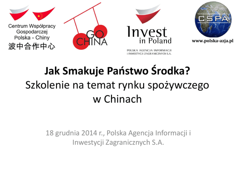 Jak Smakuje Państwo Środka? Szkolenie na temat rynku spożywczego w Chinach 18 grudnia 2014 r., Polska Agencja Informacji i Inwestycji Zagranicznych S.A. Panel I: Szanse i wyzwania dla branży spożywczej na rynku chińskim - Jan Śmigiel, dyrektor ds. eksportu, Food Care - Wartość konsumpcji i branży spożywczej ok. 1 biliard USD - 45,6% wydatków konsumentów to wydatki na produkty spożywcze (głównie podstawowe) - znaczny wzrost sprzedaży żywności dla dzieci - głównie spożywane są produkty zbożowe - bardzo zróżnicowana konsumpcja w zależności od regionu - konsumenci chińscy zwracają dużą uwagę na jakość - główne polskie produkty eksportowane do Chin to wieprzowina, drób i produkty mleczarskie oraz słodycze - popyt na produkty europejskie sukcesywnie rośnie (alkohol) - szybko zmieniające się nawyki żywieniowe - lepsza koncentracja na mniejszym niż większym obszarze - trzeba tworzyć świadomość marki - duża samowola urzędników w interpretacji prawa Panel I: Szanse i wyzwania dla branży spożywczej na rynku chińskim - Andrzej Juchniewicz, Dyrektor Oddziału PAIiIZ w Szanghaju - 301 polskich przedsiębiorców na liście eksporterów - Wejście punktowe, regionalne jest najskuteczniejsze - skandale żywnościowe przyczyniły się do wzrostu importu - produkty dla klasy średniej i bogatych Chińczyków - potencjalni konsumenci: dzieci, młodzi ludzie, starsze osoby - w ostatnich latach w Szanghaju znacznie wzrasta sprzedaż produktów importowanych (produkty mleczne 53%) - należy znaleźć ten polski produkt (markę narodową) - sklepy nastawione stricte na żywność z importu - brak myślenia zawczasu o ochronie własności intelektualnej - zasada regionalizacji przy rejestracji znaków towarowych - porozumienie madryckie ma wpływ na rejestrację - nowe prawo od 1 maja, kara za naruszenie znacznie wzrosła - handel znakami towarowymi - rejestracja – 9-12 miesięcy (ok. 5 tys. złotych) - znaki regionalne, znaczenie etykiet - dynamiczny rozwój e-commerce Panel II: Eksport produktów spożywczych do Chin wprowadzenie towaru na rynek - Michał Korol, prezes Korol Eksport – „Jak przekonać Chińczyków?” - Polska nie ma w Chinach marki naturalnych owoców i warzyw - Stawianie na zdrową, naturalną żywność, na którą jest popyt w Chinach - Dostosowywanie się do potrzeb partnera - „Pierwszy kontener” jest najistotniejszy - Liczy się wytrwałość i zrozumienie kontrahenta - Bezpośredni kontakt i elastyczność - Jan Śmigiel, dyrektor ds. eksportu, Food Care - Transport kolejowy jest najtańszy po morskim. Na razie jednak jego koszty z Polski do Chin są trzykrotnie większe niż eksportowanie drogą morską Panel II: Eksport produktów spożywczych do Chin wprowadzenie towaru na rynek - Bartosz Ziółek, prezes AmberFoods International - Kompetencja w marketingu i promowanie marki - Rozeznanie czego np. nie może zawierać produkt - Dobrze mieć zespoły i na miejscu, i w Polsce - Zwracanie uwagę na proces negocjacji, który jest bardzo istotny w Chinach - Wizja, zasoby i cierpliwość kluczem do sukcesu - Połączenie kolejowe Łódź-Chengdu daje nowe możliwości i prawdopodobnie będzie tanieć - Dostosowywanie eksportu do problemów i potrzeb na miejscu - Antoni Roszczuk, członek zarządu Europa Corp Ltd – „Nisze i perspektywy” - Problem z brakiem unikalnego polskiego produktu - Trzeba mieć albo duże środki, albo dobry pomysł na sprzedaż - Opłaca się zaskoczyć Chińczyków sposobem sprzedaży – marketingiem - Złe podejście przedsiębiorców, którzy nie planują inwestować, wchodząc na rynek - Usługi są niezagospodarowaną niszą, np. małe lokale z polskimi produktami przetworzonymi - Owoce i warzywa nie są tak atrakcyjne jak przetworzone produkty Panel II: Eksport produktów spożywczych do Chin wprowadzenie towaru na rynek - Andrzej Juchniewicz, Dyrektor Oddziału PAIiIZ w Szanghaju - Promowanie kanału e-commerce jako szansa na wejście na chiński rynek - Ważne jest to, czym będzie kolejny priorytet w nowym 5-letnim planie gospodarczym, który rozpocznie się w 2015 roku - Strefy wolnocłowe promują sprzedaż kanałami e-commerce - Internet w Chinach różni się od tego na Zachodzie i trzeba to wziąć pod uwagę przy promowaniu produktu