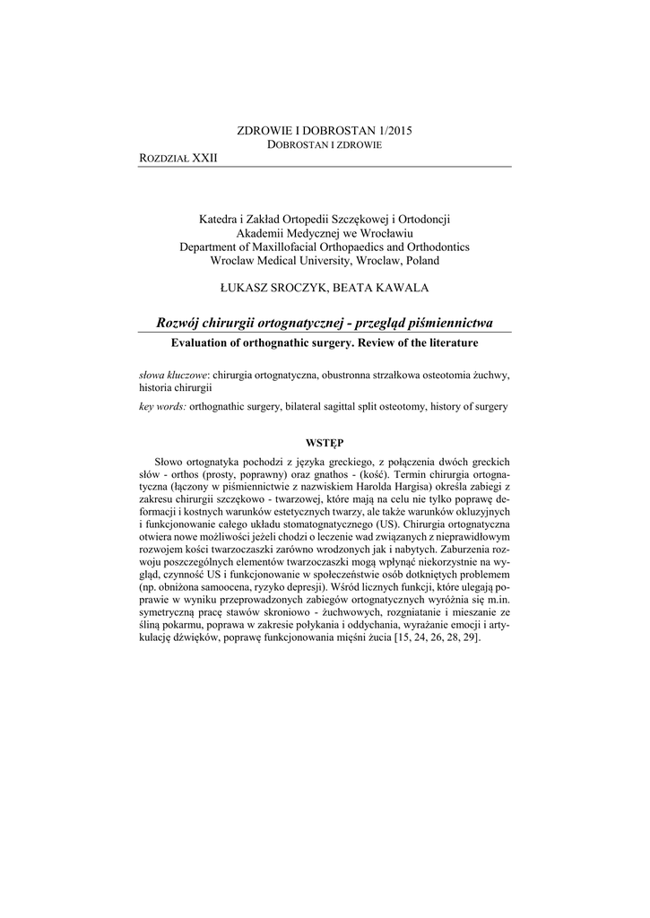 ZDROWIE I DOBROSTAN 1/2015 DOBROSTAN I ZDROWIE ROZDZIAŁ XXII Katedra i Zakład Ortopedii Szczękowej i Ortodoncji Akademii Medycznej we Wrocławiu Department of Maxillofacial Orthopaedics and Orthodontics Wroclaw Medical University, Wroclaw, Poland ŁUKASZ SROCZYK, BEATA KAWALA Rozwój chirurgii ortognatycznej - przegląd piśmiennictwa Evaluation of orthognathic surgery. Review of the literature słowa kluczowe: chirurgia ortognatyczna, obustronna strzałkowa osteotomia żuchwy, historia chirurgii key words: orthognathic surgery, bilateral sagittal split osteotomy, history of surgery WSTĘP Słowo ortognatyka pochodzi z języka greckiego, z połączenia dwóch greckich słów - orthos (prosty, poprawny) oraz gnathos - (kość). Termin chirurgia ortognatyczna (łączony w piśmiennictwie z nazwiskiem Harolda Hargisa) określa zabiegi z zakresu chirurgii szczękowo - twarzowej, które mają na celu nie tylko poprawę deformacji i kostnych warunków estetycznych twarzy, ale także warunków okluzyjnych i funkcjonowanie całego układu stomatognatycznego (US). Chirurgia ortognatyczna otwiera nowe możliwości jeżeli chodzi o leczenie wad związanych z nieprawidłowym rozwojem kości twarzoczaszki zarówno wrodzonych jak i nabytych. Zaburzenia rozwoju poszczególnych elementów twarzoczaszki mogą wpłynąć niekorzystnie na wygląd, czynność US i funkcjonowanie w społeczeństwie osób dotkniętych problemem (np. obniżona samoocena, ryzyko depresji). Wśród licznych funkcji, które ulegają poprawie w wyniku przeprowadzonych zabiegów ortognatycznych wyróżnia się m.in. symetryczną pracę stawów skroniowo - żuchwowych, rozgniatanie i mieszanie ze śliną pokarmu, poprawa w zakresie połykania i oddychania, wyrażanie emocji i artykulację dźwięków, poprawę funkcjonowania mięśni żucia [15, 24, 26, 28, 29]. ZDROWIE I DOBROSTAN 1/2015 Dobrostan i zdrowie Obecnie wśród zabiegów z zakresu chirurgii ortognatycznej najczęściej wykonywanymi są: osteotomia szczęki, osteotomia żuchwy, zabiegi dwuszczękowe - bimaxilarne, genioplastyka, chirurgiczne rozerwanie szwu podniebiennego oraz zabiegi dystrakcyjne. Obserwuje się również, że w przypadku dzieci i młodzieży skuteczny efekt leczniczy osiąga się z wykorzystaniem aparatów ortodontycznych, zarówno stałych jak i ruchomych. Prawdopodobnie od samych początków ludzkość zwracała uwagę na piękno i harmonię twarzy. Już w starożytnym Egipcie próbowano definiować kanony piękna i podejmowano próby korekty widocznych niedoskonałości, jednak ze względu na brak możliwości terapeutycznych, jak na ówczesne czasy, zakres działań korekcyjnych był ograniczony. Nową erę w medycynie zabiegowej otworzyło odkrycie w XIX w znieczulenia ogólnego (1846r. - William T.G. Morton - doniesienie o skutecznym znieczuleniu eterem), które pozwoliło na przeprowadzenie pierwszych zabiegów ortognatycznych. W tamtym okresie do korekty zniekształceń twarzy nierzadko wykorzystywano techniki opierające się na dostępach do guzów w środkowej części twarzoczaszki [20]. Pierwsze opisane doniesienia dotyczące zabiegów z zakresu ortognatyki pochodzą z połowy XIX wieku z Wheeling w Zachodniej Virginii (USA), gdzie w 1849 roku Simon P. Hullihen przeprowadził, jeszcze bez znieczulenia ogólnego, zabieg korekcyjny deformacji w obrębie przedniej części żuchwy spowodowany rozległymi, ściągającymi bliznami [11]. Następne doniesienia pojawiają się dopiero po około 50 latach (1906 - 1907r.), kiedy to ortodonta z Saint Louis (USA) Edward Angle w zespole razem z chirurgiem Vilray’m Blaire przeprowadzili zewnątrzustną poziomą osteotomię gałęzi żuchwy - zabieg repozycyjny u pacjenta z progenią, wykorzystując do repozycji szynę i bandaże do ustalenia odłamów po osteotomii [1,2,3]. W tym samym czasie w Europie podejmowane są próby zabiegów ortognatycznych na bazie dokonań opisywanych w amerykańskim piśmiennictwie, czasami w niewielkim stopniu modyfikowane. Wśród nazwisk pionierów - operatorów pojawiają się m.in. nazwiska: Bruhn i Lindemann [22, 23]. Berger (w 1897r.) podejmuje próbę korekty prognatyzmu żuchwy w zabiegu osteotomii w okolicy kłykcia. Pierwsza połowa XX wieku to w Europie czas działań wojennych i cała praca chirurgów kierowana jest na zabiegi z zakresu traumatologii. Mimo wszystko rozwój traumatologii powoduje mimowolnie rozwój technik operacyjnych w obrębie twarzoczaszki. W latach dwudziestych (1927r. i 1928r.) XX wieku w Niemczech pojawiają się opisy procedur chirurgicznych leczenia deformacji twarzoczaszki sygnowane nazwiskami Martina Wassmunda i Georga Axhausena. Jako powszechna akceptowana forma mobilizacji szczęki w zabiegach korekcyjnych wymieniana jest osteotomia Le Fort I [10, 23]. Rozwojowi technik operacyjnych towarzyszą coraz nowsze metody stabilizacji pozabiegowej. Obserwuje się, że ustabilizowane po repozycji złamania goją się szybciej niż w przypadku braku takiej stabilizacji. W ortognatyce są podejmowane próby ze szwami z drutu ligaturowego łączącymi odłamy kostne, indywidualnymi metalowymi szynami cementowanymi na zębach, wiązaniami ligaturowymi międzyszczękowymi. Współcześnie w zabiegach ortognatycznych wykorzystuje się aparaty stałe i wyciągi elastyczne oraz minipłytki do osteosyntezy stworzone przez 300 Łukasz Sroczyk, Beata Kawala Rozwój chirurgii ortognatycznej - przegląd piśmiennictwa Micheleta, Festala i Peri’ego w latach 1972 - 1973, a udoskonalone później przez Luhra w 1979r. [17]. Korzystnie wpływają one na stabilne utrzymanie blisko siebie odłamów kości co przyspiesza proces gojenia, umożliwia szybszą rehabilitację czynnościową, skrócenie czasu hospitalizacji i obniżenie kosztów leczenia [21]. Miedzy innymi dzięki wprowadzeniu zasad aseptyki i antybiotykoterapii możliwe stało się zastosowanie płytek i śrub do osteosytezy mocowanych bezpośrednio do kości [2]. Pojawiają się coraz liczn