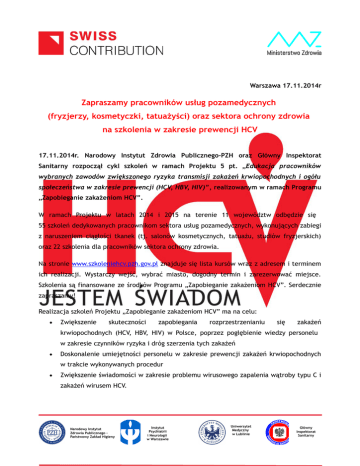 Warszawa 17.11.2014r Zapraszamy pracowników usług pozamedycznych (fryzjerzy, kosmetyczki, tatuażyści) oraz sektora ochrony zdrowia na szkolenia w zakresie prewencji HCV 17.11.2014r. Narodowy Instytut Zdrowia Publicznego–PZH oraz Główny Inspektorat Sanitarny rozpoczął cykl szkoleń w ramach Projektu 5 pt. „Edukacja pracowników wybranych zawodów zwiększonego ryzyka transmisji zakażeń krwiopochodnych i ogółu społeczeństwa w zakresie prewencji (HCV, HBV, HIV)”, realizowanym w ramach Programu „Zapobieganie zakażeniom HCV”. W ramach Projektu w latach 2014 i 2015 na terenie 11 województw odbędzie się 55 szkoleń dedykowanych pracownikom sektora usług pozamedycznych, wykonujących zabiegi z naruszeniem ciągłości tkanek (tj. salonów kosmetycznych, tatuażu, studiów fryzjerskich) oraz 22 szkolenia dla pracowników sektora ochrony zdrowia. Na stronie www.szkoleniehcv.pzh.gov.pl znajduje się lista kursów wraz z adresem i terminem ich realizacji. Wystarczy wejść, wybrać miasto, dogodny termin i zarezerwować miejsce. Szkolenia są finansowane ze środków Programu „Zapobieganie zakażeniom HCV”. Serdecznie zapraszamy! Realizacja szkoleń Projektu „Zapobieganie zakażeniom HCV” ma na celu: Zwiększenie skuteczności zapobiegania rozprzestrzenianiu się zakażeń krwiopochodnych (HCV, HBV, HIV) w Polsce, poprzez pogłębienie wiedzy personelu w zakresie czynników ryzyka i dróg szerzenia tych zakażeń Doskonalenie umiejętności personelu w zakresie prewencji zakażeń krwiopochodnych w trakcie wykonywanych procedur Zwiększenie świadomości w zakresie problemu wirusowego zapalenia wątroby typu C i zakażeń wirusem HCV. Narodowy Instytut Zdrowia Publicznego – Państwowy Zakład Higieny Instytut Psychiatrii i Neurologii w Warszawie Uniwersytet Medyczny w Lublinie Główny Inspektorat Sanitarny Na stronie www.hcv.pzh.gov.pl dostępny będzie również http://www.hcv.pzh.gov.pl/Page/platforma-e-learningowa-1, program gdzie będą e-learningowy umieszczane i aktualizowane materiały edukacyjno-szkoleniowe. Dzięki e-learningowi każdy zainteresowany będzie mógł nie tylko zdobyć potrzebną wiedzę o HCV, niezbędną do bezpiecznego wykonywania codziennych czynności w pracy, ale także przejść test i otrzymać certyfikat. Zaś lekarze i pielęgniarki będą mieli możliwość otrzymania punktów edukacyjnych. O HCV: Na świecie Wirusowe zapalenie wątroby jest czwartą chorobą uznaną przez WHO (obok malarii, gruźlicy i HIV/AIDS), jako ta, która wymaga najwięcej uwagi i podejmowania działań edukacyjnych, mających na celu jak najszybsze podniesienia świadomości zdrowotnej społeczeństw. Ta cicha epidemia zbiera takie samo żniwo jak HIV/AIDS… W Polsce Prowadzony od 2012 r. ogólnopolski Program „Zapobieganie zakażeniom HCV” jest pierwszym, kompleksowym programem, opracowanym w celu zwiększenia efektywności zwalczania zakażeń HCV w Polsce. Składa się z pięciu, powiązanych ze sobą projektów, i zakończy się w 2016 r. Programu „Zapobieganie zakażeniom HCV’ (wirusowe zapalenie wątroby typu C), współfinansowany jest przez Szwajcarię w ramach szwajcarskiego programu współpracy z nowymi krajami członkowskimi Unii Europejskiej oraz Ministra Zdrowia, a koordynowany przez Narodowy Instytut Zdrowia Publicznego-PZH. Ważne informacje Często chorzy dowiadują się zbyt późno o tym, że są zakażeni HCV – zazwyczaj dopiero, gdy diagnozuje się marskość wątroby lub nowotwór, a jedynym ratunkiem jest przeszczep. Jest to często wynikiem niespecyficznych objawów choroby oraz wieloletnim okresem zakażenia bezobjawowego. Zdarzają się także przypadki ostrych natychmiastowych objawów, ale jest ich zdecydowanie mniej. Im wcześniej się zdiagnozuje HCV tym lepiej. WZW C można leczyć – dzięki temu nie musimy czekać do ostatecznej fazy, czyli do marskości wątroby, czy nowotworu. Narodowy Instytut Zdrowia Publicznego – Państwowy Zakład Higieny Instytut Psychiatrii i Neurologii w Warszawie Uniwersytet Medyczny w Lublinie Główny Inspektorat Sanitarny Niestety przeciwko HCV nie ma szczepionki! Wiedza o HCV i świadome zachowania pozwalają zmniejszyć ryzyko zakażenia oraz jak najwcześniej zareagować na objawy, które mogą świadczy o zakażeniu HCV. Kontakt dla mediów: Monika Wróbel-Harmas e-mail: [email protected] Tel. (22) 54 21 288 Narodowy Instytut Zdrowia Publicznego-PZH ul. Chocimska 24 00-791 Warszawa KONTAKT Projekt 5: Zespół Projektu 5 [email protected] Narodowy Instytut Zdrowia Publicznego – Państwowy Zakład Higieny Instytut Psychiatrii i Neurologii w Warszawie Uniwersytet Medyczny w Lublinie Główny Inspektorat Sanitarny
