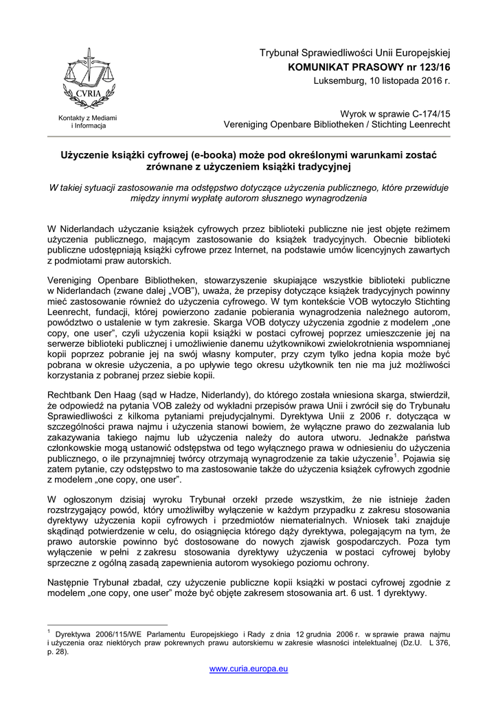 Trybunał Sprawiedliwości Unii Europejskiej KOMUNIKAT PRASOWY nr 123/16 Luksemburg, 10 listopada 2016 r. Kontakty z Mediami i Informacja Wyrok w sprawie C-174/15 Vereniging Openbare Bibliotheken / Stichting Leenrecht Użyczenie książki cyfrowej (e-booka) może pod określonymi warunkami zostać zrównane z użyczeniem książki tradycyjnej W takiej sytuacji zastosowanie ma odstępstwo dotyczące użyczenia publicznego, które przewiduje między innymi wypłatę autorom słusznego wynagrodzenia W Niderlandach użyczanie książek cyfrowych przez biblioteki publiczne nie jest objęte reżimem użyczenia publicznego, mającym zastosowanie do książek tradycyjnych. Obecnie biblioteki publiczne udostępniają książki cyfrowe przez Internet, na podstawie umów licencyjnych zawartych z podmiotami praw autorskich. Vereniging Openbare Bibliotheken, stowarzyszenie skupiające wszystkie biblioteki publiczne w Niderlandach (zwane dalej „VOB”), uważa, że przepisy dotyczące książek tradycyjnych powinny mieć zastosowanie również do użyczenia cyfrowego. W tym kontekście VOB wytoczyło Stichting Leenrecht, fundacji, której powierzono zadanie pobierania wynagrodzenia należnego autorom, powództwo o ustalenie w tym zakresie. Skarga VOB dotyczy użyczenia zgodnie z modelem „one copy, one user”, czyli użyczenia kopii książki w postaci cyfrowej poprzez umieszczenie jej na serwerze biblioteki publicznej i umożliwienie danemu użytkownikowi zwielokrotnienia wspomnianej kopii poprzez pobranie jej na swój własny komputer, przy czym tylko jedna kopia może być pobrana w okresie użyczenia, a po upływie tego okresu użytkownik ten nie ma już możliwości korzystania z pobranej przez siebie kopii. Rechtbank Den Haag (sąd w Hadze, Niderlandy), do którego została wniesiona skarga, stwierdził, że odpowiedź na pytania VOB zależy od wykładni przepisów prawa Unii i zwrócił się do Trybunału Sprawiedliwości z kilkoma pytaniami prejudycjalnymi. Dyrektywa Unii z 2006 r. dotycząca w szczególności prawa najmu i użyczenia stanowi bowiem, że wyłączne prawo do zezwalania lub zakazywania takiego najmu lub użyczenia należy do autora utworu. Jednakże państwa członkowskie mogą ustanowić odstępstwa od tego wyłącznego prawa w odniesieniu do użyczenia publicznego, o ile przynajmniej twórcy otrzymają wynagrodzenie za takie użyczenie 1. Pojawia się zatem pytanie, czy odstępstwo to ma zastosowanie także do użyczenia książek cyfrowych zgodnie z modelem „one copy, one user”. W ogłoszonym dzisiaj wyroku Trybunał orzekł przede wszystkim, że nie istnieje żaden rozstrzygający powód, który umożliwiłby wyłączenie w każdym przypadku z zakresu stosowania dyrektywy użyczenia kopii cyfrowych i przedmiotów niematerialnych. Wniosek taki znajduje skądinąd potwierdzenie w celu, do osiągnięcia którego dąży dyrektywa, polegającym na tym, że prawo autorskie powinno być dostosowane do nowych zjawisk gospodarczych. Poza tym wyłączenie w pełni z zakresu stosowania dyrektywy użyczenia w postaci cyfrowej byłoby sprzeczne z ogólną zasadą zapewnienia autorom wysokiego poziomu ochrony. Następnie Trybunał zbadał, czy użyczenie publiczne kopii książki w postaci cyfrowej zgodnie z modelem „one copy, one user” może być objęte zakresem stosowania art. 6 ust. 1 dyrektywy. 1 Dyrektywa 2006/115/WE Parlamentu Europejskiego i Rady z dnia 12 grudnia 2006 r. w sprawie prawa najmu i użyczenia oraz niektórych praw pokrewnych prawu autorskiemu w zakresie własności intelektualnej (Dz.U. L 376, p. 28). www.curia.europa.eu W tym zakresie Trybunał stwierdził, że ze względu na znaczenie użyczania publicznego książek cyfrowych i w celu zachowania zarówno skuteczności (effet utile) odstępstwa dotyczącego użyczenia publicznego, o którym mowa w art. 6 ust. 1 dyrektywy, jak i wkładu tego odstępstwa w promocję kultury, nie można wykluczyć, że przepis ten ma zastosowanie w przypadku, gdy czynność wykonywana przez bibliotekę dostępną dla publiczności posiada, w świetle w szczególności warunków ustanowionych w art. 2 ust. 1 lit. b) tej dyrektywy, cechy zasadniczo porównywalne do cech użyczania utworów drukowanych. Tymczasem, tak właśnie jest w przypadku użyczenia kopii książki w postaci cyfrowej zgodnie z modelem „one copy, one user”. Trybunał orzekł zatem, że pojęcie „użyczenie” w rozumieniu dyrektywy obejmuje także tego rodzaju użyczenie. Trybunał wyjaśnił także, że państwa członkowskie mogą określić dodatkowe warunki, które mogą wzmocnić ochronę praw autorskich, wykraczając poza zakres ochrony przewidziany wyraźnie dyrektywą. W tym przypadku ustawodawstwo niderlandzkie wymaga, by kopia książki w postaci cyfrowej udostępniona przez bibliotekę publiczną była wprowadzona do obrotu w drodze pierwszej sprzedaży lub innego pierwszego przeniesienia własności tej kopii na obszarze Unii przez podmiot prawa do publicznego rozpowszechniania lub za jego zezwoleniem. Trybunał stwierdził, że taki dodatkowy warunek należy uznać za zgodny z dyrektywą. W odniesieniu do przypadku, w którym kopia książki w postaci cyfrowej została uzyskana z nielegalnego źródła, Trybunał przypomniał, że jednym z celów dyrektywy jest walka z piractwem i orzekł, że dopuszczenie użyczenia takiej kopii mogłoby prowadzić do powstania nieuzasadnionej szkody po stronie podmiotów praw autorskich. Odstępstwo dotyczące użyczenia publicznego nie ma zatem zastosowania do udostępniania przez bibliotekę publiczną kopii książki w postaci cyfrowej, w przypadku gdy kopia ta została uzyskana z nielegalnego źródła. UWAGA: Odesłanie prejudycjalne pozwala sądom państw członkowskich, w ramach rozpatrywanego przez nie sporu, zwrócić się do Trybunału z pytaniem o wykładnię prawa Unii lub o ocenę ważności aktu Unii. Trybunał nie rozpoznaje sporu krajowego. Do sądu krajowego należy rozstrzygnięcie 