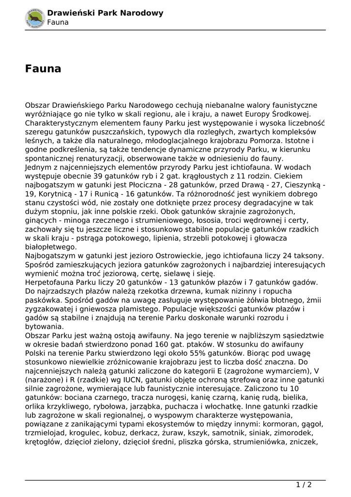 Drawieński Park Narodowy Fauna Fauna Obszar Drawieńskiego Parku Narodowego cechują niebanalne walory faunistyczne wyróżniające go nie tylko w skali regionu, ale i kraju, a nawet Europy Środkowej. Charakterystycznym elementem fauny Parku jest występowanie i wysoka liczebność szeregu gatunków puszczańskich, typowych dla rozległych, zwartych kompleksów leśnych, a także dla naturalnego, młodoglacjalnego krajobrazu Pomorza. Istotne i godne podkreślenia, są także tendencje dynamiczne przyrody Parku, w kierunku spontanicznej renaturyzacji, obserwowane także w odniesieniu do fauny. Jednym z najcenniejszych elementów przyrody Parku jest ichtiofauna. W wodach występuje obecnie 39 gatunków ryb i 2 gat. krągłoustych z 11 rodzin. Ciekiem najbogatszym w gatunki jest Płociczna - 28 gatunków, przed Drawą - 27, Cieszynką 19, Korytnicą - 17 i Runicą - 16 gatunków. Ta różnorodność jest wynikiem dobrego stanu czystości wód, nie zostały one dotknięte przez procesy degradacyjne w tak dużym stopniu, jak inne polskie rzeki. Obok gatunków skrajnie zagrożonych, ginących - minoga rzecznego i strumieniowego, łososia, troci wędrownej i certy, zachowały się tu jeszcze liczne i stosunkowo stabilne populacje gatunków rzadkich w skali kraju - pstrąga potokowego, lipienia, strzebli potokowej i głowacza białopłetwego. Najbogatszym w gatunki jest jezioro Ostrowieckie, jego ichtiofauna liczy 24 taksony. Spośród zamieszkujących jeziora gatunków zagrożonych i najbardziej interesujących wymienić można troć jeziorową, certę, sielawę i sieję. Herpetofauna Parku liczy 20 gatunków - 13 gatunków płazów i 7 gatunków gadów. Do najrzadszych płazów należą rzekotka drzewna, kumak nizinny i ropucha paskówka. Spośród gadów na uwagę zasługuje występowanie żółwia błotnego, żmii zygzakowatej i gniewosza plamistego. Populacje większości gatunków płazów i gadów są stabilne i znajdują na terenie Parku doskonałe warunki rozrodu i bytowania. Obszar Parku jest ważną ostoją awifauny. Na jego terenie w najbliższym sąsiedztwie w okresie badań stwierdzono ponad 160 gat. ptaków. W stosunku do awifauny Polski na terenie Parku stwierdzono lęgi około 55% gatunków. Biorąc pod uwagę stosunkowo niewielkie zróżnicowanie krajobrazu jest to liczba dość znaczna. Do najcenniejszych należą gatunki zaliczone do kategorii E (zagrożone wymarciem), V (narażone) i R (rzadkie) wg IUCN, gatunki objęte ochroną strefową oraz inne gatunki silnie zagrożone, wymierające lub faunistycznie interesujące. Zaliczono tu 10 gatunków: bociana czarnego, tracza nurogęsi, kanię czarną, kanię rudą, bielika, orlika krzykliwego, rybołowa, jarząbka, puchacza i włochatkę. Inne gatunki rzadkie lub zagrożone w skali regionalnej, o wyspowym charakterze występowania, powiązane z zanikającymi typami ekosystemów to między innymi: kormoran, gągoł, trzmielojad, krogulec, kobuz, derkacz, żuraw, kszyk, samotnik, siniak, zimorodek, krętogłów, dzięcioł zielony, dzięcioł średni, pliszka górska, strumieniówka, zniczek, 1/2 Drawieński Park Narodowy Fauna srokosz, czyż, krzyżodziób świerkowy i inne. Fauna ssaków Parku liczy ponad 40 gatunków. Na uwagę zasługuje liczne występowanie nietoperzy, reprezentowanych w Parku przez 8 gatunków, a także liczne populacje bobra i wydry. Dwa ostatnie gatunki uznać należy za charakterystyczne i reprezentatywne dla fauny Parku. Jedną z lepiej poznanych grup bezkręgowców są chruściki. Na terenie Parku opisano 65 gatunków. Jeden ze stwierdzonych podgatunków Hydropsyche contubernalis borealis okazał się nowy dla Polski, natomiast trzy gatunki Crunoecia irrorata, Ceraclea annulicornis i Ceraclea dissimilis stwierdzono po raz pierwszy na Pojezierzu Pomorskim. 13 innych gatunków uznano za rzadkie lub zagrożone. Najcenniejsze zespoły chruścików zasiedlają żródliska, rzeki oraz jeziora dystroficzne i oligotroficzne. Drugą, stosunkowo dobrze przebadaną grupą są ważki. Dotychczas na terenie Parku stwierdzono 47 gatunków. Za gatunki cenne lub bardzo cenne uznano Nehalennia speciosa, Aeshna subarctica elisabethae, Sympecma paedisca, Sympetrum fonscolombei i Leucorrhinia albifrons. Najcenniejsze taksony związane są przede wszystkim z torfowiskami i jeziorami o niskiej trofii. Wstępne dane dotyczące kózkowatych, a także analiza możliwości potencjalnego występowania nie stwierdzonych jeszcze gatunków pozwalają stwierdzić, że teren Parku jest bardzo atrakcyjny dla tej grupy owadów. Związane jest to z bogatą bazą środowisk i występującymi w nich roślinami pokarmowymi, zarówno larw jak i owadów dorosłych. Dotychczas na terenie parku znaleziono 49 gatunków kózkowatych, w tym kilku rzadkich jednak wydaje się, że istnieje możliwość znalezienia conajmniej kilkunastu dalszych. Zwraca uwagę fakt występowania 8 gatunków ciepłolubnych (subpontyjskich i mediterranejskich). Bardzo interesujące jest stwierdzenie Phymatodes glabratus - rzadkiego monofaga jałowca. Fauna motyli dziennych jest stosunkowo dobrze rozpoznana w skali kraju. Stwierdzone na terenie parku i jego bezpośredniego otoczenia 54 gatunki motyli dziennych nie wyróżniają tego terenu na tle Polski. Biorąc jednak pod uwagę położenie geograficzne, wysoki stopień zalesienia Parku i niewielką liczbę miejsc o dużym nasłonecznieniu, z bujną roślinnością zielną, liczba ta zasługuje na podkreślenie. Stwierdzone na terenie Parku stanowiska dostojki laodyce Argyronome laodice i kosternika palemona Carterocephalus palemon leżą na granicy ich zasięgu w Polsce, a czerwończyk nieparek Lycaena dispar jest gatunkiem zagrożonym w skali Europy. W miejscach kserotermicznych na uwagę zasługuje modraszek korydon Polyomnatus coridon. Data wydruku: 02.03.2017 06:44:53 Adres URL: http://dpn.pl/fauna 2/2 Powered by TCPDF (www.tcpdf.org)