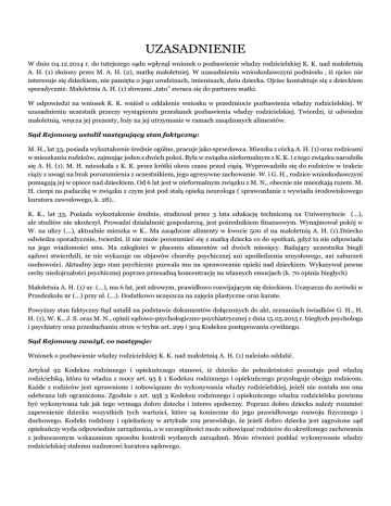 UZASADNIENIE W dniu 04.12.2014 r. do tutejszego sądu wpłynął wniosek o pozbawienie władzy rodzicielskiej K. K. nad małoletnią A. H. (1) złożony przez M. A. H. (2), matkę małoletniej. W uzasadnieniu wnioskodawczyni podniosła , iż ojciec nie interesuje się dzieckiem, nie pamięta o jego urodzinach, imieninach, dniu dziecka. Ojciec kontaktuje się z dzieckiem sporadycznie. Małoletnia A. H. (1) słowami „tato” zwraca się do partnera matki. W odpowiedzi na wniosek K. K. wniósł o oddalenie wniosku w przedmiocie pozbawienia władzy rodzicielskiej. W uzasadnieniu uczestnik przeczy wystąpieniu przesłanek pozbawienia władzy rodzicielskiej. Twierdzi, iż odwiedza małoletnią, wręcza jej prezenty, łoży na jej utrzymanie w ramach zasądzonych alimentów. Sąd Rejonowy ustalił następujący stan faktyczny: M. H., lat 33, posiada wykształcenie średnie ogólne, pracuje jako sprzedawca. Mieszka z córką A. H. (1) oraz rodzicami w mieszkaniu rodziców, zajmując jeden z dwóch pokoi. Była w związku nieformalnym z K. K. i z tego związku narodziła się A. H. (1). M. H. mieszkała z K. K. przez krótki okres czasu przed ciążą. Wyprowadziła się do rodziców w trakcie ciąży z uwagi na brak porozumienia z uczestnikiem, jego agresywne zachowanie. W. i G. H., rodzice wnioskodawczyni pomagają jej w opiece nad dzieckiem. Od 6 lat jest w nieformalnym związku z M. N., obecnie nie mieszkają razem. M. H. cierpi na padaczkę w związku z czym jest pod stałą opieką neurologa ( sprawozdanie z wywiadu środowiskowego kuratora zawodowego, k. 28).. K. K., lat 33, Posiada wykształcenie średnie, studiował przez 3 lata edukację techniczną na Uniwersytecie (...), ale studiów nie ukończył. Prowadzi działalność gospodarczą, jest pośrednikiem finansowym. Wynajmował pokój w W. na ulicy (...), aktualnie mieszka w K.. Ma zasądzone alimenty w kwocie 500 zł na małoletnią A. H. (1).Dziecko odwiedza sporadycznie, twierdzi, iż nie może porozumieć się z matką dziecka co do spotkań, gdyż ta nie odpowiada na jego wiadomości sms. Ma zaległości w płaceniu alimentów od dwóch miesięcy. Badający uczestnika biegli sądowi stwierdzili, że nie wykazuje on objawów choroby psychicznej ani upośledzenia umysłowego, ani zaburzeń osobowości. Aktualny jego stan psychiczny pozwala mu na sprawowanie opieki nad dzieckiem. Wykazywał pewne cechy niedojrzałości psychicznej poprzez przesadną koncentrację na własnych emocjach (k. 70 opinia biegłych) Małoletnia A. H. (1) ur. (...), ma 6 lat, jest zdrowym, prawidłowo rozwijającym się dzieckiem. Uczęszcza do zerówki w Przedszkolu nr (...) przy ul. (...). Dodatkowo uczęszcza na zajęcia plastyczne oraz karate. Powyższy stan faktyczny Sąd ustalił na podstawie dokumentów dołączonych do akt, zeznaniach świadków G. H., H. H. (1), W. K., J. S. oraz M. N., opinii sądowo-psychologiczno-psychiatrycznej z dnia 15.05.2015 r. biegłych psychologa i psychiatry oraz przesłuchaniu stron w trybie art. 299 i 304 Kodeksu postępowania cywilnego. Sąd Rejonowy zważył, co następuje: Wniosek o pozbawienie władzy rodzicielskiej K. K. nad małoletnią A. H. (1) należało oddalić. Artykuł 92 Kodeksu rodzinnego i opiekuńczego stanowi, iż dziecko do pełnoletniości pozostaje pod władzą rodzicielską, która to władza z mocy art. 93 § 1 Kodeksu rodzinnego i opiekuńczego przysługuje obojgu rodzicom. Każde z rodziców jest uprawnione i zobowiązane do wykonywania władzy rodzicielskiej, jeżeli nie została mu ona odebrana lub ograniczona. Zgodnie z art. 95§ 3 Kodeksu rodzinnego i opiekuńczego władza rodzicielska powinna być wykonywana tak jak tego wymaga dobro dziecka i interes społeczny. Poprzez dobro dziecka należy rozumieć zapewnienie dziecku wszystkich tych wartości, które są konieczne do jego prawidłowego rozwoju fizycznego i duchowego. Kodeks rodzinny i opiekuńczy w artykule 109 przewiduje, że jeżeli dobro dziecka jest zagrożone sąd opiekuńczy wyda odpowiednie zarządzenia, a w szczególności może zobowiązać rodziców do określonego zachowania z jednoczesnym wskazaniem sposobu kontroli wydanych zarządzeń. Może również poddać wykonywanie władzy rodzicielskiej stałemu nadzorowi kuratora sądowego. Natomiast przesłanki do pozbawienia rodziców władzy rodzicielskiej określa art. 111 Kodeksu rodzinnego i opiekuńczego, który stanowi, że sąd opiekuńczy pozbawi rodziców władzy rodzicielskiej jeżeli : --władza rodzicielska nie może być wykonywana z powodu z powodu trwałej przeszkody lub , --rodzice nadużywają władzy rodzicielskiej lub, --w sposób rażący zaniedbują swoje obowiązki względem dziecka. W niniejszej sprawie w ocenie Sądu Rejonowego nie zachodziły przesłanki do pozbawienia władzy rodzicielskiej K. K. nad jego małoletnią córką A. H. (1), dlatego też wniosek M. H. należało oddalić. W ocenie Sądu Rejonowego K. K. zaniedbywał swoje obowiązki rodzicielskie wobec córki, ale nie było to jeszcze zaniedbania, które można ocenić jako długotrwałe i rażące. K. K. przez długie okresy dziecka nie widywał, miał zaległości w alimentach, nie zajmował się wychowaniem dziecka. Wykazywał się dużą lekkomyślnością w swojej relacji do dziecka, zaniedbując to dziecko. Jednakże skutek w postaci pozbawienia władzy rodzicielskiej, Sąd może zastosować jedynie w przypadku, kiedy oceni, że te zaniedbania rodzicielskie, które tutaj występowały, są rażące. Sąd nie może zbyt pochopnie pozbawiać władzy rodzicielskiej. Z orzecznictwa Sądu Najwyższego wynika, że jako rażące Sąd ocenić może zaniedbania wieloletnie, długotrwałe, krzywdzenie dziecka, bicie, spowodowanie urazów dziecka, długoletnie nadużywanie alkoholu, patologie rodzinne, na przykład przestępczość, w którą dany rodzic popada, pozbawienie wolności, opuszczenie dziecka. Takie drastyczne sytuacje, Sąd ocenia, jako rażące. Uczestnik w tej sprawie zbyt mał