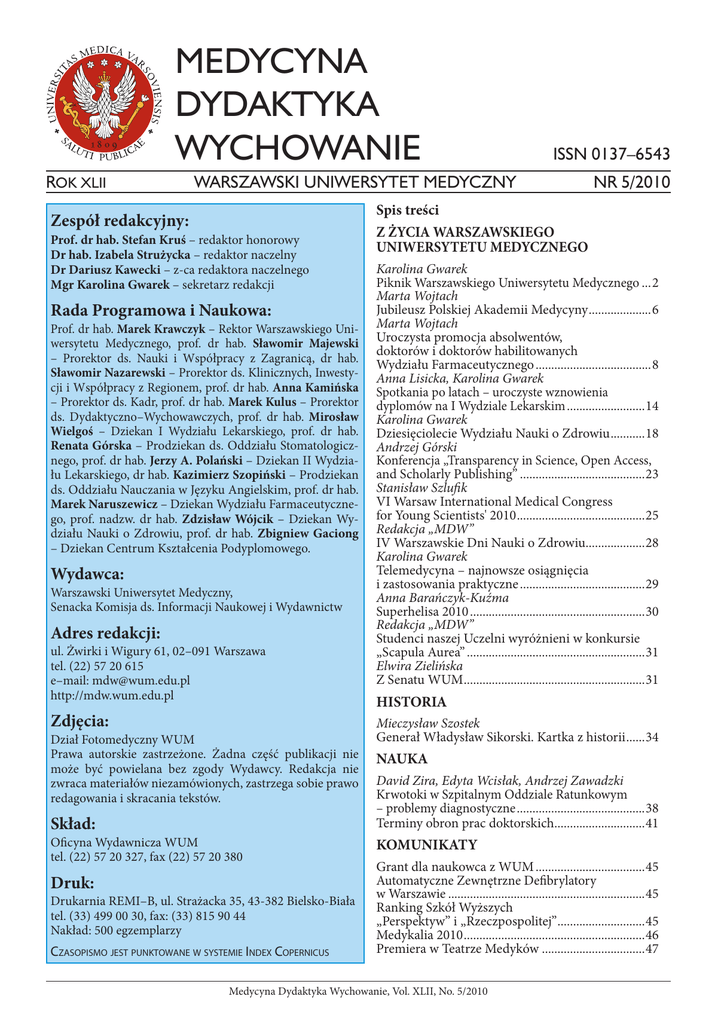 MEDYCYNA DYDAKTYKA WYCHOWANIE ROK XLII ISSN 0137–6543 WARSZAWSKI UNIWERSYTET MEDYCZNY Zespół redakcyjny: Prof. dr hab. Stefan Kruś – redaktor honorowy Dr hab. Izabela Strużycka – redaktor naczelny Dr Dariusz Kawecki – z-ca redaktora naczelnego Mgr Karolina Gwarek – sekretarz redakcji Rada Programowa i Naukowa: Prof. dr hab. Marek Krawczyk – Rektor Warszawskiego Uniwersytetu Medycznego, prof. dr hab. Sławomir Majewski – Prorektor ds. Nauki i Współpracy z Zagranicą, dr hab. Sławomir Nazarewski – Prorektor ds. Klinicznych, Inwestycji i Współpracy z Regionem, prof. dr hab. Anna Kamińska – Prorektor ds. Kadr, prof. dr hab. Marek Kulus – Prorektor ds. Dydaktyczno–Wychowawczych, prof. dr hab. Mirosław Wielgoś – Dziekan I Wydziału Lekarskiego, prof. dr hab. Renata Górska – Prodziekan ds. Oddziału Stomatologicznego, prof. dr hab. Jerzy A. Polański – Dziekan II Wydziału Lekarskiego, dr hab. Kazimierz Szopiński – Prodziekan ds. Oddziału Nauczania w Języku Angielskim, prof. dr hab. Marek Naruszewicz – Dziekan Wydziału Farmaceutycznego, prof. nadzw. dr hab. Zdzisław Wójcik – Dziekan Wydziału Nauki o Zdrowiu, prof. dr hab. Zbigniew Gaciong – Dziekan Centrum Kształcenia Podyplomowego. Wydawca: Warszawski Uniwersytet Medyczny, Senacka Komisja ds. Informacji Naukowej i Wydawnictw Adres redakcji: ul. Żwirki i Wigury 61, 02–091 Warszawa tel. (22) 57 20 615 e–mail: [email protected] http://mdw.wum.edu.pl Zdjęcia: Dział Fotomedyczny WUM Prawa autorskie zastrzeżone. Żadna część publikacji nie może być powielana bez zgody Wydawcy. Redakcja nie zwraca materiałów niezamówionych, zastrzega sobie prawo redagowania i skracania tekstów. Skład: Oficyna Wydawnicza WUM tel. (22) 57 20 327, fax (22) 57 20 380 Druk: Drukarnia REMI–B, ul. Strażacka 35, 43-382 Bielsko-Biała tel. (33) 499 00 30, fax: (33) 815 90 44 Nakład: 500 egzemplarzy Czasopismo jest punktowane w systemie Index Copernicus NR 5/2010 Spis treści Z ŻYCIA WARSZAWSKIEGO UNIWERSYTETU MEDYCZNEGO Karolina Gwarek Piknik Warszawskiego Uniwersytetu Medycznego....2 Marta Wojtach Jubileusz Polskiej Akademii Medycyny.....................6 Marta Wojtach Uroczysta promocja absolwentów, doktorów i doktorów habilitowanych Wydziału Farmaceutycznego......................................8 Anna Lisicka, Karolina Gwarek Spotkania po latach – uroczyste wznowienia dyplomów na I Wydziale Lekarskim..........................14 Karolina Gwarek Dziesięciolecie Wydziału Nauki o Zdrowiu............18 Andrzej Górski Konferencja „Transparency in Science, Open Access, and Scholarly Publishing”.........................................23 Stanisław Szlufik VI Warsaw International Medical Congress for Young Scientists' 2010..........................................25 Redakcja „MDW” IV Warszawskie Dni Nauki o Zdrowiu....................28 Karolina Gwarek Telemedycyna – najnowsze osiągnięcia i zastosowania praktyczne.........................................29 Anna Barańczyk-Kuźma Superhelisa 2010.........................................................30 Redakcja „MDW” Studenci naszej Uczelni wyróżnieni w konkursie „Scapula Aurea”..........................................................31 Elwira Zielińska Z Senatu WUM...........................................................31 HISTORIA Mieczysław Szostek Generał Władysław Sikorski. Kartka z historii.......34 NAUKA David Zira, Edyta Wcisłak, Andrzej Zawadzki Krwotoki w Szpitalnym Oddziale Ratunkowym – problemy diagnostyczne..........................................38 Terminy obron prac doktorskich..............................41 KOMUNIKATY Grant dla naukowca z WUM....................................45 Automatyczne Zewnętrzne Defibrylatory w Warszawie................................................................45 Ranking Szkół Wyższych „Perspektyw” i „Rzeczpospolitej”.............................45 Medykalia 2010...........................................................46 Premiera w Teatrze Medyków..................................47 Medycyna Dydaktyka Wychowanie, Vol. XLII, No. 5/2010 Z życia Warszawskiego Uniwersytetu Medycznego „Z sercem w darze” Warszawski Uniwersytet Medyczny – Społeczeństwu Warszawy Po raz drugi nasza Uczelnia zaprezentowała mieszkańcom Warszawy swoje największe atuty podczas „Pikniku Warszawskiego Uniwersytetu Medycznego”, który odbył się 22 maja na Polu Mokotowskim. Dobre humory podczas Pikniku dopisywały wszystkim!!! Ideą Pikniku jest promocja osiągnięć Uczelni i przedstawienie mieszkańcom stolicy dorobku naszych szpitali akademickich, katedr i klinik oraz organizacji studenckich. Pierwsza impreza z tego cyklu odbyła się w zeszłym roku, 10 maja na Nowym Świecie, i cieszyła się dużym zainteresowaniem warszawiaków. W związku z tym władze Uczelni podjęły decyzję, aby kontynuować tego typu spotkania i uczynić z nich naszą akademicką tradycję. W sobotę 22 maja, przy pięknej, wiosennej pogodzie, odbył się II Piknik Warszawskiego Piękna pogoda, ciekawy plener i mnóstwo atrakcji – to recepta na udaną imprezę edukacyjną Medycyna Dydaktyka Wychowanie, Vol. XLII, No. 5/2010 Z życia Warszawskiego Uniwersytetu Medycznego Uniwersytetu Medycznego. Na Polu Mokotowskim, w pobliżu Biblioteki Narodowej, ustawiono kilkadziesiąt namiotów, w których zaprezentowały się różne jednostki WUM. Uczestnicy mogli odwiedzić m.in. stoiska: neurochirurgii, gastroenterologii, diabetologii, medycyny rodzinnej, pneumonologii, promocji zdrowia i chorób zakaźnych, transplantologii, okulistyki, pediatrii, ginekologii, położnictwa, ortopedii, rehabilitacji, ratownictwa medycznego, stomatologii i farmacji. Nie zabrakło także namiotów uniwersyteckich szpitali klinicznych, organizacji studenckich i Akademickiego Związku Sportowego. Na stoiskach zainteresowani mogli wykonać bezpłatne badania diagnostyczne, takie jak pomiar ciśnienia tętnicz