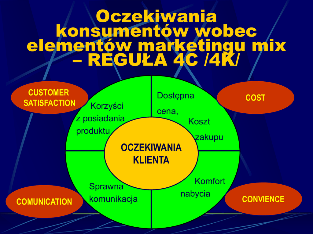 Oczekiwania konsumentów wobec elementów marketingu mix – REGUŁA 4C /4K/ CUSTOMER SATISFACTION Dostępna Korzyści z posiadania produktu cena, Koszt OCZEKIWANIA KLIENTA COMUNICATION Sprawna komunikacja COST zakupu Komfort nabycia CONVIENCE Pięć powodów, dla których ważna jest satysfakcja klienta 1. Usatysfakcjonowany klient opowie o tym 4-5 osobom. 2. Niezadowolony klient opowie o swoim rozczarowaniu 8-10, a nawet 20 osobom. 3. Przeciętnie 1 z 4 klientów nie jest w pełni zadowolony. 4. Ponad 95% z tych klientów mogłoby otrzymać od nas satysfakcjonującą pomoc. 5. Pozyskanie nowego klienta kosztuje 5-6 razy więcej niż utrzymanie starego. Konsumpcja /spożycie/- to akt lub proces zaspokajania potrzeb poprzez zużycie lub stopniowe zużywanie nabytych, wytworzonych lub bezpłatnie udostępnionych dóbr materialnych i niematerialnych /usług/. Z przedstawionej definicji wynika, iż: celem konsumpcji jest zaspokajanie potrzeb, zaspokajanie potrzeb odbywa się poprzez wykorzystanie dóbr, wykorzystanie dóbr może być aktem lub procesem, przedmioty konsumpcji mogą być pozyskiwane na drodze somowytworzenia /samoobsługi/, darowizny, zakupu, dobra nabywane noszą nazwę produktów /materialnych i niematerialnych/. Konsument to osoba, która spożywa jednorazowo lub w dłuższym okresie czasu dobra materialne lub niematerialne w celu zaspokojenia swoich potrzeb. Zachowania konsumpcyjne to czynności i działania podejmowane w celu pozyskania dóbr służących zaspokojeniu potrzeb oraz ogół sposobów ich wykorzystania. Zachowania nabywcze to czynności i działania podejmowane w celu nabycia /pozyskania na drodze zakupu/ produktów materialnych i niematerialnych /usług/. Klasyfikacja konsumpcji: Ze względu na podmiot konsumpcji: konsumpcja jednostkowa i zbiorowa /w gospodarstwie domowym, grupowa, ogólnospołeczna/. Ze względu na źródło finansowania: konsumpcja prywatna i publiczna. Ze względu na przedmiot konsumpcji: konsumpcja dóbr materialnych /żywnościowych i nieżywnościowych/ i konsumpcja usług. Uwarunkowania zachowań konsumenta: CZYNNIKI ZEWNĘTRZNE Informacyjno - edukacyjne Kulturowe CZYNNIKI WEWNĘTRZNE PsychoGeogra- logiczne ficzne KONSUMENT Społecznozawodowe Demograficzne Ekonomiczne Ekonomiczno - gospodarcze Prawidłowości konsumpcji Prawa Gossena: W miarę zwiększania się konsumpcji dobra, maleje jego użyteczność krańcowa. Towar ma dla konsumenta wartość subiektywną, zależną od poziomu satysfakcji jakiej mu dostarcza. Prawidłowości konsumpcji c.d. Prawa Engla: W miarę wzrostu dochodów maleje procentowy udział wydatków na żywność w wydatkach ogółem. O normalnym poziomie konsumpcji możemy mówić wtedy, gdy racjonalne koszty konsumpcji nie przekraczają 80% dochodu, a pozostałe 20% stanowi fundusz swobodnej decyzji. Prawidłowości konsumpcji c.d. Prawo Dussenberego: Im wyższy jest poziom konsumpcji innych osób, tym niższa jest satysfakcja z własnej konsumpcji. Prawo Keynesa: Konsumpcja rośnie wraz z dochodami, lecz jej przyrost jest mniejszy od przyrostu dochodu. Prawo Marshala: Popyt na dany produkt wzrasta wraz z obniżaniem się ceny i odwrotnie, gdy cena rośnie popyt maleje. Prawidłowości konsumpcji c.d. Prawo Fabiarkiewicza: Wraz ze wzrostem dochodów struktura konsumpcji zmienia się według następujących etapów: I. Wzrost ilości zakupywanej żywności. II. Zmiany w jakości zakupów żywnościowych i zmiany ilościowe w zakupach nieżywnościowych. III. Zanik zmian w obszarze żywności, zmiany jakościowe w obszarze nieżywnościowym. IV. Zanik zmian w obszarze nieżywnościowym. Oszczędności. V. Optymalizacja konsumpcji. Odstępstwa /paradoksy/ Giffena – wzrost cen powoduje zwiększenie popytu na dobra podstawowe wśród najuboższych. Veblena –wzrost cen na dobra luksusowe powoduje wzrost popytu na te dobra w grupie konsumentów zamożnych. Spekulacyjny – wzrost cen powoduje wzrost popytu a spadek jego zmniejszenie w efekcie spekulacji. Sezonowości - wzrost cen powoduje wzrost popytu a spadek jego zmniejszenie w efekcie sezonowości konsumpcji. K O N S U M P C J A Kierunki rozwoju konsumpcji: Homogenizacja Prosumpcja Domocentryzacja Wirtualizacja Prywatyzacja Dematerializacja Ekologizacja Etapy procesu decyzyjnego konsumenta Odczucie potrzeby Poszukiwanie alternatyw Ocena alternatyw Odczucia po zakupie Decyzja zakupu Proces decyzyjny: odczucie potrzeby Rodzaje potrzeb wg Maslowa: Potrzeby samorealizacji Potrzeby szacunku i uznania Potrzeby przynależności i miłości Potrzeby bezpieczeństwa Potrzeby fizjologiczne Proces decyzyjny: odczucie potrzeby c.d. Właściwości potrzeb: niepoliczalność, nieskończoność w czasie, nieograniczoność, następstwo ujawniania się, substytucyjność, komplementarność. Proces decyzyjny: poszukiwanie alternatyw Źródła informacji: Źródła osobiste /własne doświadczenie/. Źródła zewnętrzne: • personalne /formalne i nieformalne/ • publiczne, • marketingowe. Proces decyzyjny: ocena alternatyw Rodzaje ryzyka: ryzyko funkcjonalne, ryzyko fizyczne /bezpieczeństwa/, ryzyko ekonomiczne, ryzyko społeczne, ryzyko psychologiczne, ryzyko straty czasu. Proces decyzyjny: ocena alternatyw c.d. Sposoby minimalizacji ryzyka zakupu: zdobycie jak największej ilości informacji, nabywanie produktów znanych, zakup produktów o wyższej cenie, lojalność wobec marki, zakup na próbę, korzystanie z zabezpieczeń ustawowych, korzystanie z umów nieformalnych. Proces decyzyjny: decyzja zakupu Typy reguł decyzyjnych: reguły kompensacyjne, reguły satysfakcji, reguły leksykograficzne. Proces decyzyjny: decyzja zakupu c.d. Czynniki zewnętrzne wpływające na decyzję zakupu: warunki fizyczne, warunki o charakterze społecznym, warunki o charakterze psychologicznym, ograniczenia czasowe, warunki o charakterze marketingowym. Proces decyzyjny: odczucia po zakupie Odczucia po zakupie są wypadkową konfrontacji oczekiwań przed dokonaniem zakupu z tym co prz