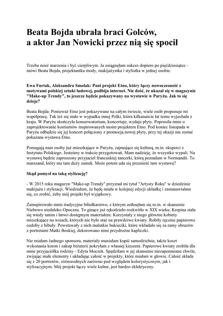 Beata Bojda ubrała braci Golców, a aktor Jan Nowicki przez nią się spocił Trzeba mieć marzenia i być cierpliwym. Ja osiągnęłam sukces dopiero po pięćdziesiątce mówi Beata Bojda, projektantka mody, makijażystka i stylistka w jednej osobie. Ewa Furtak, Aleksandra Smolak: Pani projekt Etno, który łączy nowoczesność z motywami polskiej sztuki ludowej, podbija internet. Nie dość, że ukazał się w magazynie "Make-up Trendy", to jeszcze będzie pokazywany na wystawie w Paryżu. Jak to się dzieje? Beata Bojda: Ponieważ Etno jest pokazywane na całym świecie, wiele osób proponuje mi współpracę. Tak też się stało w wypadku innej Polki, która kilkanaście lat temu wyjechała z kraju. W Paryżu skończyła konserwatorium, koncertuje, wydaje płyty. Poprosiła mnie o zaprojektowanie kostiumów inspirowanych moim projektem Etno. Pod koniec listopada w Paryżu odbędzie się jej koncert połączony z promocją nowej płyty, przy tej okazji ma zostać pokazana wystawa Etno. Pomagają nam osoby już mieszkające w Paryżu, zajmujące się kulturą, m.in. eksperci z Instytutu Polskiego. Jesteśmy w trakcie przygotowań. Mam nadzieję, że wszystko wypali. Na wystawę będzie zaproszony przyjaciel francuskiej tancerki, którą poznałam w Normandii. To marszand, który ma tam duży zamek. Może potem uda się przenieść tam wystawę? Skąd pomysł na taką stylizację? - W 2015 roku magazyn "Make-up Trendy" przyznał mi tytuł "Artysty Roku" w dziedzinie makijażu i stylizacji. Wiedziałem, że będę miała w kolejnej edycji okładkę i zastanawiałam się, co zrobić, żeby mój projekt był wyjątkowy. Zainspirowało mnie tradycyjne bibułkarstwo, z którym zetknęłam się m.in. w skansenie Niebowo niedaleko Opoczna. To ginące już rękodzieło rozkwitło w XIX wieku. Krepina stała się wtedy tanim i łatwo dostępnym materiałem. Korzystały z niego głównie kobiety mieszkające na wsiach, których nie było stać na prawdziwe kwiaty. Robiły ręcznie papierowe ozdoby z bibuły. Powstawały z nich malutkie bukieciki, które wkładało się za ramy obrazów z portretami Matki Boskiej, dekorowano nimi przydrożne kapliczki. Nie miałam żadnego sponsora, materiały musiałam kupić samodzielnie, także koszt wykonania koron i zakup biżuterii pokryłam z własnej kieszeni. Papierowe kwiaty zrobiła dla mnie przyjaciółka rodziny - Edyta Moczek. Spędziłam w jej skansenie niezapomniane chwile, zwijając małe elementy i układając całość w projekty, które miałam w głowie. Całość składa się z 20 portretów, różnorodnych zarówno pod względem kolorystycznym, jak i stylizacyjnym. Mój projekt łączy wiele kultur, jest bardzo eklektyczny. Podobno dość okrężną drogą trafiła pani do świata mody i stylizacji? - Bardzo okrężną. Zaczynałam pracę zawodową jako nauczycielka języka polskiego. Chyba jednak zawsze chciałam być artystką. Ale to moja najmłodsza siostra była w tym kierunku bardzo utalentowana. Skończyła ASP w Warszawie, jest bardzo dobra w tym, co robi. To jest tak, że gdy w rodzinie jest np. dwóch śpiewaków i jeden śpiewa gorzej, to ten drugi z czasem przestaje śpiewać, bo trudno mu z nim konkurować. Dlatego wybrałam filologię polską. 24 lata temu urodziłam córkę Zuzannę. Mam młodsze rodzeństwo. Mój brat miał wtedy kilka lat, jedna siostra studiowała, druga pracowała, obie miały małe dzieci. Moja mama zajmowała się trójką maluchów. Nie miałam sumienia angażować mamy w wychowywanie kolejnego dziecka, więc poszłam na urlop wychowawczy. Po powrocie trudno było mi znaleźć pracę w szkole. Owszem, uczyłam jeszcze, ale tylko na jakichś zastępstwach. Okazało się, że status nauczyciela mianowanego jest już nieważny, że muszę w zasadzie zacząć wszystko od początku. Chciałam albo gotować, albo malować. Gotowanie było trochę droższe, wybrałam kosmetologię, skończyłam studia w tym kierunku. Miała pani okazję pracować z nieżyjącym już Franciszkiem Dzidą, filmowcem amatorem z Chybia, który był pierwowzorem dla głównego bohatera głośnego filmu "Amator" Krzysztofa Kieślowskiego. - Bardzo miło to wspominam. Franciszek był człowiekiem niezwykłym. Zaczęłam pracę z nim jako zupełnie nieznana makijażystka. Miałam trochę szczęścia. Aktorka Teatru Polskiego Jagoda Krzywicka, z którą się przyjaźniłam i którą malowałam do ślubu, powiedziała mi, że Franek szuka makijażystki do pracy przy swoim filmie. Zapytała mnie, czy nie zgodziłabym z nim współpracować. Byłam wprawdzie absolwentką Międzynarodowej Szkoły Charakteryzacji Marii Dziewulskiej, ale bez żadnego doświadczenia. Moim atutem był wiek zbliżałam się do czterdziestki, więc wyglądałam na taką, która wie, co robi (śmiech ). To była "Strefa zmierzchu" z samym Janem Nowickim. Była tam scena, w której bohater grany przez Nowickiego był chory. Reżyser wymyślił, że po jego twarzy ma spływać pot. Sztuczny pot, tak jak sztuczną krew, można kupić w sklepie dla charakteryzatorów. Ja jednak byłam daleko od takiego sklepu - w Chybiu, a scena miała być kręcona nazajutrz. Nie spałam całą noc i myślałam, jak sobie z tym poradzić. Jestem bardzo kreatywną osobą i wreszcie wymyśliłam, że jeśli ma być chory i musi się pocić, to będzie się pocił. Wysmarowałam go wazeliną i spryskałam wodą w sprayu. Woda nie spływała mu po twarzy od razu, tylko wolniuteńko, tak jak chciałam. Zapytałam na wszelki wypadek operatora, czy widać pot. Uspokoił mnie, że nawet jeśli nie widać, to zrobi tak, żeby było widać. Pracując przy takich kameralnych produkcjach, wszyscy sobie pomagają, są jak jedna rodzina. Jak pracowało się z tak znanymi ludźmi? - Na planach filmowych u Franciszka Dzidy było bardzo rodzinnie. Razem mieszkaliśmy w wynajętych domkach albo hotelach, razem jadaliśmy obiady. Miałam okazję pracować u niego także z Piotrem Machalicą i Anną