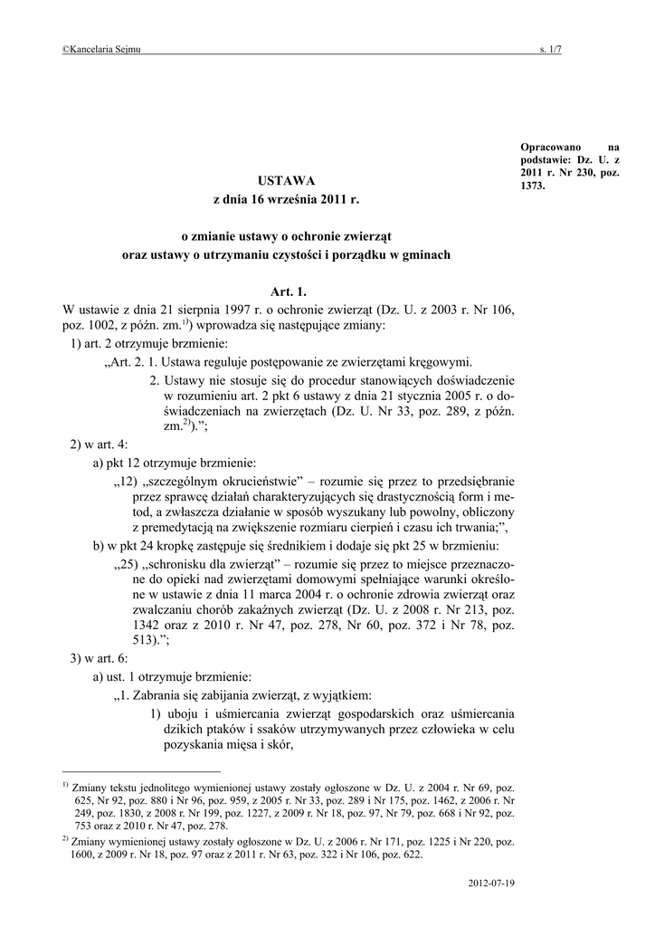 ©Kancelaria Sejmu s. 1/7 Opracowano na podstawie: Dz. U. z 2011 r. Nr 230, poz. 1373. USTAWA z dnia 16 września 2011 r. o zmianie ustawy o ochronie zwierząt oraz ustawy o utrzymaniu czystości i porządku w gminach Art. 1. W ustawie z dnia 21 sierpnia 1997 r. o ochronie zwierząt (Dz. U. z 2003 r. Nr 106, poz. 1002, z późn. zm.1)) wprowadza się następujące zmiany: 1) art. 2 otrzymuje brzmienie: „Art. 2. 1. Ustawa reguluje postępowanie ze zwierzętami kręgowymi. 2. Ustawy nie stosuje się do procedur stanowiących doświadczenie w rozumieniu art. 2 pkt 6 ustawy z dnia 21 stycznia 2005 r. o doświadczeniach na zwierzętach (Dz. U. Nr 33, poz. 289, z późn. zm.2)).”; 2) w art. 4: a) pkt 12 otrzymuje brzmienie: „12) „szczególnym okrucieństwie” – rozumie się przez to przedsiębranie przez sprawcę działań charakteryzujących się drastycznością form i metod, a zwłaszcza działanie w sposób wyszukany lub powolny, obliczony z premedytacją na zwiększenie rozmiaru cierpień i czasu ich trwania;”, b) w pkt 24 kropkę zastępuje się średnikiem i dodaje się pkt 25 w brzmieniu: ,,25) ,,schronisku dla zwierząt” – rozumie się przez to miejsce przeznaczone do opieki nad zwierzętami domowymi spełniające warunki określone w ustawie z dnia 11 marca 2004 r. o ochronie zdrowia zwierząt oraz zwalczaniu chorób zakaźnych zwierząt (Dz. U. z 2008 r. Nr 213, poz. 1342 oraz z 2010 r. Nr 47, poz. 278, Nr 60, poz. 372 i Nr 78, poz. 513).”; 3) w art. 6: a) ust. 1 otrzymuje brzmienie: „1. Zabrania się zabijania zwierząt, z wyjątkiem: 1) uboju i uśmiercania zwierząt gospodarskich oraz uśmiercania dzikich ptaków i ssaków utrzymywanych przez człowieka w celu pozyskania mięsa i skór, 1) Zmiany tekstu jednolitego wymienionej ustawy zostały ogłoszone w Dz. U. z 2004 r. Nr 69, poz. 625, Nr 92, poz. 880 i Nr 96, poz. 959, z 2005 r. Nr 33, poz. 289 i Nr 175, poz. 1462, z 2006 r. Nr 249, poz. 1830, z 2008 r. Nr 199, poz. 1227, z 2009 r. Nr 18, poz. 97, Nr 79, poz. 668 i Nr 92, poz. 753 oraz z 2010 r. Nr 47, poz. 278. 2) Zmiany wymienionej ustawy zostały ogłoszone w Dz. U. z 2006 r. Nr 171, poz. 1225 i Nr 220, poz. 1600, z 2009 r. Nr 18, poz. 97 oraz z 2011 r. Nr 63, poz. 322 i Nr 106, poz. 622. 2012-07-19 ©Kancelaria Sejmu s. 2/7 2) połowu ryb zgodnie z przepisami o rybołówstwie i rybactwie śródlądowym, 3) konieczności bezzwłocznego uśmiercenia, 4) działań niezbędnych do usunięcia poważnego zagrożenia sanitarnego ludzi lub zwierząt, 5) usuwania osobników bezpośrednio zagrażających ludziom lub innym zwierzętom, jeżeli nie jest możliwy inny sposób usunięcia zagrożenia, 6) polowań, odstrzałów i ograniczania populacji zwierząt łownych, 7) usypiania ślepych miotów – prowadzonych zgodnie z art. 33 oraz przepisami odrębnymi.”, b) po ust. 1 dodaje się ust. 1a w brzmieniu: „1a. Zabrania się znęcania nad zwierzętami.”, c) w ust. 2: – pkt 1 otrzymuje brzmienie: „1) umyślne zranienie lub okaleczenie zwierzęcia, niestanowiące dozwolonego prawem zabiegu lub doświadczenia na zwierzęciu, w tym znakowanie zwierząt stałocieplnych przez wypalanie lub wymrażanie, a także wszelkie zabiegi mające na celu zmianę wyglądu zwierzęcia i wykonywane w celu innym niż ratowanie jego zdrowia lub życia, a w szczególności przycinanie psom uszu i ogonów (kopiowanie);”, – pkt 3 otrzymuje brzmienie: „3) używanie do pracy albo w celach sportowych lub rozrywkowych zwierząt chorych, a także zbyt młodych lub starych oraz zmuszanie ich do czynności, których wykonywanie może spowodować ból;”, – pkt 10 otrzymuje brzmienie: ,,10) utrzymywanie zwierząt w niewłaściwych warunkach bytowania, w tym utrzymywanie ich w stanie rażącego zaniedbania lub niechlujstwa, bądź w pomieszczeniach albo klatkach uniemożliwiających im zachowanie naturalnej pozycji;”, – uchyla się pkt 14; – w pkt 15 kropkę zastępuje się średnikiem i dodaje się pkt 16–19 w brzmieniu: „16) obcowanie płciowe ze zwierzęciem (zoofilia); 17) wystawianie zwierzęcia domowego lub gospodarskiego na działanie warunków atmosferycznych, które zagrażają jego zdrowiu lub życiu; 18) transport żywych ryb lub ich przetrzymywanie w celu sprzedaży bez dostatecznej ilości wody uniemożliwiającej oddychanie; 19) utrzymywanie zwierzęcia bez odpowiedniego pokarmu lub wody przez okres wykraczający poza minimalne potrzeby właściwe dla gatunku.”; 2012-07-19 ©Kancelaria Sejmu s. 3/7 4) w art. 7: a) w ust. 1 pkt 2 otrzymuje brzmienie: „2) gospodarstwu rolnemu wskazanemu przez wójta (burmistrza, prezydenta miasta), jeżeli jest to zwierzę gospodarskie, lub”, b) ust. 1a otrzymuje brzmienie: „1a. Decyzja, o której mowa w ust. 1, podejmowana jest z urzędu po uzyskaniu informacji od Policji, straży gminnej, lekarza weterynarii lub upoważnionego przedstawiciela organizacji społecznej, której statutowym celem działania jest ochrona zwierząt.”, c) ust. 3 otrzymuje brzmienie: „3. W przypadkach niecierpiących zwłoki, gdy dalsze pozostawanie zwierzęcia u dotychczasowego właściciela lub opiekuna zagraża jego życiu lub zdrowiu, policjant, strażnik gminny lub upoważniony przedstawiciel organizacji społecznej, której statutowym celem działania jest ochrona zwierząt, odbiera mu zwierzę, zawiadamiając o tym niezwłocznie wójta (burmistrza, prezydenta miasta), celem podjęcia decyzji w przedmiocie odebrania zwierzęcia.”; 5) w art. 9 ust. 2 otrzymuje brzmienie: „2. Zabrania się trzymania zwierząt domowych na uwięzi w sposób stały dłużej niż 12 godzin w ciągu doby lub powodujący u nich uszkodzenie ciała lub cierpienie oraz niezapewniający możliwości niezbędnego ruchu. Długość uwięzi nie może być krótsza niż 3 m.”; 6) po art. 9 dodaje się art. 9a w brzmieniu: „Art. 9a. Osoba, która napotka porzuconego psa lub kota, w szczególności pozostawionego na uwięzi, ma obowiązek powiadomić o ty