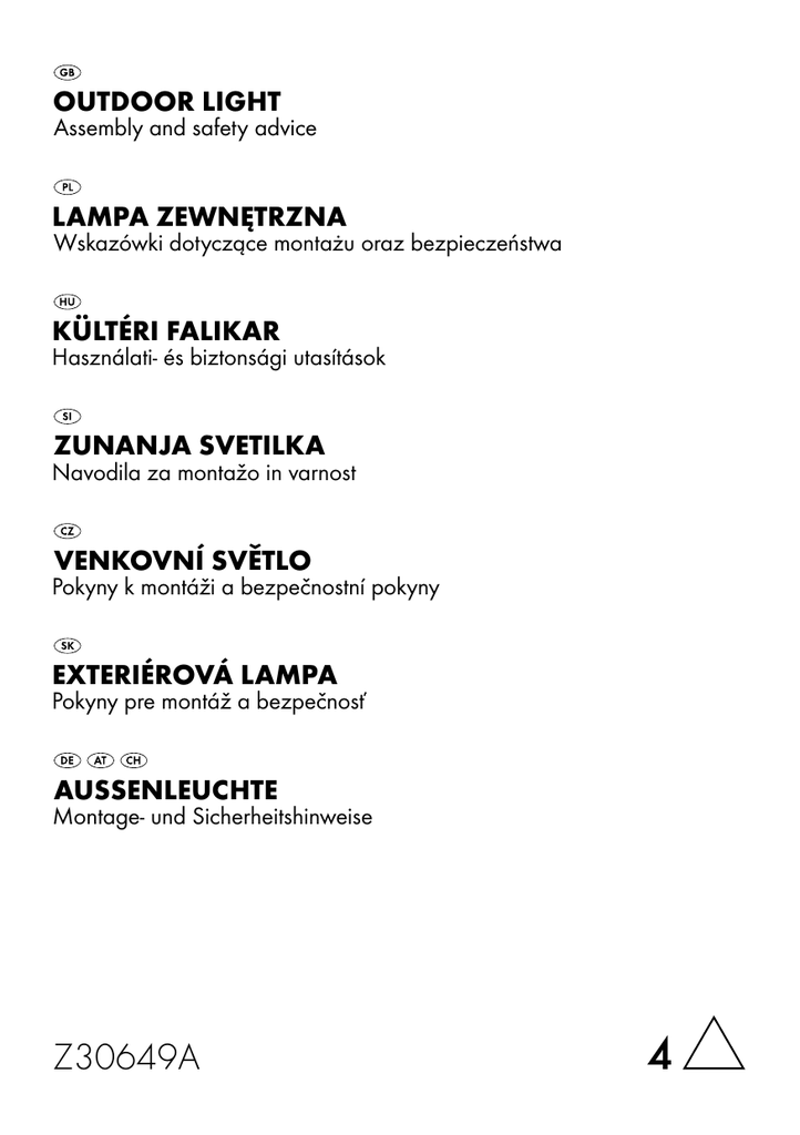 Outdoor Light A ssembly and safety advice Lampa zewnętrzna W skazówki dotyczące montażu oraz bezpieczeństwa Kültéri falikar H asználati- és biztonsági utasítások Zunanja svetilka N avodila za montažo in varnost Venkovní světlo P okyny k montáži a bezpečnostní pokyny Exteriérová lampa P okyny pre montáž a bezpečnosť AuSSenleuchte M ontage- und Sicherheitshinweise Z30649A 4 GB PL HU SI CZ SK DE / AT / CH Assembly and safety advice Wskazówki dotyczące montażu oraz bezpieczeństwa Használati- és biztonsági utasítások Navodila za montažo in varnost Pokyny k montáži a bezpečnostní pokyny Pokyny pre montáž a bezpečnosť Montage- und Sicherheitshinweise Page Strona Oldal Stran Strana Strana Seite 3 8 13 18 23 28 33 Table of Contents Introduction Proper use........................................................................................................................ Page4 Description of parts and features.........................................................................................Page4 Scope of delivery............................................................................................................ Page4 Technical data................................................................................................................. Page4 Safety instructions............................................................................................... Page4 Installation................................................................................................................. Page5 How to use Regulating the motion sensitivity.................................................................................... Page6 Regulating the sensitivity of the light.............................................................................. Page6 Regulating the duration of the illumination.................................................................... Page6 Replacing the illuminant.................................................................................................. Page6 Cleaning and care................................................................................................ Page7 Disposal........................................................................................................................ Page7 GB 3 Introduction / Safety instructions Outdoor light Q Scope Q Introduction Always check that the scope of delivery is complete and that the appliance is in perfect condition immediately after unpacking the contents. The assembly instructions are part of this product. They contain important information on safety, handling and disposal. Familiarise yourself with all the functions of the appliance before operating it for the first time. To do so, read the following assembly and safety instructions. Always use the device as described and for the stated areas of use only. Keep this manual in a safe place. Make sure that all documents accompany the device if you pass it on to anyone else. Q Proper use The product is to be used to illuminate areas inand outdoors. Any other use or modification of the product constitute improper use and pose a risk of short circuits, fire, electric shocks and damage to the product. The manufacturer is not liable for damage caused by improper use. The product is not intended for commercial use. Q Description of parts and features 1 Lamp shade 2 Light bulb 3 Sealing ring 4 Lamp body 5 Control to regulate duration of light 6 Control to regulate motion sensitivity 7 Control to regulate light sensitivity 8 Motion sensor 9 Hinged lid 10 Gasket 11 Device for wall mounting 12 Cross-head screw 13 Dowel 4 GB of delivery 1 Outdoor light 2 Screws (for wall mounting) 2 Dowels (for wall mounting) 1 Illuminant 1 Assembly instructions Q Technical data Operating voltage: 230 V ~ 50 Hz Electrical power: 1 x max. 11 W Illuminant: 1 energy-saving lamp E27, 11 Watt Protection class: System of protection: IP 44 (splash-proof) Safety Instructions PLEASE KEEP ALL SAFETY INSTRUCTIONS AND DIRECTIONS FOR USE IN A SAFE PLACE FOR FUTURE REFERENCE! J Warning! DANGER OF DEATH AND ACCIDENTS FOR TODDLERS AND CHILDREN! Never leave children unsupervised with the packaging material. The packaging material represents a danger of suffocation. Children frequently underestimate the dangers. Please keep children away from the device at all times. Warning! DANGER TO LIFE! Keep J children away from the work area during assembly. A large number of screws and other small parts are included in delivery. They could pose a danger to life if they are swallowed or inhaled. J Children or persons who lack the knowledge or experience to use the device or whose physical, sensory or intellectual capacities are limited must never be allowed to use the device without supervision or instruction by a person responsible Safety instructions / Installation for their safety. Children must never be allowed to play with the device. J This product is not a toy and should be kept out of the reach of children. Children are not aware of the dangers associated with handling electrical products. J Do not use the article if you detect any kind of damage. J CAUTION! DANGER OF EXPLOSION! Do not operate the lamp in potentially explosive environments in which there are inflammable vapours, gases or dusts. J The top side of the lamp can get very hot. Switch the lamp off and let it cool down before touching the housing. J Avoid overheating and the risk of fire. Keep the product at least 0.10 m away from combustible materials. J Make sure that the input voltage of the lamp complies with the voltage prescribed for the illuminant (230 V ~). J Do not use the product if it is damaged. Do not repair the lead wire. Make sure that the lamp cannot be used if the lead wire is damaged. To do so, disconnect the lamp from the connecting cable and inform the other occupants that the lamp may not be used until it has been repaired by a professional. J Damage arisi
