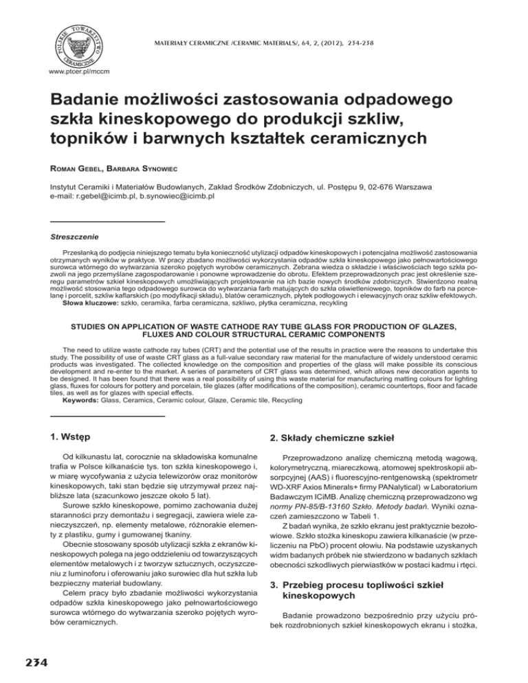 MATERIA£Y CERAMICZNE /CERAMIC MATERIALS/, 64, 2, (2012), 234-238 www.ptcer.pl/mccm Badanie moĪliwoĞci zastosowania odpadowego szkáa kineskopowego do produkcji szkliw, topników i barwnych ksztaátek ceramicznych ROMAN GEBEL, BARBARA SYNOWIEC Instytut Ceramiki i Materiaáów Budowlanych, Zakáad ĝrodków Zdobniczych, ul. PostĊpu 9, 02-676 Warszawa e-mail: [email protected], [email protected] Streszczenie Przesáanką do podjĊcia niniejszego tematu byáa koniecznoĞü utylizacji odpadów kineskopowych i potencjalna moĪliwoĞü zastosowania otrzymanych wyników w praktyce. W pracy zbadano moĪliwoĞci wykorzystania odpadów szkáa kineskopowego jako peánowartoĞciowego surowca wtórnego do wytwarzania szeroko pojĊtych wyrobów ceramicznych. Zebrana wiedza o skáadzie i wáaĞciwoĞciach tego szkáa pozwoli na jego przemyĞlane zagospodarowanie i ponowne wprowadzenie do obrotu. Efektem przeprowadzonych prac jest okreĞlenie szeregu parametrów szkieá kineskopowych umoĪliwiających projektowanie na ich bazie nowych Ğrodków zdobniczych. Stwierdzono realną moĪliwoĞü stosowania tego odpadowego surowca do wytwarzania farb matujących do szkáa oĞwietleniowego, topników do farb na porcelanĊ i porcelit, szkliw kaÀarskich (po mody¿kacji skáadu), blatów ceramicznych, páytek podáogowych i elewacyjnych oraz szkliw efektowych. Sáowa kluczowe: szkáo, ceramika, farba ceramiczna, szkliwo, páytka ceramiczna, recykling STUDIES ON APPLICATION OF WASTE CATHODE RAY TUBE GLASS FOR PRODUCTION OF GLAZES, FLUXES AND COLOUR STRUCTURAL CERAMIC COMPONENTS The need to utilize waste cathode ray tubes (CRT) and the potential use of the results in practice were the reasons to undertake this study. The possibility of use of waste CRT glass as a full-value secondary raw material for the manufacture of widely understood ceramic products was investigated. The collected knowledge on the composition and properties of the glass will make possible its conscious development and re-enter to the market. A series of parameters of CRT glass was determined, which allows new decoration agents to be designed. It has been found that there was a real possibility of using this waste material for manufacturing matting colours for lighting glass, Àuxes for colours for pottery and porcelain, tile glazes (after modi¿cations of the composition), ceramic countertops, Àoor and facade tiles, as well as for glazes with special effects. Keywords: Glass, Ceramics, Ceramic colour, Glaze, Ceramic tile, Recycling 234 1. WstĊp 2. Skáady chemiczne szkieá Od kilkunastu lat, corocznie na skáadowiska komunalne tra¿a w Polsce kilkanaĞcie tys. ton szkáa kineskopowego i, w miarĊ wycofywania z uĪycia telewizorów oraz monitorów kineskopowych, taki stan bĊdzie siĊ utrzymywaá przez najbliĪsze lata (szacunkowo jeszcze okoáo 5 lat). Surowe szkáo kineskopowe, pomimo zachowania duĪej starannoĞci przy demontaĪu i segregacji, zawiera wiele zanieczyszczeĔ, np. elementy metalowe, róĪnorakie elementy z plastiku, gumy i gumowanej tkaniny. Obecnie stosowany sposób utylizacji szkáa z ekranów kineskopowych polega na jego oddzieleniu od towarzyszących elementów metalowych i z tworzyw sztucznych, oczyszczeniu z luminoforu i oferowaniu jako surowiec dla hut szkáa lub bezpieczny materiaá budowlany. Celem pracy byáo zbadanie moĪliwoĞci wykorzystania odpadów szkáa kineskopowego jako peánowartoĞciowego surowca wtórnego do wytwarzania szeroko pojĊtych wyrobów ceramicznych. Przeprowadzono analizĊ chemiczną metodą wagową, kolorymetryczną, miareczkową, atomowej spektroskopii absorpcyjnej (AAS) i Àuorescyjno-rentgenowską (spektrometr WD-XRF Axios Minerals+ ¿rmy PANalytical) w Laboratorium Badawczym ICiMB. AnalizĊ chemiczną przeprowadzono wg normy PN-85/B-13160 Szkáo. Metody badaĔ. Wyniki oznaczeĔ zamieszczono w Tabeli 1. Z badaĔ wynika, Īe szkáo ekranu jest praktycznie bezoáowiowe. Szkáo stoĪka kineskopu zawiera kilkanaĞcie (w przeliczeniu na PbO) procent oáowiu. Na podstawie uzyskanych widm badanych próbek nie stwierdzono w badanych szkáach obecnoĞci szkodliwych pierwiastków w postaci kadmu i rtĊci. 3. Przebieg procesu topliwoĞci szkieá kineskopowych Badanie prowadzono bezpoĞrednio przy uĪyciu próbek rozdrobnionych szkieá kineskopowych ekranu i stoĪka, BADANIE MOĩLIWOĝCI ZASTOSOWANIA ODPADOWEGO SZKàA KINESKOPOWEGO DO PRODUKCJI SZKLIW, TOPNIKÓW... Tabela 1. Wyniki badaĔ skáadu chemicznego szkieá. Table 1. Results of chemical composition measurements of studied glasses. Oznaczenie [% mas.] Szkáo „StoĪek” Szkáo „Ekran” Metoda oznaczania SiO2 52,78 60,59 wagowa+AAS Al2O3 2,519 2,012 AAS Fe2O3 0,099 0,076 AAS TiO2 0,202 0,368 kolorymetryczna Na2O 6,258 8,395 AAS K2O 6,711 6,164 AAS MgO 0,059 1,902 AAS CaO 2,439 0,156 AAS ZnO 0,252 0,229 AAS BaO 4,111 8,654 AAS PbO 15,04 0,063 AAS SrO 9,382 11,14 miareczkowa strata praĪenia 0,151 0,249 wagowa w automatycznym urządzeniu typu PR-37/1600K (Przemysáowy Instytut Elektroniki), skáadającym siĊ z pieca rurowego i kamery z ukáadem ¿ltrów obserwacji wsadu wewnątrz pieca i ciągáej rejestracji zmian zachodzących w trakcie topienia próbek. Szkáo kineskopowe charakteryzuje siĊ niską topliwoĞcią. Temperatura punktu póákuli wynosi 850°C dla szkáa stoĪka i 900°C dla szkáa ekranu. W obydwu przypadkach nie uformowaáa siĊ kula. Dobry rozpáyw szkliw wykonanych na bazie tych surowców powinien wystĊpowaü w temperaturach powyĪej 1000°C. 4. PromieniotwórczoĞü Wiązka elektronów generowana w kineskopie padając na ekran pokryty substancją Àuorescencyjną jest Ĩródáem promieniowania rentgenowskiego. Z uwagi na to, Īe promieniowanie jonizujące moĪe byü przyczyną powstawania w szkle izotopów wykazujących promieniotwórczoĞü samoistną, jak i na zawartoĞü w szkle pierwiastków, które mogą wykazywaü promieniotwórczoĞü naturalną, przeprowadzone zostaáy badania promieniotwórczoĞci szkáa kine