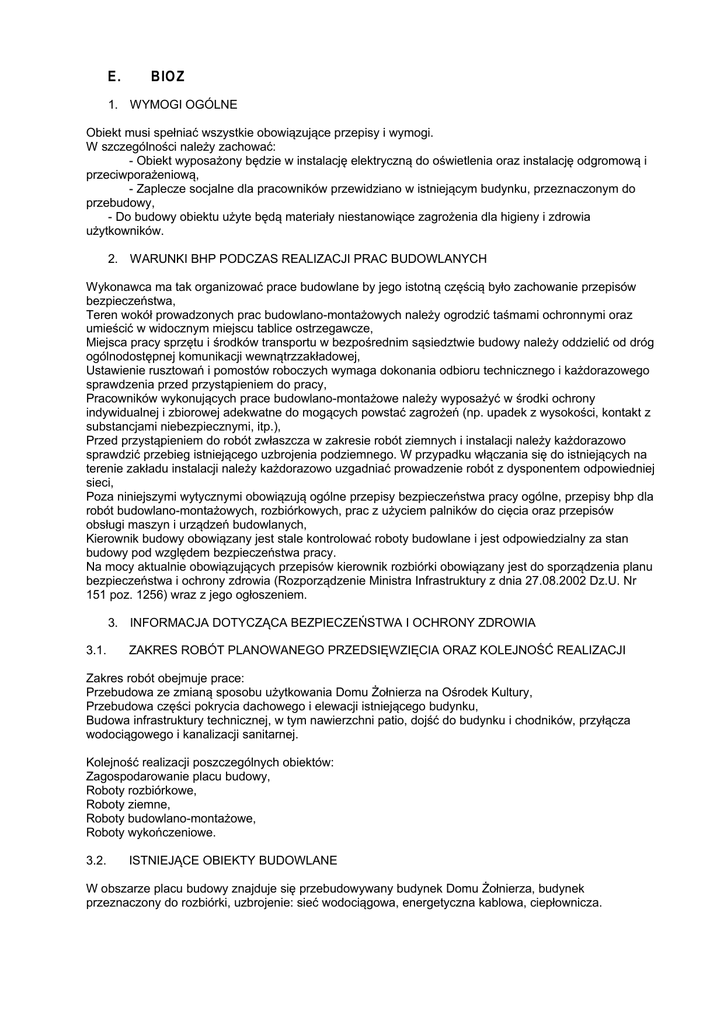 E. BIOZ 1. WYMOGI OGÓLNE Obiekt musi spełniać wszystkie obowiązujące przepisy i wymogi. W szczególności należy zachować: - Obiekt wyposażony będzie w instalację elektryczną do oświetlenia oraz instalację odgromową i przeciwporażeniową, - Zaplecze socjalne dla pracowników przewidziano w istniejącym budynku, przeznaczonym do przebudowy, - Do budowy obiektu użyte będą materiały niestanowiące zagrożenia dla higieny i zdrowia użytkowników. 2. WARUNKI BHP PODCZAS REALIZACJI PRAC BUDOWLANYCH Wykonawca ma tak organizować prace budowlane by jego istotną częścią było zachowanie przepisów bezpieczeństwa, Teren wokół prowadzonych prac budowlano-montażowych należy ogrodzić taśmami ochronnymi oraz umieścić w widocznym miejscu tablice ostrzegawcze, Miejsca pracy sprzętu i środków transportu w bezpośrednim sąsiedztwie budowy należy oddzielić od dróg ogólnodostępnej komunikacji wewnątrzzakładowej, Ustawienie rusztowań i pomostów roboczych wymaga dokonania odbioru technicznego i każdorazowego sprawdzenia przed przystąpieniem do pracy, Pracowników wykonujących prace budowlano-montażowe należy wyposażyć w środki ochrony indywidualnej i zbiorowej adekwatne do mogących powstać zagrożeń (np. upadek z wysokości, kontakt z substancjami niebezpiecznymi, itp.), Przed przystąpieniem do robót zwłaszcza w zakresie robót ziemnych i instalacji należy każdorazowo sprawdzić przebieg istniejącego uzbrojenia podziemnego. W przypadku włączania się do istniejących na terenie zakładu instalacji należy każdorazowo uzgadniać prowadzenie robót z dysponentem odpowiedniej sieci, Poza niniejszymi wytycznymi obowiązują ogólne przepisy bezpieczeństwa pracy ogólne, przepisy bhp dla robót budowlano-montażowych, rozbiórkowych, prac z użyciem palników do cięcia oraz przepisów obsługi maszyn i urządzeń budowlanych, Kierownik budowy obowiązany jest stale kontrolować roboty budowlane i jest odpowiedzialny za stan budowy pod względem bezpieczeństwa pracy. Na mocy aktualnie obowiązujących przepisów kierownik rozbiórki obowiązany jest do sporządzenia planu bezpieczeństwa i ochrony zdrowia (Rozporządzenie Ministra Infrastruktury z dnia 27.08.2002 Dz.U. Nr 151 poz. 1256) wraz z jego ogłoszeniem. 3. INFORMACJA DOTYCZĄCA BEZPIECZEŃSTWA I OCHRONY ZDROWIA 3.1. ZAKRES ROBÓT PLANOWANEGO PRZEDSIĘWZIĘCIA ORAZ KOLEJNOŚĆ REALIZACJI Zakres robót obejmuje prace: Przebudowa ze zmianą sposobu użytkowania Domu Żołnierza na Ośrodek Kultury, Przebudowa części pokrycia dachowego i elewacji istniejącego budynku, Budowa infrastruktury technicznej, w tym nawierzchni patio, dojść do budynku i chodników, przyłącza wodociągowego i kanalizacji sanitarnej. Kolejność realizacji poszczególnych obiektów: Zagospodarowanie placu budowy, Roboty rozbiórkowe, Roboty ziemne, Roboty budowlano-montażowe, Roboty wykończeniowe. 3.2. ISTNIEJĄCE OBIEKTY BUDOWLANE W obszarze placu budowy znajduje się przebudowywany budynek Domu Żołnierza, budynek przeznaczony do rozbiórki, uzbrojenie: sieć wodociągowa, energetyczna kablowa, ciepłownicza. 3.3. ELEMENTY ZAGOSPODAROWANIA TERENU MOGĄCE STWARZAĆ ZAGROŻENIEBEZPIECZEŃSTWA I ZDROWIA LUDZI Do elementów tych można zaliczyć: Obiekty budowlane – możliwe zagrożenia w trakcie prowadzenia robót budowlanych, Infrastruktura techniczna – możliwe zagrożenia w trakcie wykonywania robót ziemnych, montażowych, w szczególności spawalniczych. Robotami niebezpiecznymi na terenie obiektu będą w szczególności następujące rodzaje robót budowlano-montażowych: - Roboty, które ze względu na charakter, organizację lub miejsce prowadzenia stwarzają szczególnie wysokie ryzyko powstania zagrożenia bezpieczeństwa i zdrowia ludzi, a w szczególności przysypania ziemią lub upadku z wysokości (roboty ziemne, wykopy pod obiekty liniowe, prace na wysokościach przy obiektach budowlanych), - Roboty, przy których prowadzeniu występują oddziaływania substancji chemicznych zagrażających bezpieczeństwu i zdrowiu ludzi (np. malowanie farbą, wykonywanie izolacji), - Roboty prowadzone w studniach (studzienki na sieci wod.-kan.), - Roboty prowadzone przy montażu i demontażu ciężkich elementów prefabrykowanych (urządzenia technologiczne, elementy konstrukcyjne, żelbetowe kręgi studzienne), - Roboty wykonywane przy użyciu dźwigów, montaż i demontaż rusztowań, - Roboty wykonywane w pobliżu przewodów linii elektroenergetycznych. 3.4. ZAGROŻENIA WYSTĘPUJĄCE PODCZAS REALIZACJI ROBÓT BUDOWLANYCH 3.4.1. ZAGOSPODAROWANIE PLACU BUDOWY POWINNO OBEJMOWAĆ W SZCZEGÓLNOŚCI: - Ogrodzenie terenu - Drogi - Zapewnienie energii elektrycznej i wody - Urządzenie higieniczno-sanitarne - Urządzenie socjalno-bytowe Teren budowy lub robót powinien być w miarę potrzeby zabezpieczony ogrodzeniem. Ogrodzenie placu budowy powinno być tak wykonane, aby nie stwarzało, zagrożenia dla ludzi. Wysokość ogrodzenia powinna wynosić, co najmniej 1,5 m. Na placu budowy powinny być wyznaczone miejsca do składowania materiałów. Materiały powinny być składowane w miejscu wyrównanym do poziomu. Materiały chemiczne, szkodliwe dla zdrowia należy przechowywać w szczelnych opakowaniach. Urządzenia elektryczne powinny być wykonane, utrzymane i eksploatowane zgodnie z obowiązującymi przepisami i normami Praca związana z podłączeniem i naprawą urządzeń elektrycznych powinny być wykonane przez osoby posiadające odpowiednie uprawnienia. Skrzynka rozdzielcza prądu do zasilania urządzeń mechanicznych na placu budowy powinna być zabezpieczona przed dostępem osób niepowołanych. 3.4.2. ZAGROŻENIA WYSTĘPUJĄCE PRZY WYKONYWANIU ROBÓT ZIEMNYCH I SIECIOWYCH: - Upadek pracownika lub osoby postronnej do wykopu (brak wygrodzenia wykopu balustradami, brak przykrycia wykopu), - Zasypanie pracownika w wykopie wąskoprzestrzennym (brak zabezpieczenia ścian wykopu przed obsunięciem się, obc