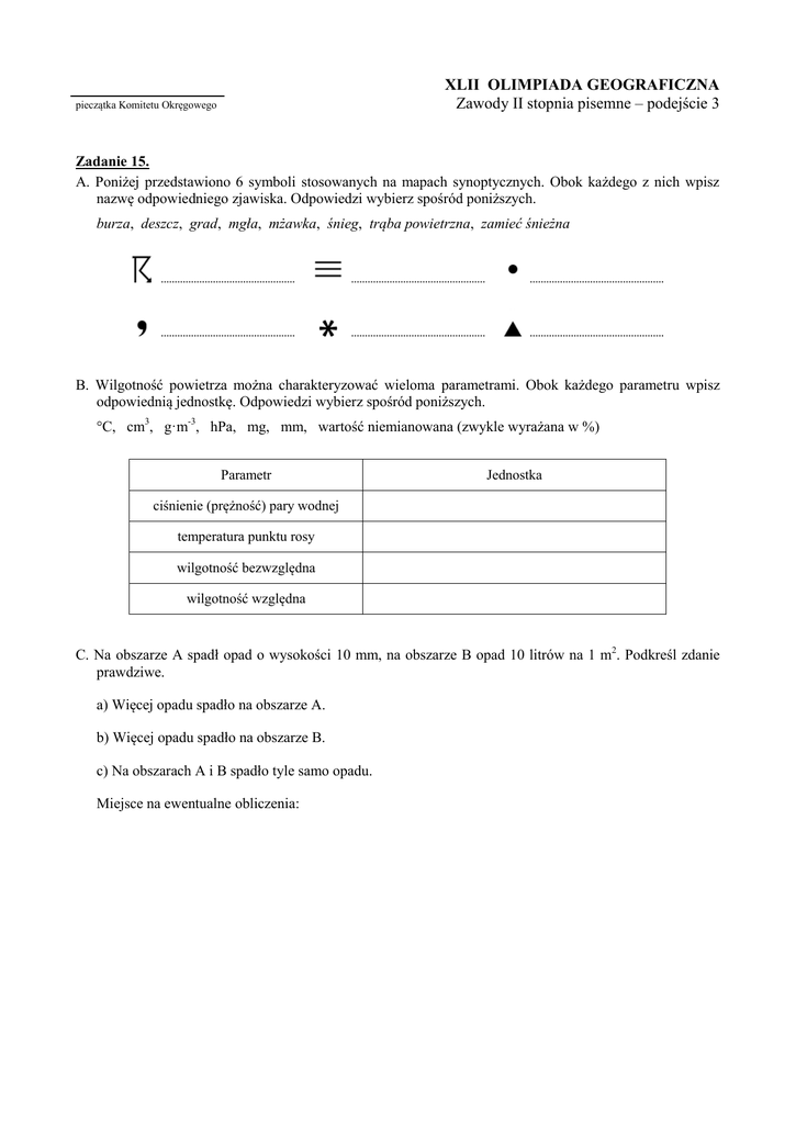 -3/1- XLII OLIMPIADA GEOGRAFICZNA Zawody II stopnia pisemne – podejście 3 pieczątka Komitetu Okręgowego Zadanie 15. A. Poniżej przedstawiono 6 symboli stosowanych na mapach synoptycznych. Obok każdego z nich wpisz nazwę odpowiedniego zjawiska. Odpowiedzi wybierz spośród poniższych. burza, deszcz, grad, mgła, mżawka, śnieg, trąba powietrzna, zamieć śnieżna B. Wilgotność powietrza można charakteryzować wieloma parametrami. Obok każdego parametru wpisz odpowiednią jednostkę. Odpowiedzi wybierz spośród poniższych. °C, cm3, g·m-3, hPa, mg, mm, wartość niemianowana (zwykle wyrażana w %) Parametr Jednostka ciśnienie (prężność) pary wodnej temperatura punktu rosy wilgotność bezwzględna wilgotność względna C. Na obszarze A spadł opad o wysokości 10 mm, na obszarze B opad 10 litrów na 1 m2. Podkreśl zdanie prawdziwe. a) Więcej opadu spadło na obszarze A. b) Więcej opadu spadło na obszarze B. c) Na obszarach A i B spadło tyle samo opadu. Miejsce na ewentualne obliczenia: -3/2- Zadanie 16. Podkreśl brakujące uzupełnienia zdań. W każdym przypadku poprawna jest tylko jedna z podanych propozycji. Uwaga! W przypadku podkreślenia więcej niż jednej propozycji, odpowiedź ta nie będzie oceniania. A. W meteorologii opad atmosferyczny w postaci padających gęsto kropel wody o średnicy mniejszej niż 0,5 mm nazywany jest (mżawką / opadem przelotnym / opadem konwekcyjnym). Opad ten może padać wyłącznie z chmur (Cumulonimbus / Nimbostratus / Stratus). B. W meteorologii opad atmosferyczny w postaci bryłek lodu o średnicy większej niż 5 mm nazywany jest (gradem / krupami śnieżnymi / śniegiem ziarnistym). Opad ten może padać wyłącznie z chmur (Cumulonimbus / Nimbostratus / Stratus). C. Mgła i zamglenie to zawiesina bardzo małych kropelek wody w powietrzu zmniejszająca widzialność poziomą. Jako graniczną, maksymalną wartość widzialności poziomej w trakcie mgły przyjmuje się (100 m / 500 m / 1000 m), natomiast zamglenia (2 km / 10 km / 20 km). D. Osad atmosferyczny w postaci drobnych kryształów lodu, który powstaje w wyniku kontaktu wilgotnego powietrza z podłożem o temperaturze poniżej 0°C to (biała rosa / szadź / szron). Zachodzi wówczas (kondensacja / sublimacja / resublimacja) pary wodnej, czyli jej bezpośrednia przemiana w ciało stałe. Zadanie 17. W tabeli podano nazwy 8 rodzajów wiatrów. Określ cechę termiczną każdego z nich (do drugiej kolumny tabeli wpisz „ciepły” lub „zimny”) oraz wskaż obszar jego występowania (do trzeciej kolumny tabeli wpisz nazwę regionu wybranego spośród poniższych). Alpy, Dalmacja, Góry Skaliste, Patagonia, Prowansja, Syberia, Sycylia, wybrzeże Zatoki Gwinejskiej Wiatr bora buran chinook fen harmattan mistral pampero sirocco Cecha termiczna Obszar występowania -3/3- Zadanie 18. Poniższe klimatogramy sporządzono dla 6 miast położonych w przybliżeniu na jednakowej szerokości geograficznej. Podpisz wykresy, wybierając odpowiedzi spośród poniższych. Uwaga! Wykresy można podpisać samymi nazwami miast, bez podawania ich współrzędnych geograficznych. Charków (50°N, 36°E), Irkuck (52°N, 104°E), Londyn (52°N, 0°), Pietropawłowsk Kamczacki (53°N, 159°E) Vancouver (49°N, 123°W), Warszawa (52°N, 21°E) ............................................................ ............................................................ ............................................................ ............................................................ ............................................................ ............................................................ -3/4- Zadanie 19. Obok każdego zdania zaznacz „X” w kolumnie P, jeśli zdanie jest prawdziwe lub w kolumnie F, jeśli zdanie jest fałszywe. P F Każda rzeka, która uchodzi do morza (oceanu), jest rzeką główną. Każda rzeka, która uchodzi do jeziora bezodpływowego, jest rzeką główną. Każda rzeka, która uchodzi do innej rzeki, nie jest rzeką główną. Rzeka główna to taka rzeka, która ma długość co najmniej 100 km. Rzeka główna to taka rzeka, która ma co najmniej jeden dopływ. Rzeka główna to taka rzeka, która jest dłuższa od każdego ze swoich dopływów. Zadanie 20. Na wykresach przedstawiono zmiany średniego przepływu w cyklu rocznym 4 rzek przy ich ujściu do morza. Pod każdym diagramem wpisz nazwę rzeki. Odpowiedzi wybierz spośród poniższych. Amur, Ganges, Kongo, Niger, Sekwana, Wisła -3/5- Zadanie 21. A. Uzupełnij poniższe zdania, wpisując nazwy odpowiednich rzek. a) Najdłuższa (2660 km) rzeka Afryki należąca do zlewiska Oceanu Indyjskiego to .................................... b) Najdłuższa (3190 km) rzeka Ameryki należąca do zlewiska Oceanu Spokojnego to ................................ c) Najdłuższa (3530 km) na świecie rzeka płynąca na obszarze bezodpływowym to .................................... B. Podkreśl nazwę rzeki, która przepływa przez wymienione państwa (w podanej kolejności). a) Chiny Indie Pakistan Amu-Daria, Brahmaputra, Ganges, Indus b) Rosja Białoruś Ukraina Dniepr, Dniestr, Don, Dźwina c) Chiny Kazachstan Rosja Amur, Irtysz, Jenisej, Lena Zadanie 22. A. Podkreśl nazwę województwa, którego obszar w całości należy do dorzecza Wisły. a) lubelskie b) małopolskie c) podkarpackie d) podlaskie B. Podkreśl nazwę województwa, którego obszar w całości należy do dorzecza Odry. a) dolnośląskie b) opolskie c) śląskie d) zachodniopomorskie -3/6- Zadanie 23. Na rycinie przedstawiono nieckę artezyjską. A. Opisz warstwy skalne na rycinie: w wykropkowane miejsca wpisz „warstwy przepuszczalne” lub „warstwy nieprzepuszczalne”. B. Niebieską kredką wrysuj poziom wody w studni Y. Uwaga! Proszę zachować dokładność przy wrysowywaniu poziomu wody w studni! C. Studnia artezyjska to studnia ................. (wpisz X, Y lub Z), a studnia subartezyjska to studnia .................. (