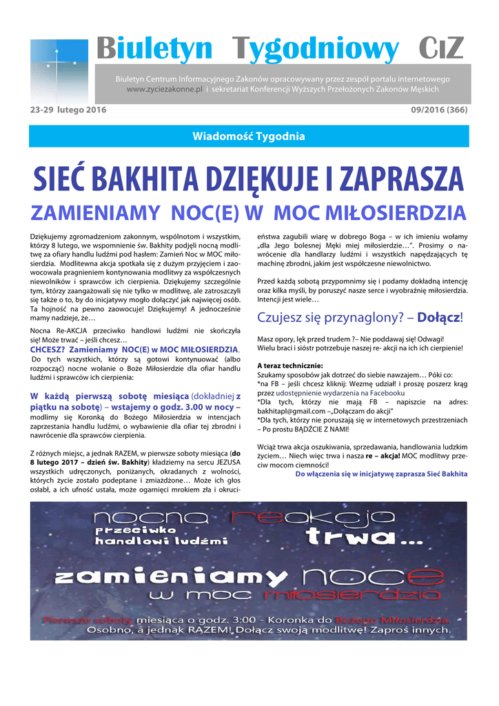 Biuletyn Tygodniowy CIZ Biuletyn Centrum Informacyjnego Zakonów opracowywany przez zespół portalu internetowego www.zyciezakonne.pl i sekretariat Konferencji Wyższych Przełożonych Zakonów Męskich 23-29 lutego 2016 09/2016 (366) Wiadomość Tygodnia ! ! SIEĆ BAKHITA DZIĘKUJE I ZAPRASZA ZAMIENIAMY NOC(E) W MOC MIŁOSIERDZIA Dziękujemy zgromadzeniom zakonnym, wspólnotom i wszystkim, którzy 8 lutego, we wspomnienie św. Bakhity podjęli nocną modlitwę za ofiary handlu ludźmi pod hasłem: Zamień Noc w MOC miłosierdzia. Modlitewna akcja spotkała się z dużym przyjęciem i zaowocowała pragnieniem kontynowania modlitwy za współczesnych niewolników i sprawców ich cierpienia. Dziękujemy szczególnie tym, którzy zaangażowali się nie tylko w modlitwę, ale zatroszczyli się także o to, by do inicjatywy mogło dołączyć jak najwięcej osób. Ta hojność na pewno zaowocuje! Dziękujemy! A jednocześnie mamy nadzieje, że… Nocna Re-AKCJA przeciwko handlowi ludźmi nie skończyła się! Może trwać – jeśli chcesz… CHCESZ? Zamieniamy NOC(E) w MOC MIŁOSIERDZIA. Do tych wszystkich, którzy są gotowi kontynuować (albo rozpocząć) nocne wołanie o Boże Miłosierdzie dla ofiar handlu ludźmi i sprawców ich cierpienia: W każdą pierwszą sobotę miesiąca (dokładniej z piątku na sobotę) – wstajemy o godz. 3.00 w nocy – modlimy się Koronką do Bożego Miłosierdzia w intencjach zaprzestania handlu ludźmi, o wybawienie dla ofiar tej zbrodni i nawrócenie dla sprawców cierpienia. Z różnych miejsc, a jednak RAZEM, w pierwsze soboty miesiąca (do 8 lutego 2017 – dzień św. Bakhity) kładziemy na sercu JEZUSA wszystkich udręczonych, poniżanych, okradanych z wolności, których życie zostało podeptane i zmiażdżone… Może ich głos osłabł, a ich ufność ustała, może ogarnięci mrokiem zła i okruci- eństwa zagubili wiarę w dobrego Boga – w ich imieniu wołamy „dla Jego bolesnej Męki miej miłosierdzie…”. Prosimy o nawrócenie dla handlarzy ludźmi i wszystkich napędzających tę machinę zbrodni, jakim jest współczesne niewolnictwo. Przed każdą sobotą przypomnimy się i podamy dokładną intencję oraz kilka myśli, by poruszyć nasze serce i wyobraźnię miłosierdzia. Intencji jest wiele… Czujesz się przynaglony? – Dołącz! Masz opory, lęk przed trudem ?– Nie poddawaj się! Odwagi! Wielu braci i sióstr potrzebuje naszej re- akcji na ich ich cierpienie! A teraz technicznie: Szukamy sposobów jak dotrzeć do siebie nawzajem… Póki co: *na FB – jeśli chcesz kliknij: Wezmę udział! i proszę poszerz krąg przez udostępnienie wydarzenia na Facebooku *Dla tych, którzy nie mają FB – napiszcie na adres: [email protected] –„Dołączam do akcji” *Dla tych, którzy nie poruszają się w internetowych przestrzeniach – Po prostu BĄDŹCIE Z NAMI! Wciąż trwa akcja oszukiwania, sprzedawania, handlowania ludzkim życiem… Niech więc trwa i nasza re – akcja! MOC modlitwy przeciw mocom ciemności! Do włączenia się w inicjatywę zaprasza Sieć Bakhita 23-29 lutego 2016 Biuletyn Tygodniowy CiZ 09/2015 (366) ______________________________________________________________________________________________ Wiadomości z kraju WAŻNE WYRÓŻNIENIE FRANCISZKAŃSKIEGO EKOLOGA Ojciec Stanisław Jaromi, franciszkanin i przewodniczący Ruchu Ekologicznego św. Franciszka z Asyżu otrzymał Nagrodę im. bp. Romana Andrzejewskiego. Wręczenie nagrody Fundacji „Solidarna Wieś” odbyło się w czwartek w Sekretariacie Konferencji Episkopatu Polski. Jak podkreślił ks. Ireneusz Juszczyński, członek Kapituły Nagrody im. bp. Romana Andrzejewskiego, tegoroczne wyróżnienie ma na celu docenienie długoletniego i konsekwentnego zaangażowania o. Stanisława Jaromiego w edukację ekologiczną oraz jego wkład „w budowę wspólnoty mieszkańców wsi i miast z Polski i Europy angażujących się jako chrześcijanie w rozwiązywanie problemów, które stwarza kryzys ekologiczny”. W opinii kapituły, o. Jaromi „zasługuje na uznanie jako znawca i propagator nauczania papieża Franciszka, zawartego w encyklice ekologicznej «Laudato si’»”. – Kapituła wysoko oceniła postawę i ideę, którą laureat głosi, że ochrona naturalnych bogactw i różnorodność terenów wiejskich, rozwój gospodarstw rodzinnych oraz troska o bezpieczeństwo żywieniowe kraju jest kluczowym zadaniem dla Polski, bowiem polska wieś jest wyjątkowa – podkreślił ks. Juszczyński. Przełożony prowincji krakowskiej franciszkanów konwentualnych o. Jarosław Zachariasz w laudacji zwrócił uwagę, że zainteresowanie sprawami ochrony środowiska i troskę o dobro wspólne o. Jaromi przejawiał od początku swojego życia zakonnego. – Niedługo po wstąpieniu do zakonu zapisał się do Ruchu Ekologicznego św. Franciszka z Asyżu, później odbywał studia na Katolickim Uniwersytecie Lubelskim z zakresu filozofii przyrody – przypomniał zakonnik. Zdaniem biskupa warszawsko-praskiego, abp. Henryka Hosera, który wręczył Nagrodę im. bp. Andrzejewskiego, wieloaspektowa działalność o. Jaromiego wpisuje się w chrześcijańską aktywność na rzecz ochrony środowiska naturalnego. – Przez minione 25 lat mojej posługi kapłańskiej nie robiłem nic innego, jak głosiłem naukę społeczną Kościoła – powiedział o. Jaromi zauważając, że wszelkie działania na rzecz stworzenia świata wpisują się w to kościelne nauczanie. Nagroda za 2015 r. została przyznana po raz dwunasty. Otrzymują ją zawsze osoby wybitnie zasłużone dla spraw wsi i rolnictwa w Polsce, rozwoju cywilizacyjnego i kulturalnego oraz edukacji. Do tej pory otrzymali ją: prof. Andrzej Stelmachowski, prof. Maria Radomska, kard. Józef Glemp, ks. prał. Bogusław Bijak, dr Maria Stolzman, dr Barbara FedyszakRadziejowska, bp Alojzy Orszulik, Roman Kluska, Josef Rottenaicher (Niemcy), abp Józef Michalik i prof. Alojzy Szymański. W uroczystości, zorganiz