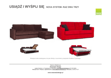 USIĄDŹ I WYŚPIJ SIĘ NOVA SYSTEM- RAZ DWA TRZY Niniejsza karta katalogowa nie jest ofertą w rozumieniu przepisów Kodeksu Cywilnego. Salony Meblowe Swarzędz Design Jupiter Centrum; ul. Towarowa 22,; Warszawa, [email protected]; 22 331 89 40 Metropol Dom i Wnętrze, Jagiellońska 82, [email protected]; Warszawa, 22 512 77 27 www.swarzedzdesign.pl USIĄDŹ I WYŚPIJ SIĘ RAZ NOVA SYSTEM- RAZ DWA TRZY DWA TRZY Mebel rozłożysz w trzech prostych ruchach. Już nie musisz martwić się gdzie odłożyć poduchy na czas spania- w systemie NOVA pozostają przymocowane do stelaża. Podczas korzystania z wygodnej funkcji spania wiszą nad podłożem. Pościel schowasz do otomany w wersji narożnej lub w otwieranym podłokietniku*. Indywidualnie certyfikowane stelaże NOVA produkowane przez firmę - dają gwarancję długoletniego działania. Salony Meblowe Swarzędz Design Jupiter Centrum; ul. Towarowa 22,; Warszawa, [email protected]; 22 331 89 40 Metropol Dom i Wnętrze, Jagiellońska 82, [email protected]; Warszawa, 22 512 77 27 www.swarzedzdesign.pl USIĄDŹ I WYŚPIJ SIĘ ErgoCap NOVA SYSTEM- RAZ DWA TRZY Materac z 14cm Uchwyty Listew ErgoCap** pianki wysokoodbojnej HR35 w zapewniają doskonały komfort snu. pokrowcu na zamek błyskawiczny, pokrowiec do prania w pralce 40 stopni Montaż Meble z funkcja spania NOVA łatwo przewieźć i złożyć. Wersja z otomaną uniwersalna- prawa i lewa polecany dla użytkowników o wadze 50-90kg Salony Meblowe Swarzędz Design Jupiter Centrum; ul. Towarowa 22,; Warszawa, [email protected]; 22 331 89 40 Metropol Dom i Wnętrze, Jagiellońska 82, [email protected]; Warszawa, 22 512 77 27 www.swarzedzdesign.pl USIĄDŹ I WYŚPIJ SIĘ WYMIARY spanie siedzisko otomana 125 144 80 145 164 80 165** 184 80 NOVA SYSTEM- RAZ DWA TRZY PODŁOKIETNIKI TKANINY Boczki 6,10,13,20 cm Boczki otwierane* 30,40,60cm COSTABLANCA (AQUA CLEAN) DAVIS FARGOTEX LECH SWAMAR Wybierz szerokość materaca lub Wybierz szerokość boczków inne na życzenie Klienta np spanie 145 sofa: 164+2 boki po 10cm=184 np spanie 165 narożnik: 184+80+2 boki po 20cm=304 **przy spaniu 165cm zamiast listew zastosowano siatkę gwarantującą komfort spania przy szerszym materacu Salony Meblowe Swarzędz Design Jupiter Centrum; ul. Towarowa 22,; Warszawa, [email protected]; 22 331 89 40 Metropol Dom i Wnętrze, Jagiellońska 82, [email protected]; Warszawa, 22 512 77 27 www.swarzedzdesign.pl