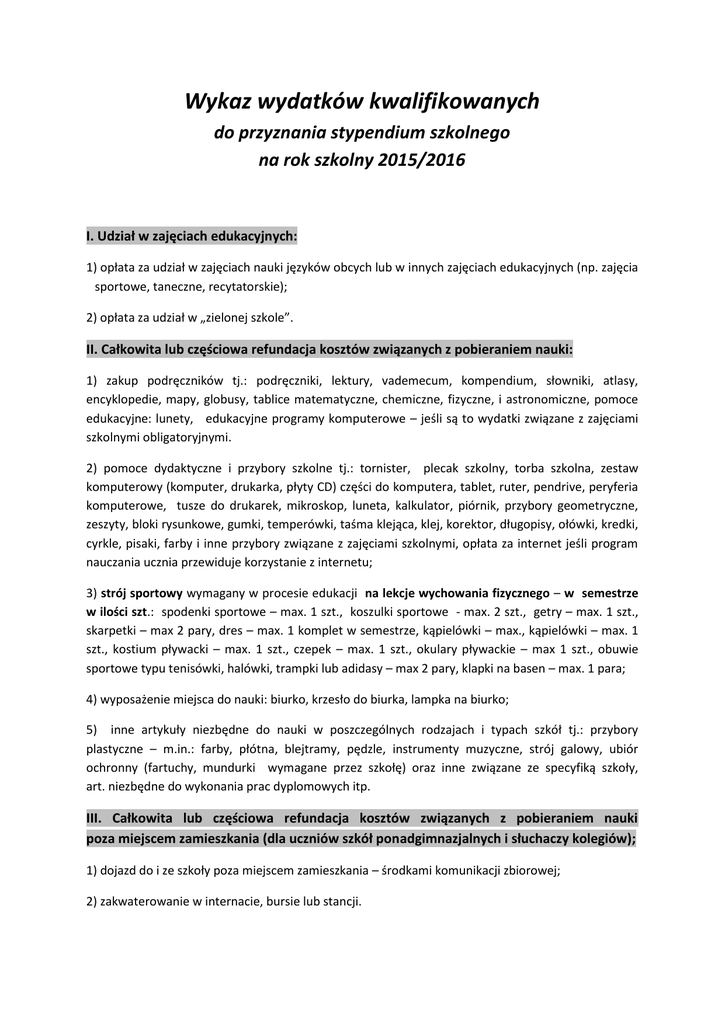 Wykaz wydatków kwalifikowanych do przyznania stypendium szkolnego na rok szkolny 2015/2016 I. Udział w zajęciach edukacyjnych: 1) opłata za udział w zajęciach nauki języków obcych lub w innych zajęciach edukacyjnych (np. zajęcia sportowe, taneczne, recytatorskie); 2) opłata za udział w „zielonej szkole”. II. Całkowita lub częściowa refundacja kosztów związanych z pobieraniem nauki: 1) zakup podręczników tj.: podręczniki, lektury, vademecum, kompendium, słowniki, atlasy, encyklopedie, mapy, globusy, tablice matematyczne, chemiczne, fizyczne, i astronomiczne, pomoce edukacyjne: lunety, edukacyjne programy komputerowe – jeśli są to wydatki związane z zajęciami szkolnymi obligatoryjnymi. 2) pomoce dydaktyczne i przybory szkolne tj.: tornister, plecak szkolny, torba szkolna, zestaw komputerowy (komputer, drukarka, płyty CD) części do komputera, tablet, ruter, pendrive, peryferia komputerowe, tusze do drukarek, mikroskop, luneta, kalkulator, piórnik, przybory geometryczne, zeszyty, bloki rysunkowe, gumki, temperówki, taśma klejąca, klej, korektor, długopisy, ołówki, kredki, cyrkle, pisaki, farby i inne przybory związane z zajęciami szkolnymi, opłata za internet jeśli program nauczania ucznia przewiduje korzystanie z internetu; 3) strój sportowy wymagany w procesie edukacji na lekcje wychowania fizycznego – w semestrze w ilości szt.: spodenki sportowe – max. 1 szt., koszulki sportowe - max. 2 szt., getry – max. 1 szt., skarpetki – max 2 pary, dres – max. 1 komplet w semestrze, kąpielówki – max., kąpielówki – max. 1 szt., kostium pływacki – max. 1 szt., czepek – max. 1 szt., okulary pływackie – max 1 szt., obuwie sportowe typu tenisówki, halówki, trampki lub adidasy – max 2 pary, klapki na basen – max. 1 para; 4) wyposażenie miejsca do nauki: biurko, krzesło do biurka, lampka na biurko; 5) inne artykuły niezbędne do nauki w poszczególnych rodzajach i typach szkół tj.: przybory plastyczne – m.in.: farby, płótna, blejtramy, pędzle, instrumenty muzyczne, strój galowy, ubiór ochronny (fartuchy, mundurki wymagane przez szkołę) oraz inne związane ze specyfiką szkoły, art. niezbędne do wykonania prac dyplomowych itp. III. Całkowita lub częściowa refundacja kosztów związanych z pobieraniem nauki poza miejscem zamieszkania (dla uczniów szkół ponadgimnazjalnych i słuchaczy kolegiów); 1) dojazd do i ze szkoły poza miejscem zamieszkania – środkami komunikacji zbiorowej; 2) zakwaterowanie w internacie, bursie lub stancji.