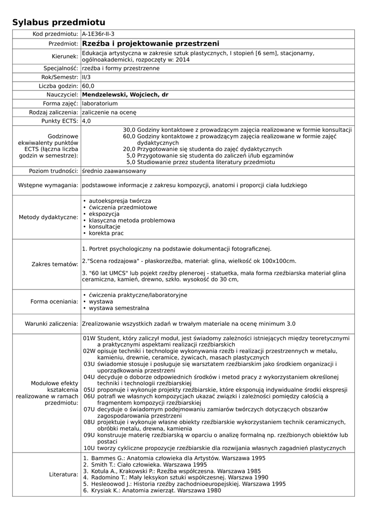 Sylabus przedmiotu Kod przedmiotu: A-1E36r-II-3 Przedmiot: Kierunek: Rzeźba i projektowanie przestrzeni Edukacja artystyczna w zakresie sztuk plastycznych, I stopień [6 sem], stacjonarny, ogólnoakademicki, rozpoczęty w: 2014 Specjalność: rzeźba i formy przestrzenne Rok/Semestr: II/3 Liczba godzin: 60,0 Nauczyciel: Mendzelewski, Wojciech, dr Forma zajęć: laboratorium Rodzaj zaliczenia: zaliczenie na ocenę Punkty ECTS: 4,0 30,0 Godziny kontaktowe z prowadzącym zajęcia realizowane w formie konsultacji 60,0 Godziny kontaktowe z prowadzącym zajęcia realizowane w formie zajęć dydaktycznych 20,0 Przygotowanie się studenta do zajęć dydaktycznych 5,0 Przygotowanie się studenta do zaliczeń i/lub egzaminów 5,0 Studiowanie przez studenta literatury przedmiotu Godzinowe ekwiwalenty punktów ECTS (łączna liczba godzin w semestrze): Poziom trudności: średnio zaawansowany Wstępne wymagania: podstawowe informacje z zakresu kompozycji, anatomi i proporcji ciała ludzkiego • • • Metody dydaktyczne: • • • autoekspresja twórcza ćwiczenia przedmiotowe ekspozycja klasyczna metoda problemowa konsultacje korekta prac 1. Portret psychologiczny na podstawie dokumentacji fotograficznej. Zakres tematów: 2."Scena rodzajowa" - płaskorzeźba, materiał: glina, wielkość ok 100x100cm. 3. "60 lat UMCS" lub pojekt rzeźby pleneroej - statuetka, mała forma rzeźbiarska materiał glina ceramiczna, kamień, drewno, szkło. wysokość do 30 cm, • ćwiczenia praktyczne/laboratoryjne Forma oceniania: • wystawa • wystawa semestralna Warunki zaliczenia: Zrealizowanie wszystkich zadań w trwałym materiale na ocenę minimum 3.0 Modułowe efekty kształcenia realizowane w ramach przedmiotu: 01W Student, który zaliczył moduł, jest świadomy zależności istniejących między teoretycznymi a praktycznymi aspektami realizacji rzeźbiarskich 02W opisuje techniki i technologie wykonywania rzeźb i realizacji przestrzennych w metalu, kamieniu, drewnie, ceramice, żywicach, masach plastycznych 03U świadomie stosuje i posługuje się warsztatem rzeźbiarskim jako środkiem organizacji i uporządkowania przestrzeni 04U decyduje o doborze odpowiednich środków i metod pracy z wykorzystaniem określonej techniki i technologii rzeźbiarskiej 05U proponuje i wykonuje projekty rzeźbiarskie, które eksponują indywidualne środki ekspresji 06U potrafi we własnych kompozycjach ukazać związki i zależności pomiędzy całością a fragmentem kompozycji rzeźbiarskiej 07U decyduje o świadomym podejmowaniu zamiarów twórczych dotyczących obszarów zagospodarowania przestrzeni 08U projektuje i wykonuje własne obiekty rzeźbiarskie wykorzystaniem technik ceramicznych, obróbki metalu, drewna, kamienia 09U konstruuje materię rzeźbiarską w oparciu o analizę formalną np. rzeźbionych obiektów lub postaci 10U tworzy cykliczne propozycje rzeźbiarskie dla rozwijania własnych zagadnień plastycznych 1. 2. 3. Literatura: 4. 5. 6. Bammes G.: Anatomia człowieka dla Artystów. Warszawa 1995 Smith T.: Ciało człowieka. Warszawa 1995 Kotula A., Krakowski P.: Rzeźba współczesna. Warszawa 1985 Radomino T.: Mały leksykon sztuki współczesnej. Warszwa 1990 Hesleoowod J.: Historia rzeźby zachodnioeuropejskiej. Warszawa 1995 Krysiak K.: Anatomia zwierząt. Warszawa 1980 Dodatkowe informacje: kontakt: [email protected]