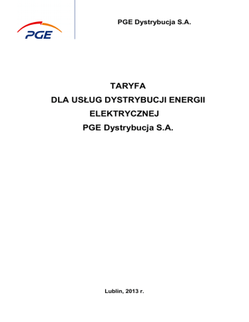 PGE Dystrybucja S.A. TARYFA DLA USŁUG DYSTRYBUCJI ENERGII ELEKTRYCZNEJ PGE Dystrybucja S.A. Lublin, 2013 r. SPIS TREŚCI 1. INFORMACJE OGÓLNE ............................................................................................. 4 2. ZASADY ROZLICZEŃ ZA ŚWIADCZONE USŁUGI DYSTRYBUCJI ......................... 7 2.1. Zasady kwalifikacji odbiorców do grup taryfowych ................................................ 7 2.2. Strefy czasowe stosowane w rozliczeniach z odbiorcami ................................... 12 2.3. Okresy rozliczeniowe stosowane w rozliczeniach z odbiorcami i ogólne zasady rozliczeń ....................................................................................................... 15 2.4. Zasady korygowania wystawionych faktur ............................................................ 19 3. SZCZEGÓŁOWE ZASADY ROZLICZEŃ USŁUG DYSTRYBUCYJNYCH ............... 20 3.1. Opłaty za usługę dystrybucji energii elektrycznej ................................................ 20 3.2. Moc umowna ............................................................................................................ 22 3.3. Pewność zasilania odbiorców................................................................................. 23 3.4. Rozliczenia z odbiorcami za ponadumowny pobór energii biernej ..................... 24 3.5. Bonifikaty za niedotrzymanie standardów jakościowych obsługi odbiorców i parametrów jakościowych energii ........................................................................ 26 ZASADY USTALANIA OPŁAT ZA PRZYŁĄCZANIE PODMIOTÓW DO SIECI ....... 29 OPŁATY ZA USŁUGI WYKONYWANE NA DODATKOWE ZLECENIE ODBIORCY ................................................................................................................ 32 6. OPŁATY ZA NIELEGALNE POBIERANIE ENERGII ................................................ 34 7. STAWKI OPŁAT ZA USŁUGI DYSTRYBUCJI I STAWKI OPŁAT ABONAMENTOWYCH DLA POSZCZEGÓLNYCH GRUP TARYFOWYCH ............ 37 7.1. Oddział Białystok ..................................................................................................... 37 7.1.1. Grupa taryfowa A23 ............................................................................................... 37 7.1.2. Grupy taryfowe B11, B21, B22, B23 ...................................................................... 38 7.1.3. Grupy taryfowe C21, C22a, C22b .......................................................................... 39 7.1.4. Grupy taryfowe C11, C12a, C12b .......................................................................... 40 7.1.5. Grupa taryfowa R ................................................................................................... 40 7.1.6. Grupy taryfowe G11, G12, G12w ........................................................................... 41 7.2. Oddział Lublin .......................................................................................................... 42 7.2.1. Grupy taryfowe A23, A24 ....................................................................................... 42 7.2.2. Grupy taryfowe B11, B21, B22, B23, B24 .............................................................. 43 7.2.3. Grupy taryfowe C21, C22a, C22b, C23, C24 ......................................................... 44 4. 5. 7.2.4. Grupy taryfowe C11s, C11, C12a, C12b, C12n, C12w .......................................... 45 7.2.5. Grupa taryfowa R ................................................................................................... 45 7.2.6. Grupy taryfowe G11s, G11, G12, G12n, G12w ...................................................... 46 7.3. Oddział Łódź-Miasto ................................................................................................ 47 7.3.1. Grupa taryfowa A23 ............................................................................................... 47 7.3.2. Grupy taryfowe B11, B21, B22, B23 ...................................................................... 48 7.3.3. Grupy taryfowe C21, C22a, C22b .......................................................................... 49 7.3.4. Grupy taryfowe S11c, C11, C12a, C12b ................................................................ 50 7.3.5. Grupy taryfowe C11o, C12o ................................................................................... 51 Taryfa PGE Dystrybucja S.A. Strona 2 z 83 7.3.6. Grupa taryfowa R ................................................................................................... 51 7.3.7. Grupy taryfowe S11g, G11, G12, G12w ................................................................. 52 7.4. Oddział Łódź-Teren .................................................................................................. 53 7.4.1. Grupa taryfowa A23 ............................................................................................... 53 7.4.2. Grupy taryfowe B11, B21, B22, B23 ...................................................................... 54 7.4.3. Grupy taryfowe C21, C22a, C22b, C23 .................................................................. 55 7.4.4. Grupy taryfowe C11, C12a, C12b, C13 .................................................................. 56 7.4.5. Grupa taryfowa C11o. ............................................................................................ 57 7.4.6. Grupa taryfowa R ................................................................................................... 57 7.4.7. Grupy taryfowe G11, G12, G12w, G12a ................................................................ 58 7.5. Oddział Rzeszów ...................................................................................................... 59 7.5.1. Grupa Taryfowa A23 .............................................................................................. 59 7.5.2. Grupy taryfowe B11, B21, B22, B23 ................................................................