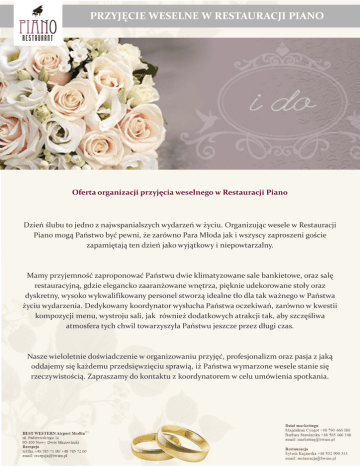 PRZYJĘCIE WESELNE W RESTAURACJI PIANO Oferta organizacji przyjęcia weselnego w Restauracji Piano Dzień ślubu to jedno z najwspanialszych wydarzeń w życiu. Organizując wesele w Restauracji Piano mogą Państwo być pewni, że zarówno Para Młoda jak i wszyscy zaproszeni goście zapamiętają ten dzień jako wyjątkowy i niepowtarzalny. Mamy przyjemność zaproponować Państwu dwie klimatyzowane sale bankietowe, oraz salę restauracyjną, gdzie elegancko zaaranżowane wnętrza, pięknie udekorowane stoły oraz dyskretny, wysoko wykwalifikowany personel stworzą idealne tło dla tak ważnego w Państwa życiu wydarzenia. Dedykowany koordynator wysłucha Państwa oczekiwań, zarówno w kwestii kompozycji menu, wystroju sali, jak również dodatkowych atrakcji tak, aby szczęśliwa atmosfera tych chwil towarzyszyła Państwu jeszcze przez długi czas. Nasze wieloletnie doświadczenie w organizowaniu przyjęć, profesjonalizm oraz pasja z jaką oddajemy się każdemu przedsięwzięciu sprawią, iż Państwa wymarzone wesele stanie się rzeczywistością. Zapraszamy do kontaktu z koordynatorem w celu umówienia spotkania. Zadbamy o: Rezerwację sali weselnej Skomponowanie uroczystego menu Zorganizowanie wcześniejszej degustacji potraw Miłą i profesjonalną obsługę Zapewnienie noclegów dla gości weselnych Zamówienie tortu weselnego Degustację potraw weselnych W trakcie przyjęcia: Uroczyste powitanie chlebem i solą Toast winem musującym Ekran multimedialny do wyświetlania zdjęć Bezpłatny parking hotelowy Możliwość wzbogacenia uroczystości o: Stoły tematyczne: stół wiejski, stoły kuchni narodowościowych (np.. włoski, hiszpański, sushi) Bogaty bufet deserowy z udziałem cukiernika przygotowującego słodkie specjały Fontannę czekoladową z podświetleniem led, owocami i rurkami Oprawę artystyczną: występ kabaretu, iluzjonisty, zespołu muzycznego, DJ' a Obecność konferansjera Po przyjęciu: Romantyczny apartament dla Młodej Pary Wykwintne „śniadanie dla dwojga” serwowane w pokoju Specjalne ceny pokoi dla gości weselnych Doradzimy w kwestiach: Dodatkowej dekoracji stołów i sal Zorganizowania oryginalnej sesji fotograficznej w malowniczych zakątkach Twierdzy Modlin Wyboru salonu fryzjerskiego i wizażystki Wynajęcia: samochodów old mobile, czy stylowej dorożki Zorganizowania opieki dla dzieci w trakcie przyjęcia Zamówienia akcesoriów ślubnych (winietek, księgi wpisów weselnych, okazjonalnych etykiet na butelki z alkoholem, pamiątkowych mini prezentów dla gości) Zorganizowania transportu dla gości weselnych Proponowane menu Menu I ZUPA SERWOWANA Rosół królewski z makaronem aromatyzowanym liśćmi świeżej maggi DANIE GŁÓWNE SERWOWANE Kieszonka schabowa z pieczarkami, podana z ziemniakami pieczonymi w zio łach, i brokułami w prażonych migdałach II DANIE CIEPŁE (około 19:00) Medaliony drobiowe w chrupiącej panierce kukurydzianej z dodatkiem sosu pieczarkowego, kopytkami tymiankowymi i delikatnym bukietem sałat III DANIE CIEPŁE (około 21:00) Filet z dorsza w sosie koperkowym w towarzystwie fasolki szparagowej i risotto maślano - limonkowym IV DANIE CIEPŁE (około 23:00) Potrawka starofrancuska z chrupiącą bagietką V DANIE CIEPŁE (około 01:00) Barszcz czerwony z pasztecikiem z ciasta francuskiego DESERY Sernik wiedeński Szarlotka z polskiej antonówki Ciasto biszkoptowe z kremem śmietankowym Musy owocowe w kieliszkach Proponowane menu Menu I PRZEKĄSKI ZIMNE W BUFECIE Mięsne Półmisek pieczonych mięs i pasztetów Roladka z kurczaka w trzech odsłonach (papryka, gorgonzola, szpinak) Pieczona pierś z indyka przeplatana brzoskwinią pod jabłkową galaretką Tatar wołowy z piklami (serwowany podczas przyjęcia) Rybne Kruche babeczki z musem z wędzonej makreli z kaparami Rolada z ryby faszerowana bakaliami Śledź na trzy sposoby (w śmietanie, salsie pomidorowej, oleju) Warzywne Terrina z wędzonym serem i warzywami Kisz z kapustą kiszoną i grzybami leśnymi Cukinia nadziewana puszystym serkiem ziołowym Sałatki Tradycyjna sałatka jarzynowa Sałatka z grillowanym kurczakiem i ananasem Sałatka grecka z serem fetą i oliwkami DODATKI Dipy: sos tatarski, śmietanowo - chrzanowy, żurawinowy, ćwikła, salsa pomidorowa, czosnkowy, miodowo - musztardowy Pikle (marynowane grzyby, ogórki, papryka, śliwki) Masło (śmietankowe, ziołowe, czosnkowe) Pieczywo chrupkie (ciemne, jasne, ziarniste) W CENIE PAKIETU Kawa Herbata Kieliszek wina musującego Podstawowa dekoracja kwiatowa ( kompozycja kwiatowa dla Państwa Młodych, kompozycja kwiatowa na stoły dla gości – róża / eustoma ) świece Koszt 180zł/os. Dzieci do 6-go roku życia 50% ceny Dzieci do 3-go roku życia BEZPŁATNIE Proponowane menu Menu II ZUPA SERWOWANA Flaki staropolskie doprawione imbirem DANIE GŁÓWNE SERWOWANE Eskalopki wieprzowe z domowymi kopytkami i surówką z marchewki ze świeżo tartym chrzanem II DANIE CIEPŁE (około 19:00) Delikatna roladka z kurczaka ze szpinakiem podana z puszystym puree ziemniaczanym z dodatkiem warzyw gotowanych na parze III DANIE CIEPŁE (około 21:00) Filet z karmazyna w sosie śmietanowo - porowym z ryżem i surówką z kalarepy IV DANIE CIEPŁE (około 23:00) Żurek na wędzonce z białą kiełbasą i jajkiem V DANIE CIEPŁE (około 01:00) Barszcz czerwony z pasztecikiem DESERY Sernik wiedeński Szarlotka z polskiej antonówki Ciasto biszkoptowe z kremem śmietankowym Musy owocowe w kieliszkach Proponowane menu Menu II PRZEKĄSKI ZIMNE W BUFECIE Mięsne Tatar wołowy z piklami (serwowany podczas przyjęcia) Półmisek mięs pieczonych i pasztetów Nóżki w galarecie Terrina drobiowa z bazylią w bekonie Rybne Różyczki z łososia z kremowym serkiem i sosem limonkowym Sandacz pod korzenną galaretą z pieczoną papryką Trio śledziowe- w śmietanie, salsie pomidorowej, w oleju Warzywne Terrina z wędzonym serem i warzywami Kisz z kapustą kiszoną i grzybami leśnymi Cukinia nadziewana puszystym serkiem z