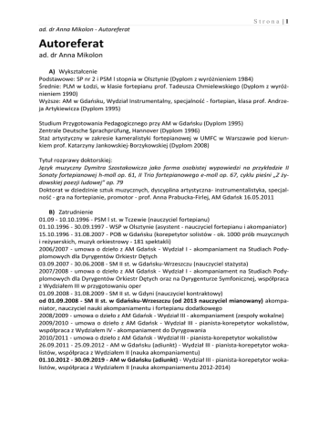 Strona |1 ad. dr Anna Mikolon - Autoreferat Autoreferat ad. dr Anna Mikolon A) Wykształcenie Podstawowe: SP nr 2 i PSM l stopnia w Olsztynie (Dyplom z wyróżnieniem 1984) Średnie: PLM w Łodzi, w klasie fortepianu prof. Tadeusza Chmielewskiego (Dyplom z wyróżnieniem 1990) Wyższe: AM w Gdańsku, Wydział Instrumentalny, specjalność - fortepian, klasa prof. Andrzeja Artykiewicza (Dyplom 1995) Studium Przygotowania Pedagogicznego przy AM w Gdańsku (Dyplom 1995) Zentrale Deutsche Sprachprüfung, Hannover (Dyplom 1996) Staż artystyczny w zakresie kameralistyki fortepianowej w UMFC w Warszawie pod kierunkiem prof. Katarzyny Jankowskiej-Borzykowskiej (Dyplom 2008) Tytuł rozprawy doktorskiej: Język muzyczny Dymitra Szostakowicza jako forma osobistej wypowiedzi na przykładzie II Sonaty fortepianowej h-moll op. 61, II Trio fortepianowego e-moll op. 67, cyklu pieśni „Z żydowskiej poezji ludowej” op. 79 Doktorat w dziedzinie sztuk muzycznych, dyscyplina artystyczna- instrumentalistyka, specjalność - gra na fortepianie, promotor - prof. Anna Prabucka-Firlej, AM Gdańsk 16.05.2011 B) Zatrudnienie 01.09 - 10.10.1996 - PSM l st. w Tczewie (nauczyciel fortepianu) 01.10.1996 - 30.09.1997 - WSP w Olsztynie (asystent - nauczyciel fortepianu i akompaniator) 15.10.1996 - 31.08.2007 - POB w Gdańsku (korepetytor solistów - ok. 1000 prób muzycznych i reżyserskich, muzyk orkiestrowy - 181 spektakli) 2006/2007 - umowa o dzieło z AM Gdańsk - Wydział I - akompaniament na Studiach Podyplomowych dla Dyrygentów Orkiestr Dętych 03.09.2007 - 30.06.2008 - SM II st. w Gdańsku-Wrzeszczu (nauczyciel stażysta) 2007/2008 - umowa o dzieło z AM Gdańsk - Wydział I - akompaniament na Studiach Podyplomowych dla Dyrygentów Orkiestr Dętych oraz na Dyrygenturze Symfonicznej, współpraca z Wydziałem III w przygotowaniu oper 01.09.2008 - 31.08.2009 - SM II st. w Gdyni (nauczyciel kontraktowy) od 01.09.2008 - SM II st. w Gdańsku-Wrzeszczu (od 2013 nauczyciel mianowany) akompaniator, nauczyciel nauki akompaniamentu i fortepianu dodatkowego 2008/2009 - umowa o dzieło z AM Gdańsk - Wydział III - akompaniament (zespoły wokalne) 2009/2010 - umowa o dzieło z AM Gdańsk - Wydział III - pianista-korepetytor wokalistów, współpraca z Wydziałem IV - akompaniament do Dyrygowania 2010/2011 - umowa o dzieło z AM Gdańsk - Wydział III - pianista-korepetytor wokalistów 26.09.2011 - 25.09.2012 - AM w Gdańsku (adiunkt) - Wydział III - pianista-korepetytor wokalistów, współpraca z Wydziałem II (nauka akompaniamentu) 01.10.2012 - 30.09.2019 - AM w Gdańsku (adiunkt) - Wydział III - pianista-korepetytor wokalistów, współpraca z Wydziałem II (nauka akompaniamentu 2012-2014) Strona |2 ad. dr Anna Mikolon - Autoreferat C) Jako osiągnięcie wynikające z art. 16 ust. 2 ustawy z dnia 14 marca 2003 roku o stopniach naukowych i tytule naukowym oraz o stopniach i tytule w zakresie sztuki (Dz. U. nr 65, poz. 595 ze zm.) wskazuję publikację książkową stanowiącą wraz z dwiema płytami integralną całość dzieła naukowo-artystycznego: Specyfika pracy pianisty-korepetytora wokalistów (wyd. Polihymnia, Lublin 2016), Shakespeare Songs - Krzysztof Bobrzecki - baryton, Anna Mikolon - fortepian (AP0352) Roger Quilter - Five Shakespeare Songs op. 23, Three Shakespeare Songs op. 6, Four Shakespeare Songs op. 30, Erich Wolfgang Korngold - Songs of The Clown op. 29, Gerald Finzi - Let Us Garlands Bring op. 18 CD - nagrania - wybrane pieśni i arie z różnych płyt wydanych po uzyskaniu tytułu doktora: The Nightingale - Katarzyna Dondalska - sopran koloraturowy, Anna Mikolon - fortepian (AP0290) 1. Nikołaj Rimski-Korsakow - Gdy kocha słowik róży pąk op. 2 nr 2 2. Dominick Argento - Spring 3. Karol Szymanowski - Słowik op. 31 nr 2 4. Hans Pfitzner - Singt mein Schatz wie ein Fink op. 33 nr 5 Michał Kleofas Ogiński - Romanse wokalne - Jacek Szymański - tenor, Anna Mikolon - fortepian (SL 056-2) 5. Zamilcz, ach zamilcz 6. Przebudzenie 7. Przy boku twym 8. Minęły błogie dni 9. Rodzinna wieś Pieśni kompozytorów gdańskich - Alicja Rumianowska - mezzosopran, Aleksandra Kucharska-Szefler - sopran, Anna Mikolon - fortepian (MTS CD-023) 10. Władysław Walentynowicz - Akacje z tryptyku Kwiaty 11. Władysław Walentynowicz - Tańcowały dwa Michały - duet 12. Konrad Pałubicki - Czymże jest kwiat z cyklu Refleksje 13. Konrad Pałubicki - Gdy motyl z cyklu Refleksje 14. Henryk Hubertus Jabłoński - Psałterz 15. Henryk Hubertus Jabłoński - Pogoda późnej jesieni 16. Henryk Hubertus Jabłoński - Pierwszy bal Pieśni i arie - Kazimierz Sergiel - bas, Anna Mikolon - fortepian (SL 068-2) 17. Stanisław Moniuszko - Stary kapral 18. Fryderyk Chopin - Śpiew z mogiły Gdański Festiwal Muzyczny 2014, Marta Świderska - mezzosopran, Anna Mikolon - fortepian, nagranie koncertu na żywo (11.04.2014) i transmisja radiowa (21.04.2014), Radio Gdańsk 19. Johannes Brahms - Wie melodien zieht es mir op. 105 nr 1 20. Stanisław Niewiadomski - Dzwony 21. Fryderyk Chopin - Piosnka litewska op. 74 no 16 22. Jules Massenet - Aria Charlotte z opery Werther 23. Stanisław Moniuszko - Dumka Jadwigi z opery Straszny Dwór Strona |3 ad. dr Anna Mikolon - Autoreferat Niedługo minie 20 lat mojej pracy pianisty, kameralisty, korepetytora wokalistów, z których 11 spędziłam w Operze Bałtyckiej. Zagrałam ok. 1000 prób muzycznych i reżyserskich, jeszcze większą ilość prób indywidualnych lub w małych zespołach oraz 180 spektakli jako muzyk orkiestrowy (w wielu operach znajdziemy partie fortepianu, klawesynu, organów i czelesty). „Kanon” oper musiałam opanować w ekspresowym tempie. Stale poszerzałam repertuar na kolejne przesłuchania solistów i muzyków orkiestrowych. Czytanie a vista, dobre rozumienie dużych form, znajomość tradycji wykonawczych, umiejętność odczytywania w partyturze tego co ważne, gdy jest właściwie pod względem pianistycznym niewykonalna i wreszcie znajomość wszystkich 