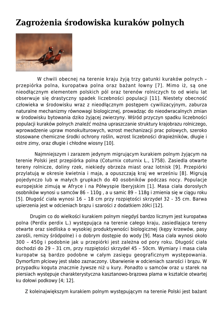 Zagrożenia środowiska kuraków polnych W chwili obecnej na terenie kraju żyją trzy gatunki kuraków polnych – przepiórka polna, kuropatwa polna oraz bażant łowny [7]. Mimo iż, są one nieodłącznym elementem polskich pól oraz terenów rolniczych to od wielu lat obserwuje się drastyczny spadek liczebności populacji [11]. Niestety obecność człowieka w środowisku wraz z nieodłącznym postępem cywilizacyjnym, zaburza naturalne mechanizmy równowagi biologicznej, prowadząc do nieodwracalnych zmian w środowisku bytowania dziko żyjącej zwierzyny. Wśród przyczyn spadku liczebności populacji kuraków polnych znaleźć można upraszczanie struktury krajobrazu rolniczego, wprowadzenie upraw monokulturowych, wzrost mechanizacji prac polowych, szeroko stosowane chemiczne środki ochrony roślin, wzrost liczebności drapieżników, długie i ostre zimy, oraz długie i chłodne wiosny [10]. Najmniejszym i zarazem jedynym migrującym kurakiem polnym żyjącym na terenie Polski jest przepiórka polna (Coturnix coturnix L., 1758). Zasiedla otwarte tereny rolnicze, doliny rzek, niekiedy obrzeża miast oraz lotnisk [9]. Przepiórki przylatują w okresie kwietnia i maja, a opuszczają kraj we wrześniu [8]. Migrują pojedynczo lub w małych grupkach do 40 osobników podczas nocy. Populacje europejskie zimują w Afryce i na Półwyspie Iberyjskim [1]. Masa ciała dorosłych osobników wynosi u samców 86 – 110g , a u samic 89 – 118g i zmienia się w ciągu roku [5]. Długość ciała wynosi 16 – 18 cm przy rozpiętości skrzydeł 32 - 35 cm. Barwa upierzenia jest w odcieniach brązu i szarości z dodatkiem żółci [12]. Drugim co do wielkości kurakiem polnym niegdyś bardzo licznym jest kuropatwa polna (Perdix perdix L.) występująca na terenie całego kraju, zasiedlająca tereny otwarte oraz siedliska o wysokiej produktywności biologicznej (kępy krzewów, pasy zarośli, remizy śródpolne) i o dobrym dostępie do wody [9]. Masa ciała wynosi około 300 – 450g i podobnie jak u przepiórki jest zależna od pory roku. Długość ciała dochodzi do 29 – 31 cm, przy rozpiętości skrzydeł 45 – 50cm. Wymiary i masa ciała kuropatw są bardzo podobne w całym zasięgu geograficznym występowania. Dymorfizm płciowy jest słabo zaznaczony. Ubarwienie w odcieniach szarości i brązu. W przypadku koguta znacznie żywsze niż u kury. Ponadto u samców oraz u starek na piersiach występuje charakterystyczna kasztanowo-brązowa plama w kształcie otwartej ku dołowi podkowy [4; 12]. Z koleinajwiększym kurakiem polnym występującym na terenie Polski jest bażant łowny (Phasianus colchicus). Przedstawia on krzyżówkę wielu podgatunków [5; 12]. Istnieje bowiem wyraźna zmienność geograficzna tego gatunku [9]. Pierwotnie występował na terenie całej Azji Środkowej od Kaukazu aż po wybrzeże Pacyfiku i Japonii [5]. Introdukowany do wielu krajów, zasiedla niziny i tereny podgórskie, preferując obszary trawiaste oraz agrocenozy z grupkami krzewów i remizami, nadrzeczne zarośla, szuwary i trzciny oraz niewielkie podszyte lasy [9]. Do Polski pierwsze bażanty dotarły dopiero pod koniec XVII w. [12]. Ubarwienie dorosłego koguta jest bardzo urozmaicone. Głowa i szyja granatowa z zielonkawym lub niebiesko-zielonkawym połyskiem metalicznym. Na szyi przeważnie występuje pierścień z białych piór (obroża), jednakże nie jest to konieczność [5]. Boki głowy koguta pozbawione są piór tworząc tzw. różę (płatowate wyrostki skórne barwy czerwonej. Wole i pierś miedzianoczerwone, brzuch czarny bez połysku. Upierzenie karku i tułowia złocistopomarańczowe z czarnym zakończeniem piór. Ogon koguta zdecydowanie dłuższy niż u kur. Ubarwienie kur skromne jednolite w odcieniach od beżu do brązu z czarnymi lub brązowymi plamkami [12]. Masa ciała dorosłych osobników waha się w granicach od 1100 – 1300g (samce) oraz 800 – 1000 (samice). Długość ciała wynosi 53 – 90cm, przy czym długość ogona to 20 – 47cm, przy rozpiętości skrzydeł 70 – 90cm [9]. Zagrożenia środowiska bytowania kuraków We współczesnych czasach trudno znaleźć łowiska w których zachowały się naturalne biotopy. Negatywne dla wielu gatunków zmiany w ekosystemach i elementach krajobrazu w dużej mierze pogorszyły środowisko bytowania kuraków polnych. Niestety brak mozaiki pól, łąk, ściernisk i nieużytków, miedz, pozostawionych fragmentów pól czy remiz wpływa na pogorszenie jakości środowiska. Rozwijające się rolnictwo wykorzystujące każdy dostępny kawałek ziemi, likwiduje tym samym owe nieużytki, miedze, remizy, ograniczając tym samym miejsce bezpiecznego gniazdowania oraz doprowadza do zubożenia bazy pokarmowej [1]. Wśród kuraków polnych szczególnie duży wpływ zmiany te wywierają na kuropatwę polną, która jest gatunkiem silnie terytorialnym. Wzrost kultury rolnej wpływa również wysoko istotnie na zubożenie bazy pokarmowej, poprzez stosowanie różnego rodzaju środków owadobójczych. Pokarm owadzi ma szczególne znaczenie dla wzrostu i rozwoju piskląt, które do 2 tygodnia życia żywią się nim tylko i wyłącznie. Liczne badania wskazują, że brak pokarmu owadziego, bądź jego nie wystarczająca ilość wpływają w znaczny sposób na obniżenie przeżywalności piskląt [1]. Większość strat piskląt zachodzących od wyklucia do osiągnięcia wielkości osobników dorosłych ma właśnie miejsce w pierwszych 2 – 3. tygodniach życia [11]. Na większości obszarów można zaobserwować negatywną działalność człowieka. Wprowadzono bowiem mechanizację, chemizację i intensyfikację rolnictwa, uprawy monokulturowe, rozwinęło się budownictwo oraz sieć dróg i autostrad. Pojawiła się nieodłączna fragmentacja środowiska. Działalność człowieka stała się istotna w kształtowaniu zarówno środowiska bytowania jak i liczebności kuraków polnych. Zdaniem Dudzińskiego to właśnie działalność człowi