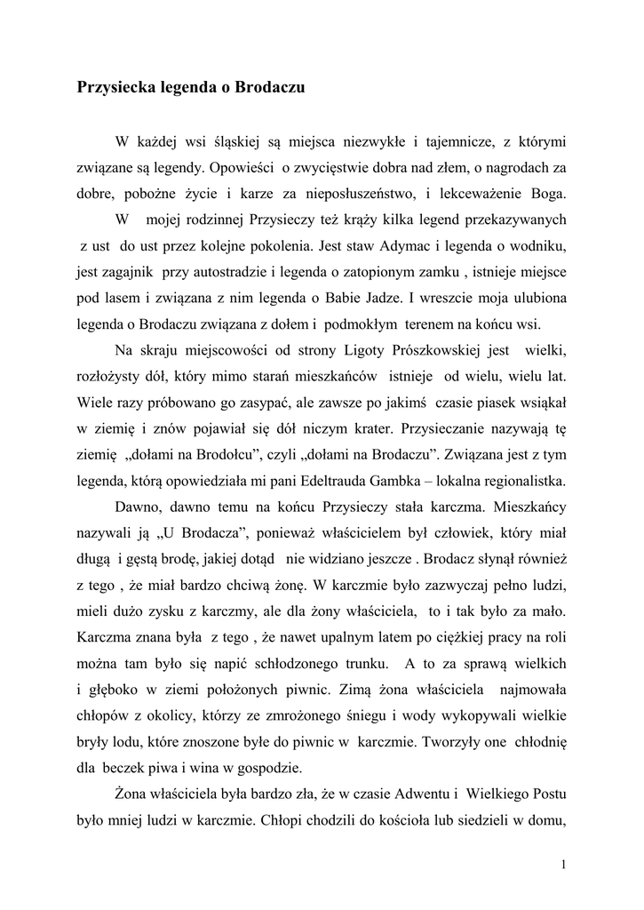 Przysiecka legenda o Brodaczu W każdej wsi śląskiej są miejsca niezwykłe i tajemnicze, z którymi związane są legendy. Opowieści o zwycięstwie dobra nad złem, o nagrodach za dobre, pobożne życie i karze za nieposłuszeństwo, i lekceważenie Boga. W mojej rodzinnej Przysieczy też krąży kilka legend przekazywanych z ust do ust przez kolejne pokolenia. Jest staw Adymac i legenda o wodniku, jest zagajnik przy autostradzie i legenda o zatopionym zamku , istnieje miejsce pod lasem i związana z nim legenda o Babie Jadze. I wreszcie moja ulubiona legenda o Brodaczu związana z dołem i podmokłym terenem na końcu wsi. Na skraju miejscowości od strony Ligoty Prószkowskiej jest wielki, rozłożysty dół, który mimo starań mieszkańców istnieje od wielu, wielu lat. Wiele razy próbowano go zasypać, ale zawsze po jakimś czasie piasek wsiąkał w ziemię i znów pojawiał się dół niczym krater. Przysieczanie nazywają tę ziemię „dołami na Brodołcu”, czyli „dołami na Brodaczu”. Związana jest z tym legenda, którą opowiedziała mi pani Edeltrauda Gambka – lokalna regionalistka. Dawno, dawno temu na końcu Przysieczy stała karczma. Mieszkańcy nazywali ją „U Brodacza”, ponieważ właścicielem był człowiek, który miał długą i gęstą brodę, jakiej dotąd nie widziano jeszcze . Brodacz słynął również z tego , że miał bardzo chciwą żonę. W karczmie było zazwyczaj pełno ludzi, mieli dużo zysku z karczmy, ale dla żony właściciela, to i tak było za mało. Karczma znana była z tego , że nawet upalnym latem po ciężkiej pracy na roli można tam było się napić schłodzonego trunku. A to za sprawą wielkich i głęboko w ziemi położonych piwnic. Zimą żona właściciela najmowała chłopów z okolicy, którzy ze zmrożonego śniegu i wody wykopywali wielkie bryły lodu, które znoszone byłe do piwnic w karczmie. Tworzyły one chłodnię dla beczek piwa i wina w gospodzie. Żona właściciela była bardzo zła, że w czasie Adwentu i Wielkiego Postu było mniej ludzi w karczmie. Chłopi chodzili do kościoła lub siedzieli w domu, 1 szanując prawo Boże. Pewnego dnia, a było to w Wielkim Poście, żona Brodacza bardzo się zdenerwowała, że nie było klientów , a w tym roku straty były ogromne. Gospodyni myślała więc, co by tu zrobić. Myślała i myślała, aż w końcu wymyśliła. Urządziła w Wielki Piątek huczną zabawę w karczmie. Grajków zamówiła, ciasta napiekła, różne mięsa przygotowała i oczywiście wina ani piwa nie zabrakło. Zwabiła dużo ludzi do karczmy, chłopi zamiast do kościoła, to do karczmy poszli. Zamiast post utrzymać, to mięso jedli, wino pili i huczną zabawę zrobili. W pewnym momencie, gdy wszyscy się świetnie bawili, do drzwi ktoś zapukał. Gospodyni szybko otworzyła, bo myślała, że następny klient, a za drzwiami stał żebrak. - Czy mógłbym dostać szklankę wody? – zapytał cicho. Gospodyni zaraz zauważyła , że żadnego zysku z tego nie będzie miała, więc wyrzuciła go i zamknęła drzwi. Żebrak przeklął karczmę i jej właścicieli. Nie wiadomo do tej pory, czy tym żebrakiem nie był sam pan Jezus. Kiedy następnego dnia w Wielką Sobotę ludzie szli do kościoła zauważyli, że karczmy nie ma. Jakby zapadła się pod ziemię. W tym miejscu został tylko wielki dół. Po zmroku słychać było różne odgłosy z tego miejsca: lament dusz tam uwięzionych, a także radość i zadowolenie diabłów. Ludzie przechodzący tędy w nocy mówili, że słychać odgłosy łańcuchów z piekła. Mówiono też , że diabły tam tańczyły z radości, że tylu ludzi zwabiły. Co pewien czas jakiś wyskoczył i sprowadzał zło, i nieszczęście na ludzi z sąsiednich wsi. Mieszkańcy Przysieczy i Ligoty Prószkowskiej bardzo bali się tych złych mocy, dla obrony przed nimi postawili krzyże. Jeden od strony Ligoty Prószkowskiej stoi do dnia dzisiejszego przy drodze do Ligoty Prószkowskiej , zaraz za Przysieczą. Drugi krzyż wzniesiono na domu państwa Bergerów. Dziś go już nie ma. Budynek został wyburzony , ale w zamian za to naprzeciwko powstała kapliczka. I co ciekawe, dziś można też zobaczyć dół, 2 który co pewien czas zasypywany na różne sposoby, zawsze „odnawia się” po jakimś czasie. Krzyż przy drodze za Przysieczą. (2013 rok) 3 Krzyż na domu państwa Bergerów w Przysieczy, ul. Strzelecka 1, dziś już go nie ma (zdjęcie z lat 80. XX wieku). 4 Częściowo zasypane „doły na Brodaczu”. (2013 rok) 5 Nasza przysiecka legenda jest żywa do dnia dzisiejszego. Nasze babcie przekazały ją naszym mamom, one opowiedziały naszemu pokoleniu. Ja zaś opowiem ją pewnie kiedyś swoim dzieciom. Ciekawe, czy wtedy zostaną jeszcze te pamiątki z przeszłości: krzyż, dół ? Ciekawe też, czy kiedyś ludzie będą się panicznie bać , żeby iść tam po zmroku? Najważniejsze jest jednak to, że to opowieść o mojej wsi, mojej rodzinnej ziemi, w której dobro zwyciężyło, a zło i nieposłuszeństwo wobec Boga zostało ukarane. Wykonała: Laura Mross Klasa IV Opiekun: dr Jolanta Drwięga Zespół Szkół im ks. Karola Brommera w Zimnicach Wielkich - Publiczna Szkoła Podstawowa 46-061 Zimnice Wielkie ul. Szkolna 5 tel. 77 4643 137 2013 rok 6