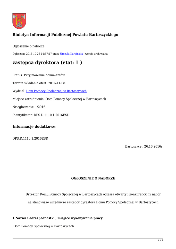 Biuletyn Informacji Publicznej Powiatu Bartoszyckiego Ogłoszenie o naborze Ogłoszono 2016-10-26 14:57:47 przez Urszula Karpińska | wersja archiwalna zastępca dyrektora (etat: 1 ) Status: Przyjmowanie dokumentów Termin składania ofert: 2016-11-08 Wydział: Dom Pomocy Społecznej w Bartoszycach Miejsce zatrudnienia: Dom Pomocy Społecznej w Bartoszycach Nr ogłoszenia: 1/2016 Identyfikator: DPS.D.1110.1.2016ESD Informacje dodatkowe: DPS.D.1110.1.2016ESD Bartoszyce , 26.10.2016r. OGŁOSZENIE O NABORZE Dyrektor Domu Pomocy Społecznej w Bartoszycach ogłasza otwarty i konkurencyjny nabór na stanowisko urzędnicze zastępcy dyrektora Domu Pomocy Społecznej w Bartoszycach 1.Nazwa i adres jednostki , miejsce wykonywania pracy: Dom Pomocy Społecznej w Bartoszycach 1/5 1. Bartoszyce, ul. Bohaterów Monte Cassino 4 2.Wymagania niezbędne w stosunku do kandydatów: 1.Posiada obywatelstwo polskie lub obywatelstwo państwa członkowskiego Unii Europejskiej, Konfederacji Szwajcarskiej lub państwa członkowskiego Europejskiego Porozumienia o Wolnym Handlu (EFTA)- strony umowy o Europejskim Obszarze Gospodarczym jeśli posiada znajomość języka polskiego potwierdzoną dokumentem określonym w przepisach o służbie cywilnej . 2. Posiada dyplom ukończenia studiów na kierunku prawa lub administracji lub pedagogiki lub socjologii lub politologii lub politologii i nauk społecznych. 3.Posiada co najmniej 5 letni staż pracy w pomocy społecznej i 3 letni na stanowisku kierowniczym. 4.Posiada studia podyplomowe z zakresu organizacji pomocy społecznej 5. Posiada pełną zdolność do czynności prawnych i korzysta z pełni praw publicznych. 6. Posiada stan zdrowia pozwalający na zatrudnienie na określonym stanowisku . 7. Kandydat , który zamierza skorzystać z uprawnienia, o którym mowa w art.13a ust.2 ustawy z dnia 21 listopada 2008r. o pracownikach samorządowych ( Dz.U.20016.902 j.t) jest zobowiązany do złożenia wraz z dokumentami kopi dokumentu potwierdzającego niepełnosprawność. 8. Nie był/a skazana prawomocnym wyrokiem sądu za umyślne przestępstwo ścigane z oskarżenia publicznego lub umyślne przestępstwo skarbowe. 9.Cieszy się nieposzlakowaną opinią. 3.Wymagania dodatkowe w stosunku do kandydatów: 1. znajomość przepisów ustawy o pomocy społecznej oraz aktów wykonawczych do ustawy dotyczących funkcjonowania domów pomocy społecznej, 2. znajomość zagadnień z zakresu prawa pracy, rehabilitacji zawodowej i społecznej osób niepełnosprawnych , kodeksu postępowania administracyjnego, gospodarowania środkami publicznymi, administrowania budynkiem, prawa zamówień publicznych, HACCP, bezpieczeństwa i higieny pracy, 3. umiejętność zarządzania zespołem pracowniczym. 4.Zakres wykonywanych zadań na stanowisku: 1. Prowadzenie spraw osobowych i akt pracowników jednostki. 2. Prowadzenie spraw związanych ze szkoleniem i doskonaleniem zawodowym pracowników. 3. Nadzór i organizacja pracy działów opiekuńczo-terapeutycznego oraz administracyjno2/5 gospodarczego. 4. Gospodarka budynkiem Domu. 5. Realizacja zadań oraz nadzór nad przestrzeganiem przepisów bezpieczeństwa i higieny pracy oraz zabezpieczenia pożarowego w budynku. 6. Współpraca z placówkami służby zdrowia, oświaty, pomocy społecznej oraz odpowiednimi władzami i instytucjami w zakresie doskonalenia działań Domu. 5.Zakres odpowiedzialności: 1.z tytułu powierzonych obowiązków służbowych, 2. z tytułu przestrzegania przepisów prawa pracy, zasad bezpieczeństwa i higieny pracy, zasad ochrony przeciwpożarowej, postanowień regulaminu organizacyjnego, 3. za powierzone mienie 6.Wymiar zatrudnienia: Umowa o pracę- pełny etat 7.Warunki pracy na danym stanowisku: 1.kierowanie zespołem, , nadzór i odpowiedzialność 2.obsługa interesantów ( pracowników, mieszkańców, itp.), 3.współpraca z instytucjami , przedsiębiorcami, 4.szkolenia, 5.praca przy monitorze ekranowym , 6.obsługa urządzeń biurowych , 7.praca w budynku Domu Pomocy Społecznej w Bartoszycach ul. Bohaterów Monte Cassino 4. Budynek pozbawiony jest barier architektonicznych. Wejście dostosowane jest dla potrzeb osób niepełnosprawnych . 8.Warunki zatrudnienia na stanowisku: Nie jest możliwe łączenie zatrudnienia w Domu Pomocy Społecznej w Bartoszycach z wykonywaniem zajęć tożsamych, pozostających w sprzeczności lub związanych z zajęciami, która pracownik wykonywać będzie w ramach obowiązków służbowych , wywołujących uzasadnione podejrzenie o stronniczość lub interesowność. 3/5 9.Wskaźnik zatrudnienia niepełnosprawnych: W miesiącu poprzedzającym datę upublicznienia ogłoszenia wskaźnik zatrudnienia osób niepełnosprawnych w jednostce , w rozumieniu przepisów o rehabilitacji zawodowej, społecznej i zatrudnianiu osób niepełnosprawnych wyniósł poniżej 6%. 10.Wymagane dokumenty: 1 . List motywacyjny. 2. Życiorys zawodowy (CV). 3. Dokumenty potwierdzające obywatelstwo polskie, wykształcenie i staż pracy, 4. Oświadczenia : o niekaralności, posiadaniu pełnej zdolności do czynności prawnych oraz korzystaniu z praw publicznych i obywatelskich, o stanie zdrowia pozwalającym na zajmowanie w/w stanowiska. 5.Podpisane oświadczenie o wyrażeniu zgody na przetwarzanie danych osobowych kandydatów dla potrzeb rekrutacji zgodnie z ustawą z dnia 29 sierpnia 1997r. o ochronie danych osobowych ( Dz.U.2014.1182 j.t ze zm) oraz ustawa z dnia 21 listopada 2008r. o pracownikach samorządowych ( Dz.U.2016.902 j.t.) 6. Inne dokumenty, które kandydat uważa za ważne dla jego przyszłej pracy . 5.Inne dokumenty potwierdzające spełnienie niezbędnych i dodatkowych wymagań kwalifikacyjnych. Wymagane dokumenty powinny być opatrzone klauzulą ,, Wyrażam zgodę na przetwarzanie moich danych osobowych zawartych w ofercie pracy dla potrzeb niezbędnych do realizacji procesu rekrutacji zgodnie z ustawą z dnia 29 sierpnia 1997r. o ochronie danych osobowych ( Dz.U.2014.1182 tj.) oraz ustawą