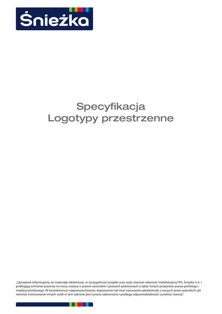 Specyfikacja Logotypy przestrzenne „Uprzejmie informujemy że materiały reklamowe, w szczególności projekt oraz wzór stanowi własność intelektualną FFiL Śnieżka S.A. i podlegają ochronie prawnej na mocy ustawy o prawie autorskim i prawach pokrewnych a także innych przepisów prawa polskiego i międzynarodowego. W konsekwencji rozpowszechnianie, kopiowanie lub inne naruszenie jakiekolwiek z naszych praw autorskich jak również instruowanie innych osób w tym zakresie jest surowo zabronione i podlega odpowiedzialności cywilnej i karnej”. 1. Pogląd 2 2. Specyfikacja 2.1 Logotypy 700mm x 400mm Lp Nazwa 1 Logotyp Śnieżka Grubość 5mm; 3mm Materiał PMMA 2 Logotyp Vidaron 5mm; 3mm PMMA 3 Logotyp Magnat 5mm; 3mm PMMA 4 Logotyp Beston 5mm; 3mm PMMA 5 Logotyp Senseo 5mm; 3mm PMMA 6 Logotyp Foveo 5mm; 3mm PMMA Wykończenie, cechy szczególne Białe PMMA 5mm malowane wraz z krawędziami Pantone 2768 C, białe litery 3mm PMMA klejone, kostki białe PMMA 3mm nadruk UV, 4 otwory, 4 dystanse aluminiowe Białe PMMA 5mm malowane wraz z krawędziami Pantone 3308 C, białe litery 3mm PMMA klejone malowany Pantone 877 C, 4 otwory, 4 dystanse aluminiowe Białe PMMA 5mm nadruk UV, boki malowane na czarno, logotyp 3mm czarne PMMA klejone, 4 otwory, 4 dystanse aluminiowe Białe PMMA 5mm malowane wraz z krawędziami Pantone 8002 C, czarny napis proffesional – sitodruk, logotyp 3mm czarne PMMA klejone oraz PMMA 3mm Pantone Orange 021 C klejone, 4 otwory, 4 dystanse aluminiowe Białe PMMA 5mm malowane wraz z krawędziami Pantone 280 C, białe litery 3mm PMMA klejone, 4 otwory, 4 dystanse aluminiowe Białe PMMA 5mm malowane wraz z krawędziami Pantone 877 C, logotyp 3mm kolor Pantone E 46 – 1 klejony oraz PMMA 3mm biały malowany na kolor Pantone: E 327 – 8, E 327 – 6, E 327 – 4, napis “Profesjonalne systemy...” nadruk UV, 4 otwory, 4 dystanse aluminiowe 2.2 Logotypy 500mm x 285mm Lp Nazwa 1 Logotyp Śnieżka Grubość 5mm; 3mm Materiał PMMA 2 Logotyp Vidaron 5mm; 3mm PMMA 3 Logotyp Magnat 5mm; 3mm PMMA 4 Logotyp Beston 5mm; 3mm PMMA 5 Logotyp Senseo 5mm; 3mm PMMA 6 Logotyp Foveo 5mm; 3mm PMMA Wykończenie, cechy szczególne Białe PMMA 5mm malowane wraz z krawędziami Pantone 2768 C, białe litery 3mm PMMA klejone, kostki białe PMMA 3mm nadruk UV, 4 otwory, 4 dystanse aluminiowe Białe PMMA 5mm malowane wraz z krawędziami Pantone 3308 C, białe litery 3mm PMMA klejone malowany Pantone 877 C, 4 otwory, 4 dystanse aluminiowe Białe PMMA 5mm nadruk UV, boki malowane na czarno, logotyp 3mm czarne PMMA klejone, 4 otwory, 4 dystanse aluminiowe Białe PMMA 5mm malowane wraz z krawędziami Pantone 8002 C, czarny napis proffesional – sitodruk, logotyp 3mm czarne PMMA klejone oraz PMMA 3mm Pantone Orange 021 C klejone, 4 otwory, 4 dystanse aluminiowe Białe PMMA 5mm malowane wraz z krawędziami Pantone 280 C, białe litery 3mm PMMA klejone, 4 otwory, 4 dystanse aluminiowe Białe PMMA 5mm malowane wraz z krawędziami Pantone 877 C, logotyp 3mm kolor Pantone E 46 – 1 klejony oraz PMMA 3mm biały malowany na kolor Pantone: E 327 – 8, E 327 – 6, E 327 – 4, napis “Profesjonalne systemy...” nadruk UV, 4 otwory, 4 dystanse aluminiowe 2.3 Dystans aluminiowy Lp 1 Nazwa Dystans aluminowy Grubość Materiał Aluminium\ Wykończenie, cechy szczególne Dystans aluminowy 19mm. Odstęp od ściany 50mm 2.4 Pakowanie Każdy logotyp pakowany jest osobno. Logotypy zabezpieczone są pianką do pakowania i owinięte folią stretch. Na każdy logotyp przypadają 4 dystanse. 3 3. Szczegóły 3.1 Logotyp Śnieżka Białe PMMA 3mm, nadruk UV Białe PMMA 3mm Białe PMMA 5mm Patnone 2768 C malowane wraz z krawędziami 3.2 Logotyp Vidaron Białe PMMA 3mm Pantone 877 C Białe PMMA 5mm Patnone 3308 malowane wraz z krawędziami 4 3.3 Logotyp Śnieżka Czarne PMMA 3mm Białe PMMA 5mm, nadruk UV, krawędzie malowane na czarno 3.4 Logotyp Foveo PMMA 3mm Pantone E 327 - 8 (CMYK 5/0/0/40) PMMA 3mm Pantone E 327 - 4 (CMYK 10/0/0/50) PMMA 3mm Pantone E 327 - 4 (CMYK 20/0/0/70) PMMA 3mm Pantone E 46 - 1 (CMYK 10/70/100/0) Nadruk UV (CMYK 20/0/0/70) Białe PMMA 5mm Patnone 877 C malowane wraz z krawędziami 5 3.5 Logotyp Senseo Białe PMMA 3mm Białe PMMA 5mm Patnone 280 C malowane wraz z krawędziami 3.6 Logotyp Beston Czarne PMMA 3mm Pomarańczowe PMMA 3mm Pantone Orange 021 C Sitodruk kolor czarny Białe PMMA 5mm Patnone 8002 C malowane wraz z krawędziami 6 4. Wymiary ogólne 4.1 Logotyp 700mm x 400mm Śnieżka 700mm 600mm 171mm 38mm 130mm 500mm 50mm ø10mm 50mm 4.2 Logotyp 500mm x 285mm Śnieżka 500mm 429mm 122mm 27mm 93mm 285mm 35mm ø10mm 35mm 7 4.3 Logotyp 700mm x 400mm Magnat 700mm 551mm 86mm 50mm ø10mm 50mm 4.4 Logotyp 500mm x 285mm Magnat 500mm 393mm 285mm 71mm 35mm ø10mm 35mm 8 4.5 Logotyp 700mm x 400mm Vidaron 700mm 454mm 310mm 50mm ø10mm 50mm 4.6 Logotyp 500mm x 285mm Vidaron 500mm 324mm 221mm 285mm 35mm ø10mm 35mm 9 4.7 Logotyp 700mm x 400mm Foveo 700mm 621mm 142mm 500mm 22mm 50mm ø10mm 50mm 4.8 Logotyp 500mm x 285mm Foveo 500mm 445mm 101mm 285mm 16mm 35mm ø10mm 35mm 10 4.9 Logotyp 700mm x 400mm Beston 700mm 601mm 271mm 108mm 51mm 50mm ø10mm 50mm 4.10 Logotyp 500mm x 285mm Beston 500mm 429mm 197mm 77mm 285mm 36mm 35mm ø10mm 35mm 11 4.11 Logotyp 700mm x 400mm Senseo 700mm 529mm 179mm 50mm ø10mm 50mm 4.12 Logotyp 500mm x 285mm Senseo 500mm 378mm 285mm 128mm 35mm ø10mm 35mm 12