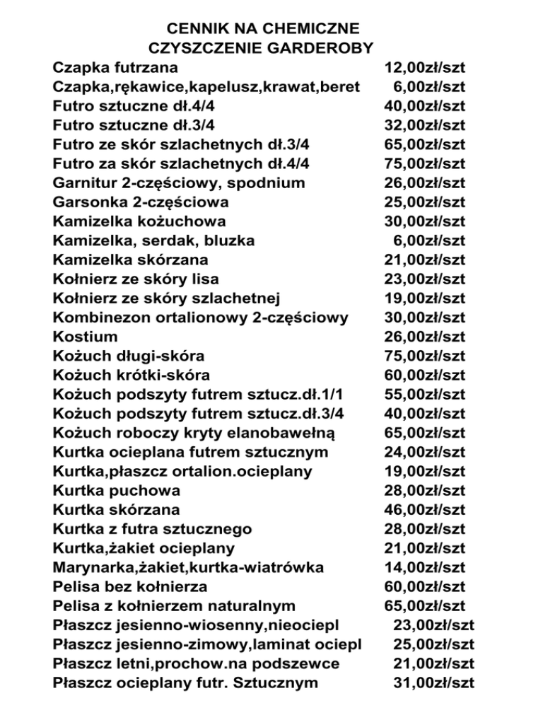 CENNIK NA CHEMICZNE CZYSZCZENIE GARDEROBY Czapka futrzana Czapka,rękawice,kapelusz,krawat,beret Futro sztuczne dł.4/4 Futro sztuczne dł.3/4 Futro ze skór szlachetnych dł.3/4 Futro za skór szlachetnych dł.4/4 Garnitur 2-częściowy, spodnium Garsonka 2-częściowa Kamizelka kożuchowa Kamizelka, serdak, bluzka Kamizelka skórzana Kołnierz ze skóry lisa Kołnierz ze skóry szlachetnej Kombinezon ortalionowy 2-częściowy Kostium Kożuch długi-skóra Kożuch krótki-skóra Kożuch podszyty futrem sztucz.dł.1/1 Kożuch podszyty futrem sztucz.dł.3/4 Kożuch roboczy kryty elanobawełną Kurtka ocieplana futrem sztucznym Kurtka,płaszcz ortalion.ocieplany Kurtka puchowa Kurtka skórzana Kurtka z futra sztucznego Kurtka,żakiet ocieplany Marynarka,żakiet,kurtka-wiatrówka Pelisa bez kołnierza Pelisa z kołnierzem naturalnym Płaszcz jesienno-wiosenny,nieociepl Płaszcz jesienno-zimowy,laminat ociepl Płaszcz letni,prochow.na podszewce Płaszcz ocieplany futr. Sztucznym 12,00zł/szt 6,00zł/szt 40,00zł/szt 32,00zł/szt 65,00zł/szt 75,00zł/szt 26,00zł/szt 25,00zł/szt 30,00zł/szt 6,00zł/szt 21,00zł/szt 23,00zł/szt 19,00zł/szt 30,00zł/szt 26,00zł/szt 75,00zł/szt 60,00zł/szt 55,00zł/szt 40,00zł/szt 65,00zł/szt 24,00zł/szt 19,00zł/szt 28,00zł/szt 46,00zł/szt 28,00zł/szt 21,00zł/szt 14,00zł/szt 60,00zł/szt 65,00zł/szt 23,00zł/szt 25,00zł/szt 21,00zł/szt 31,00zł/szt Płaszcz ociepl.z kołnierzem naturalnym Pulowery - bluzy Smoking Spodnie długie Spodnie krótkie Spodnie ortalionowe ocieplane Spódnica gładka Spódnica układana Spódnica plisowana Sukienka komunijna gładka Sukienka komunijna z ozdobami Suknia gładka Suknia układana Suknia wieczorowa Suknia ślubna gładka Suknia ślubna z ozdobami Sutanna Swetry grube, blezery Pledy, narzuty z futer naturalnych Bieżniki, makaty, poduszki Kapy, narzuty Koce, pledy, kilimy Kołdry, śpiwory Kotary, zasłony Narzuty z tkanin - pojedyńcze Narzuty z tkanin - podwójne Narzuty z futer sztucznych - pojed. Narzuty z futer sztucznych - podw. Sztandary, proporce Stroje regionalne 39,00zł/szt 10,00zł/szt 35,00zł/szt 12,00zł/szt 10,00zł/szt 12,00zł/szt 12,00zł/szt 13,00zł/szt 14,00zł/szt 40,00zł/szt 50,00zł/szt 16,00zł/szt 19,00zł/szt 35,00zł/szt 95,00zł/szt 130,00zł/szt 35,00zł/szt 12,00zł/szt 19,00zł/m2 8,00zł/szt 15,00zł/szt 18,00zł/szt 28,00zł/szt 10,00zł/kg 12,00zł/szt 14,00zł/szt 14,00zł/szt 22,00zł/szt 12,00zł/m2 35,00zł/szt