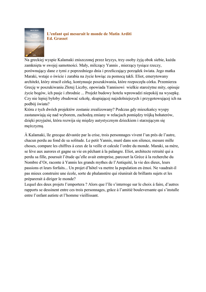 L'enfant qui mesurait le monde de Matin Arditi Ed. Grasset Na greckiej wyspie Kalamaki zniszczonej przez kryzys, trzy osoby żyją obok siebie, każda zamknięta w swojej samotności. Mały, milczący Yannis , mierzący tysiące rzeczy, porównujący dane z tymi z poprzedniego dnia i przeliczający porządek świata. Jego matka Maraki, wstaje o świcie i zarabia na życie łowiąc za pomocą takli. Eliot, emerytowany architekt, który stracił córkę, kontynuuje poszukiwania, które rozpoczęła córka. Przemierza Grecję w poszukiwaniu Złotej Liczby, opowiada Yannisowi wielkie starożytne mity, opisuje życie bogów, ich pasje i zbrodnie ... Projekt budowy hotelu wprowadzi niepokój na wysepkę. Czy nie lepiej byłoby zbudować szkołę, skupiającej najzdolniejszych i przygotowującej ich na podbój świata? Która z tych dwóch projektów zostanie zrealizowany? Podczas gdy mieszkańcy wyspy zastanawiają się nad wyborem, zachodzą zmiany w relacjach pomiędzy trójką bohaterów, dzięki przyjaźni, która rozwija się między autystycznym dzieckiem i starzejącym się mężczyzną. À Kalamaki, île grecque dévastée par la crise, trois personnages vivent l’un près de l’autre, chacun perdu au fond de sa solitude. Le petit Yannis, muré dans son silence, mesure mille choses, compare les chiffres à ceux de la veille et calcule l’ordre du monde. Maraki, sa mère, se lève aux aurores et gagne sa vie en pêchant à la palangre. Eliot, architecte retraité qui a perdu sa fille, poursuit l’étude qu’elle avait entreprise, parcourt la Grèce à la recherche du Nombre d’Or, raconte à Yannis les grands mythes de l’Antiquité, la vie des dieux, leurs passions et leurs forfaits... Un projet d’hôtel va mettre la population en émoi. Ne vaudrait-il pas mieux construire une école, sorte de phalanstère qui réunirait de brillants sujets et les préparerait à diriger le monde? Lequel des deux projets l’emportera ? Alors que l’île s’interroge sur le choix à faire, d’autres rapports se dessinent entre ces trois personnages, grâce à l’amitié bouleversante qui s’installe entre l’enfant autiste et l’homme vieillissant. Tropique de la violence de Natacha Appanah Ed. Gallimard „Nie zasypiaj, nie odpoczywaj, nie zamykaj oczu, to nie zostało skończone. Oni cię szukają. Słyszysz ten hałas, jakby toczenia pustych beczek, jakby grzmot w styczniu, ale jesteś w błędzie jeśli myślisz, że to jest to. Usłysz mój kraj krzyczący, wsłuchaj się w gniew, który dochodzi do nas. Słyszysz tą muzykę, czujesz rozpalony węgiel blisko twojej poranionej twarzy? Idą po ciebie.” Tropic de la violence to zanurkowanie w piekło pozostawionej samej sobie młodości na francuskiej wyspie Majotta, na Oceanie Indyjskim. W tym cudownym kraju, dzikim i na krawędzi chaosu, skrzyżują się losy pięciu osób, by ujawnić przemoc życia codziennego. «Ne t’endors pas, ne te repose pas, ne ferme pas les yeux, ce n’est pas terminé. Ils te cherchent. Tu entends ce bruit, on dirait le roulement des barriques vides, on dirait le tonnerre en janvier mais tu te trompes si tu crois que c’est ça. Écoute mon pays qui gronde, écoute la colère qui rampe et qui rappe jusqu’à nous. Tu entends cette musique, tu sens la braise contre ton visage balafré? Ils viennent pour toi.» Tropique de la violence est une plongée dans l’enfer d’une jeunesse livrée à elle-même sur l’île française de Mayotte, dans l’océan Indien. Dans ce pays magnifique, sauvage et au bord du chaos, cinq destins vont se croiser et nous révéler la violence de leur quotidien. Ma part de Gaulois de Magyd Cherfi Ed. Actes Sud To maturalny rok dla Magyd małej Arabki z ulicy Raphaël w północnych dzielnicach Tuluzy. To co jest zwykłą formalnością dla Francuzów, staje się epokowym wydarzeniem dla "tubylca". Wystarczy pomyśleć, to pierwsza arabska matura na osiedlu. Koniec tunelu, zwieńczenie długiej walki z przeciwnościami losu, ciągłą presją zaborczej i wszechwładnej matki i szydzących drwin bandy dzieciaków. Poza szkołą nie jest dobrze być „intelektualistką”. W zamkniętym świecie gdzie każdy, każdego zna – Magyd, nierozłączny, działacz Samir i zaangażowany artysta Momo przeżywają to na co dzień. C’est l’année du baccalauréat pour Magyd, petit Beur de la rue Raphaël, quartiers nord de Toulouse. Une formalité pour les Français, un événement sismique pour l’“indigène”. Pensez donc, le premier bac arabe de la cité. Le bout d’un tunnel, l’apogée d’un long bras de fer avec la fatalité, sous l’incessante pres sion énamourée de la toute-puissante mère et les quolibets goguenards de la bande. Parce qu’il ne fait pas bon passer pour un “intello” après l’école, dans la périphérie du “vivre ensemble” – Magyd et ses inséparables, Samir le militant et Momo l’artiste de la tchatche, en font l’expérience au quotidien. L’Autre qu’on adorait de Catherine Cusset éd. Gallimard "Kiedy myślisz o tym, co ci się przytrafia, masz wrażenie ,że znajdujesz się w świecie Davida Lyncha. Blue Velvet, Twin Peaks. Uniwersyteckie miasto, ciało dwudziestoletniego chłopaka, narkotyki, policja, piękna studentka, miłosna przygoda między nią a jej nauczycielem, który ma dwa razy więcej lat: jest materiałem na skrypt wielkiego filmu. To nie jest film. To twoje życie. " L’autre qu’on adorait ożywia Thomas, człowieka o wybujałej witalności, który był kochankiem, a później bliskim przyjacielem narratorki, i który popełnił samobójstwo w wieku trzydziestu dziewięciu lat w Stanach Zjednoczonych. To dwunasta powieść Katarzyny Cusset, w której odnajdujemy psychologiczną intensywność, gęsty styl i tempo, które złożyły się na sukces Problème avec Jane, La haine de la famille i d’Un brillant avenir, z niesamowitą empatią, nieustającą mechaniką towarzyszącą nieuchronnemu zejściu do
