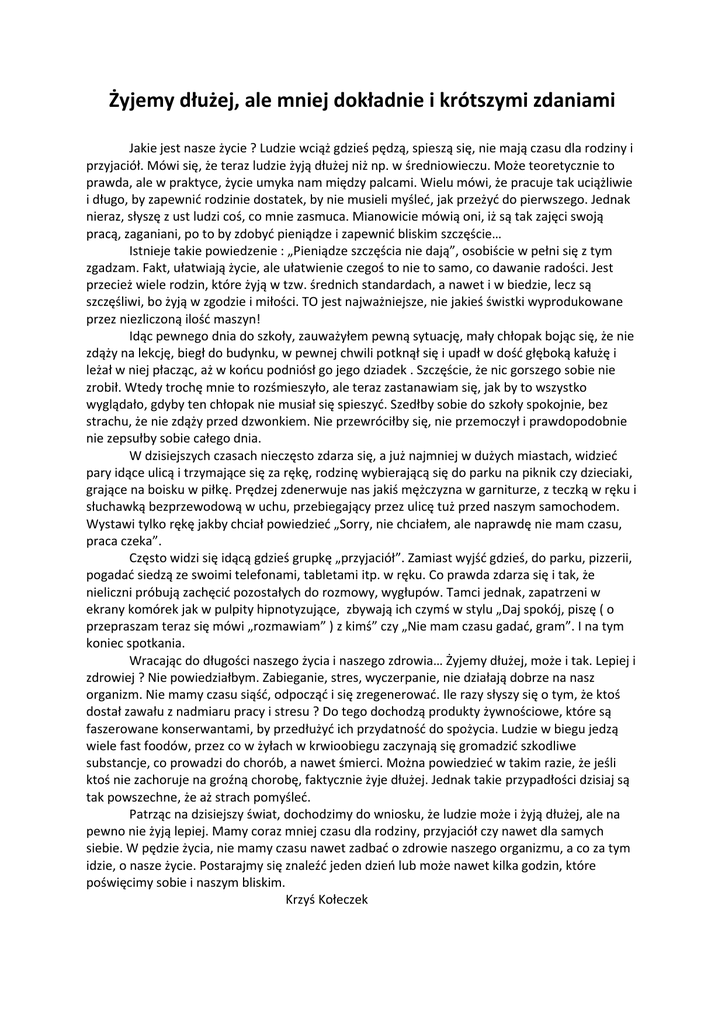 Żyjemy dłużej, ale mniej dokładnie i krótszymi zdaniami Jakie jest nasze życie ? Ludzie wciąż gdzieś pędzą, spieszą się, nie mają czasu dla rodziny i przyjaciół. Mówi się, że teraz ludzie żyją dłużej niż np. w średniowieczu. Może teoretycznie to prawda, ale w praktyce, życie umyka nam między palcami. Wielu mówi, że pracuje tak uciążliwie i długo, by zapewnid rodzinie dostatek, by nie musieli myśled, jak przeżyd do pierwszego. Jednak nieraz, słyszę z ust ludzi coś, co mnie zasmuca. Mianowicie mówią oni, iż są tak zajęci swoją pracą, zaganiani, po to by zdobyd pieniądze i zapewnid bliskim szczęście… Istnieje takie powiedzenie : „Pieniądze szczęścia nie dają”, osobiście w pełni się z tym zgadzam. Fakt, ułatwiają życie, ale ułatwienie czegoś to nie to samo, co dawanie radości. Jest przecież wiele rodzin, które żyją w tzw. średnich standardach, a nawet i w biedzie, lecz są szczęśliwi, bo żyją w zgodzie i miłości. TO jest najważniejsze, nie jakieś świstki wyprodukowane przez niezliczoną ilośd maszyn! Idąc pewnego dnia do szkoły, zauważyłem pewną sytuację, mały chłopak bojąc się, że nie zdąży na lekcję, biegł do budynku, w pewnej chwili potknął się i upadł w dośd głęboką kałużę i leżał w niej płacząc, aż w koocu podniósł go jego dziadek . Szczęście, że nic gorszego sobie nie zrobił. Wtedy trochę mnie to rozśmieszyło, ale teraz zastanawiam się, jak by to wszystko wyglądało, gdyby ten chłopak nie musiał się spieszyd. Szedłby sobie do szkoły spokojnie, bez strachu, że nie zdąży przed dzwonkiem. Nie przewróciłby się, nie przemoczył i prawdopodobnie nie zepsułby sobie całego dnia. W dzisiejszych czasach nieczęsto zdarza się, a już najmniej w dużych miastach, widzied pary idące ulicą i trzymające się za rękę, rodzinę wybierającą się do parku na piknik czy dzieciaki, grające na boisku w piłkę. Prędzej zdenerwuje nas jakiś mężczyzna w garniturze, z teczką w ręku i słuchawką bezprzewodową w uchu, przebiegający przez ulicę tuż przed naszym samochodem. Wystawi tylko rękę jakby chciał powiedzied „Sorry, nie chciałem, ale naprawdę nie mam czasu, praca czeka”. Często widzi się idącą gdzieś grupkę „przyjaciół”. Zamiast wyjśd gdzieś, do parku, pizzerii, pogadad siedzą ze swoimi telefonami, tabletami itp. w ręku. Co prawda zdarza się i tak, że nieliczni próbują zachęcid pozostałych do rozmowy, wygłupów. Tamci jednak, zapatrzeni w ekrany komórek jak w pulpity hipnotyzujące, zbywają ich czymś w stylu „Daj spokój, piszę ( o przepraszam teraz się mówi „rozmawiam” ) z kimś” czy „Nie mam czasu gadad, gram”. I na tym koniec spotkania. Wracając do długości naszego życia i naszego zdrowia… Żyjemy dłużej, może i tak. Lepiej i zdrowiej ? Nie powiedziałbym. Zabieganie, stres, wyczerpanie, nie działają dobrze na nasz organizm. Nie mamy czasu siąśd, odpocząd i się zregenerowad. Ile razy słyszy się o tym, że ktoś dostał zawału z nadmiaru pracy i stresu ? Do tego dochodzą produkty żywnościowe, które są faszerowane konserwantami, by przedłużyd ich przydatnośd do spożycia. Ludzie w biegu jedzą wiele fast foodów, przez co w żyłach w krwioobiegu zaczynają się gromadzid szkodliwe substancje, co prowadzi do chorób, a nawet śmierci. Można powiedzied w takim razie, że jeśli ktoś nie zachoruje na groźną chorobę, faktycznie żyje dłużej. Jednak takie przypadłości dzisiaj są tak powszechne, że aż strach pomyśled. Patrząc na dzisiejszy świat, dochodzimy do wniosku, że ludzie może i żyją dłużej, ale na pewno nie żyją lepiej. Mamy coraz mniej czasu dla rodziny, przyjaciół czy nawet dla samych siebie. W pędzie życia, nie mamy czasu nawet zadbad o zdrowie naszego organizmu, a co za tym idzie, o nasze życie. Postarajmy się znaleźd jeden dzieo lub może nawet kilka godzin, które poświęcimy sobie i naszym bliskim. Krzyś Kołeczek