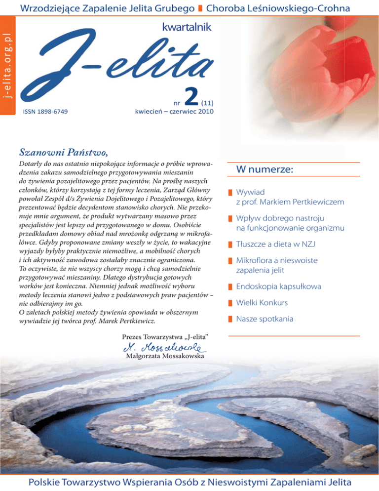 Wrzodziejące Zapalenie Jelita Grubego Choroba Leśniowskiego-Crohna j-elita.org.pl kwartalnik ISSN 1898-6749 2 nr (11) ŬǁŝĞĐŝĞŷ ʹ ĐnjĞrǁŝĞĐ ϮϬ1Ϭ Szanowni Państwo, Dotarły do nas ostatnio niepokojące informacje o próbie wprowadzenia zakazu samodzielnego przygotowywania mieszanin do żywienia pozajelitowego przez pacjentów. Na prośbę naszych członków, którzy korzystają z tej formy leczenia, Zarząd Główny powołał Zespół d/s Żywienia Dojelitowego i Pozajelitowego, który prezentować będzie decydentom stanowisko chorych. Nie przekonuje mnie argument, że produkt wytwarzany masowo przez specjalistów jest lepszy od przygotowanego w domu. Osobiście przedkładam domowy obiad nad mrożonkę odgrzaną w mikrofalówce. Gdyby proponowane zmiany weszły w życie, to wakacyjne wyjazdy byłyby praktycznie niemożliwe, a mobilność chorych i ich aktywność zawodowa zostałaby znacznie ograniczona. To oczywiste, że nie wszyscy chorzy mogą i chcą samodzielnie przygotowywać mieszaniny. Dlatego dystrybucja gotowych worków jest konieczna. Niemniej jednak możliwość wyboru metody leczenia stanowi jedno z podstawowych praw pacjentów – nie odbierajmy im go. O zaletach polskiej metody żywienia opowiada w obszernym wywiadzie jej twórca prof. Marek Pertkiewicz. W numerze: Wywiad z prof. Markiem Pertkiewiczem Wpływ dobrego nastroju na funkcjonowanie organizmu Tłuszcze a dieta w NZJ Mikroflora a nieswoiste zapalenia jelit Endoskopia kapsułkowa Wielki Konkurs Nasze spotkania Prezes Towarzystwa „J-elita” Małgorzata Mossakowska Polskie Towarzystwo Wspierania Osób z Nieswoistymi Zapaleniami Jelita WAŻNE ADRESY: Polskie Towarzystwo Wspierania Osób z Nieswoistymi Zapaleniami Jelita „J-elita” Zarząd Główny ul. Trojdena 4, 02-109 Warszawa, tel./fax 022 597 07 82, e-mail: [email protected], strona internetowa: http://www.j-elita.org.pl Prezes: Małgorzata Mossakowska, e-mail: [email protected], tel: 022 597 07 20, 0691 40 30 51 Bank PKO S.A. I Odział w Warszawie Nr rachunku 48 1240 1037 1111 0010 0740 0594 Oddział Dolnośląski Oddział Podlaski II Katedra i Klinika Pediatrii, Gastroenterologii i Żywienia AM we Wrocławiu ul. Marii Skłodowskiej-Curie 50/52, 50-369 Wrocław tel. (071) 320 08 03 (lekarz dyżurny) sekretariat tel./fax: (071) 328 41 17 e-mail: [email protected] Dziecięcy Szpital Kliniczny w Białymstoku III Klinika Chorób Dzieci ul. Waszyngtona 17, 15-269 Białystok tel. (085) 745 07 10 Prezes dr Elżbieta Jarocka-Cyrta Oddział Podkarpacki Oddział Kujawsko-Pomorski Katedra i Klinika Pediatrii, Alergologii i Gastroenterologii CM UMK (VI piętro) ul. M. Skłodowskiej-Curie 9, 85-094 Bydgoszcz Prezes Marek Gólczyński, tel. 889 899 779 e-mail: [email protected] Oddział Małopolski Klinika Pediatrii, Gastroenterologii i Żywienia Polsko-Amerykański Instytut Pediatrii CM UJ ul. Wielicka 265, 30-663 Kraków tel. 600 306 092 e-mail: [email protected] strona internetowa: http://www.nzj.malopolska.pl Prezes dr Małgorzata Sładek Oddział Mazowiecki W siedzibie Zarządu Głównego, Prezes dr Piotr Albrecht Prezes Natalia Wickowska, tel. 510 563 733 e-mail: [email protected] Oddział Pomorski Wojewódzki Szpital Specjalistyczny, Katedra i Klinika Pediatrii, Gastroenterologii, Hepatologii i Żywienia Dzieci Akademii Medycznej w Gdańsku ul. Nowe Ogrody 1-6, 80-803 Gdańsk tel. 604 215 445 e-mail: [email protected] Prezes Ada Guźniczak Oddział Zachodniopomorski Samodzielny Publiczny Wojewódzki Szpital Zespolony ul. Arkońska 4, 71-455 Szczecin Prezes Katarzyna Okuszko, tel: 502 124 460, 507 316 126 e-mail: [email protected] Inne przydatne adresy Strona Konsultanta Krajowego ds. Gastroenterologii, Rejestr Choroby Leśniowskiego-Crohna, www.chorobacrohna.pl Crohn’s and Colitis Foundation of Canada http://www.ccfc.ca/English Górnośląskie Stowarzyszenie Wspierania Osób Chorych na Nieswoiste Zapalenia Jelit http://www.republika.pl/colitiscrohn Crohn’s and Colitis Foundation of America, http://ccfa.org Colitis Foundation, www.colitisfoundation.com Polskie Stowarzyszenie Colitis Ulcerosa i Choroby Crohna, ul. Górnicza 18 B m. 15, 81-572 Gdynia Prezes Mirosława Myszkowska, tel. 609 039 252 Wielkopolskie Stowarzyszenie Colitis Ulcerosa i choroby Leśniowskiego–Crohna, Poznań Prezes Wiesława Bednawska, tel. 668 225 771 http://culc.republika.pl Fundacja „Linia Życia” http://www.idn.org.pl/liniazycia wspomaga ludzi, którzy z powodu różnych chorób nie mogą odżywiać się w sposób naturalny. Fundację tworzą osoby żywione pozajelitowo w warunkach domowych. Polskie Towarzystwo Żywienia Pozajelitowego i Dojelitowego zrzesza specjalistów zajmujących się w Polsce tymi formami żywienia, http://www.polspen.org (022) 584 13 20 Forum internetowe dla osób chorych na NZJ www.crohn.home.pl Reach Out for Youth With Ileitis and Colitis, Inc. www.reachoutforyouth.org Pediatric Crohn’s and Colitis Assotiation http://pcca.hypermart.net/index.html New Zealand: Crohn’s and Colitis Support Group – CCSG http://www.ccsg.org.nz Australian Crohn’s and Colitis Association http://www.acca.net.au Die Deutsche Morbus Crohn / Colitis ulcerosa Vereinigung – DCCV – e.V, http://www.dccv.de THE AUSTRIAN IBDIS PLATFORM, http://www.ibdis.net European Federation of Crohn’s & Ulcerative Colitis Associations http://www.efcca.org/i Polskie Towarzystwo Stomijne POL-ILKO, http://www.polilko.pl Szanowni Państwo, Kącik prawny Już po ukazaniu się poprzedniego numeru Kwartalnika dotarła do nas wiadomość, że po długim oczekiwaniu budesonid znalazł się na liście leków z opłatą ryczałtową. Był to najlepszy prezent, jaki znalazłam pod choinką. Pozwoli to leczyć wielu pacjentów cierpiących na chorobę LeśniowskiegoCrohna sterydem o nieporównywalnie mniejszych działaniach niepożądanych niż sterydy ogólne. Dotychczas leczenie budesonidem dojelitowym było zarezerwowane dla ludzi zamożnych. Teraz każdy chory o kątniczo-krę