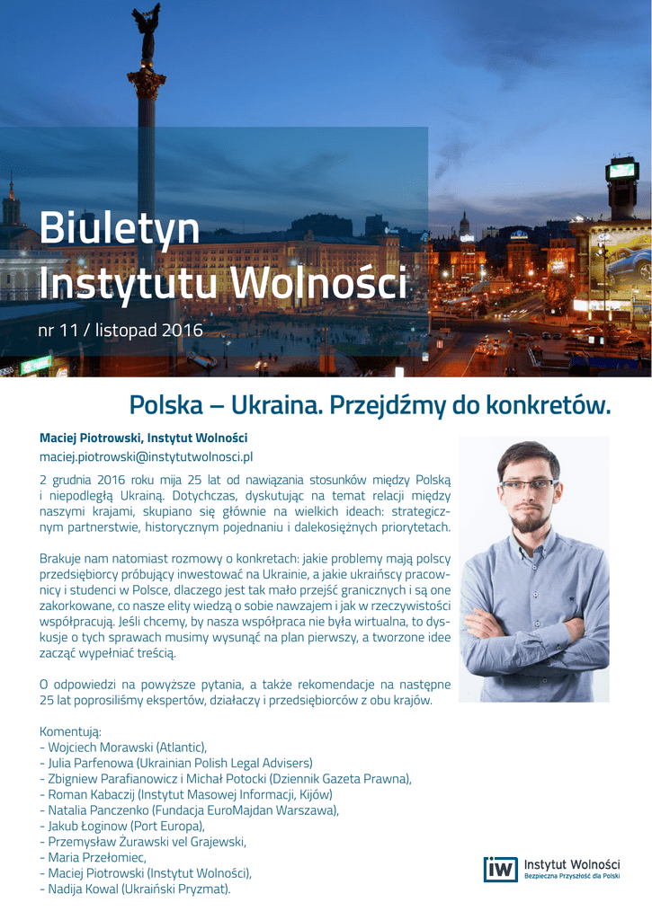 Biuletyn Instytutu Wolności nr 11 / listopad 2016 Polska – Ukraina. Przejdźmy do konkretów. Maciej Piotrowski, Instytut Wolności [email protected] 2 grudnia 2016 roku mija 25 lat od nawiązania stosunków między Polską i niepodległą Ukrainą. Dotychczas, dyskutując na temat relacji między naszymi krajami, skupiano się głównie na wielkich ideach: strategicznym partnerstwie, historycznym pojednaniu i dalekosiężnych priorytetach. Brakuje nam natomiast rozmowy o konkretach: jakie problemy mają polscy przedsiębiorcy próbujący inwestować na Ukrainie, a jakie ukraińscy pracownicy i studenci w Polsce, dlaczego jest tak mało przejść granicznych i są one zakorkowane, co nasze elity wiedzą o sobie nawzajem i jak w rzeczywistości współpracują. Jeśli chcemy, by nasza współpraca nie była wirtualna, to dyskusje o tych sprawach musimy wysunąć na plan pierwszy, a tworzone idee zacząć wypełniać treścią. O odpowiedzi na powyższe pytania, a także rekomendacje na następne 25 lat poprosiliśmy ekspertów, działaczy i przedsiębiorców z obu krajów. Komentują: - Wojciech Morawski (Atlantic), - Julia Parfenowa (Ukrainian Polish Legal Advisers) - Zbigniew Parafianowicz i Michał Potocki (Dziennik Gazeta Prawna), - Roman Kabaczij (Instytut Masowej Informacji, Kijów) - Natalia Panczenko (Fundacja EuroMajdan Warszawa), - Jakub Łoginow (Port Europa), - Przemysław Żurawski vel Grajewski, - Maria Przełomiec, - Maciej Piotrowski (Instytut Wolności), - Nadija Kowal (Ukraiński Pryzmat). Przedsiębiorczość Wojciech Morawski, przedsiębiorca, twórca marki Atlantic Stan ukraińskiej administracji i sądownictwa odstrasza zagranicznych inwestorów Rynek ukraiński jest bardzo atrakcyjnym i naturalnym rynkiem dla rozwoju naszych przedsiębiorstw. Najważniejsze plusy Ukrainy to wielkość kraju, bliskość geograficzną i mentalna, a także wspólna historia. Trzeba pamiętać, że historycznie budowaliśmy swoją siłę gospodarczą właśnie tworząc wspólne państwo z Ukrainą i Litwą. To nie był przypadek, były ku temu ekonomiczne, geograficzne i kulturowe przesłanki. ,,Przedsiębiorca nie będzie ryzykować swoich pieniędzy, jeśli nie ma możliwości skutecznego dochodzenia swoich praw ze względu na ryzyko korupcyjne.” Wojciech Morawski Jest jednak ważne „ale”. Pomimo zainteresowania wielu firm, nasza obecność jest tam stosunkowo mało znacząca. Oczywistą tego przyczyną jest ryzyko polityczne i związane z tym ryzyko ekonomiczne. Jest to największa bariera, ale ci, którzy odważą się ją przekroczyć, trafiają wręcz na zasieki. Na Ukrainie wciąż jest problem z niezależnym sądownictwem. Przedsiębiorca nie będzie ryzykować swoich pieniędzy, jeśli nie ma możliwości skutecznego dochodzenia swoich praw ze względu na ryzyko korupcyjne. Ukraińska administracja jest niesprawna, a prawo niejasne i nieprzyjazne dla inwestorów zagranicznych. Spójrzmy na przykład. W Polsce zagraniczny przedsiębiorca może otworzyć spółkę, zostać jej prezesem i kontrolować majątek firmy. Na Ukrainie jest inaczej. Żeby zostać prezesem własnej spółki, a właściwie dyrektorem generalnym, który ma uprawnienia prezesa, trzeba wystąpić o pozwolenie na pracę. Można je otrzymać, bądź nie, a z pewnością straci się na to czas. Jeżeli wyniknie problem, trzeba zatrudnić miejscowego pracownika. Ten drobny z pozoru fakt jest w rzeczywistości sporym hamulcem. W tamtejszym systemie, gdy nie jest się osobą zatrudnioną w firmie, jest się pozbawionym np. możliwości występowania w imieniu przedsiębiorstwa czy też korzystania z konta. Warto również wspomnieć o bardzo słabej ochronie własności intelektualnej. Niezwykle łatwo jest zarejestrować znak łudząco podobny do już istniejącego. Trudno również dochodzić swoich praw w takich przypadkach. Jest to problem dla polskich przedsiębiorców, którzy zazwyczaj inwestują ze swoim know-how, marką czy własnością intelektualną. W ukraińskim systemu prawnym i administracyjnym należy zmienić wiele. Ukraińcy muszą włożyć wiele wysiłku, żebyśmy mogli powiedzieć, że jest to dobry kraj do inwestowania. www.instytutwolnosci.pl 2 Przedsiębiorczość Julia Parfenowa, Ukrainian Polish Legal Advisers Klimat inwestycyjny na Ukrainie będzie się poprawiać Dzisiejsza Ukraina jest miejscem atrakcyjnym dla przedsiębiorców chcących rozwijać swój biznes, jednak pewne czynniki odstraszają od inwestowania nad Dnieprem. Po pierwsze jest to konflikt polityczny, który utrudnia pełnowartościowy proces wymiany towarów, zarówno jeśli chodzi o bezpośrednią sprzedaż towarów na Ukrainie, jak i tranzyt, co z kolei przekłada się na stratę potencjalnych rynków sąsiedzkich państw. Drugi ważny czynnik to krytyczna sytuacja sektora bankowego, która nie daje możliwości stabilnej działalności na wewnętrznym rynku ukraińskim. Procedura międzynarodowych przekazów pieniężnych jest niezwykle skomplikowana – by je zrealizować potrzeba zgromadzić cały pakiet dokumentów. ,,Konflikt polityczny utrudnia pełnowartościowy proces wymiany towarów, zarówno jeśli chodzi o bezpośrednią sprzedaż towarów na Ukrainie, jak i tranzyt, co z kolei przekłada się na stratę potencjalnych rynków sąsiedzkich państw.” Julija Parfenowa Po trzecie, warto wspomnieć o niedoskonałości ukraińskiego systemu podatkowego, w wyniku czego rozwija się szara strefa. Istnieją też liczne problemy, które dotykają bezpośrednio polskich przedsiębiorców. Część z nich wynika z działalności organów państwowych na Ukrainie. Czasem wiąże się to z ich niekompetencją (trudno uzyskać niezbędne informacje), czasem z świadomymi działaniami na szkodę przedsiębiorcy. Już samo ukraińskie prawo stwarza wiele trudności. Nieprzejrzystość tamtejszego systemu podatkowego, skomplikowany proces legalizacji działalności na terytorium Ukrainy czy też brak ochrony praw