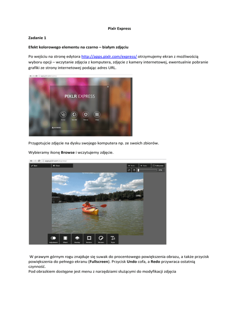 Pixlr Express Zadanie 1 Efekt kolorowego elementu na czarno – białym zdjęciu Po wejściu na stronę edytora http://apps.pixlr.com/express/ otrzymujemy ekran z możliwością wyboru opcji – wczytanie zdjęcia z komputera, zdjęcie z kamery internetowej, ewentualnie pobranie grafiki ze strony internetowej podając adres URL. Przygotujcie zdjęcie na dysku swojego komputera np. ze swoich zbiorów. Wybieramy ikonę Browse i wczytujemy zdjęcie. W prawym górnym rogu znajduje się suwak do procentowego powiększenia obrazu, a także przycisk powiększenia do pełnego ekranu (Fullscreen). Przycisk Undo cofa, a Redo przywraca ostatnią czynność. Pod obrazkiem dostępne jest menu z narzędziami służącymi do modyfikacji zdjęcia Po wybraniu Adjustment rozwija się menu z zestawem różnych narzędzi, między innymi do: przycinania (Crop), zmiany rozmiaru (Resize), obracania (Rotate), automatycznej korekty (AutoFi), wyostrzania (Sharpen), usuwania pikseli (Smooth), rozjaśniania elementów zdjęcia pędzlem (Brighten), usuwania efektu czerwonych oczu (Red Eye), rozjaśniania cieni (shades) lub przyciemniania świateł (shine) w opcji Heal. Opcja Liguify pozwala na deformację elementów zdjęcia – wybieramy rodzaj deformacji i przeciągamy kursorem myszy lub klikamy nawet kilkakrotnie w przypadku powiększenia (Enlarge). Focal pozwala na rozmycie zdjęcia wokół wybranego fragmentu – możemy regulować stopień rozmycia suwakiem. Ustawiamy pozycje i zmieniamy promień okręgów chwytając i przeciągając kursorem białe kółka. My w naszym zadaniu zajmiemy się opcją Splash Splash pozwala na wyodrębnienie kolorystyczne elementu zdjęcia – po wybraniu tej opcji całe zdjęcie pojawia się z tonacji czarno-białej. Malując pędzlem wybrane elementy odsłaniamy naturalny kolor – suwakiem ustawiamy wielkość pędzla (Brush), poprawiamy usuwając punktowo kolor gumką (Eraser). Po kliknięciu w ikonę Splash nasze zdjęcie jest czarno – białe. Wybieramy narzędzie Brash i malujemy wybrany fragment zdjęcia (w przykładzie kajak i postać). Możecie użyć gumki (Eraser), aby skorygować malowanie pędzlem. Gdy uzyskacie zadowalający efekt zatwierdzamy klikając Apply. Następnie zapisujemy naszą pracę – opcja Save w lewym górnym rogu. Zadanie 2 Kolaż zdjęć Po wejściu na stronę edytora wybieramy opcję Collage. Klikamy ikonę Layout, aby wybrać szablon naszego kolażu. Gdy najedziesz na każde okienko w szablonie zobaczysz znak +. Po kliknięciu w niego możesz dodać zdjęcie z dysku swojego komputera. Po wczytaniu zdjęć zmodyfikuj kształt i kolor ramek według uznania i kliknij Finished, aby zakończyć pracę. Następnie zapisz pracę na dysku swojego komputera – ikona w lewym górnym rogu Save.
