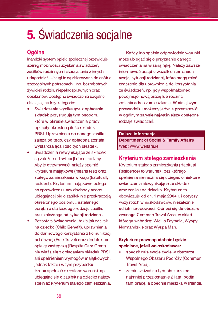 5. Świadczenia socjalne Ogólne Irlandzki system opieki społecznej przewiduje szereg możliwości uzyskania świadczeń, zasiłków rodzinnych i skorzystania z innych udogodnień. Usługi te są skierowane do osób o szczególnych potrzebach – np. bezrobotnych, żywicieli rodzin, niepełnosprawnych oraz opiekunów. Dostępne świadczenia socjalne dzielą się na trzy kategorie: •Świadczenia wynikające z opłacania składek przysługują tym osobom, które w okresie świadczenia pracy opłaciły określoną ilość składek PRSI. Uprawnienia do danego zasiłku zależą od tego, czy opłacona została wystarczająca ilość tych składek. •Świadczenia niewynikające ze składek są zależne od sytuacji danej rodziny. Aby je otrzymywać, należy spełnić kryterium majątkowe (means test) oraz stałego zamieszkania w kraju (habitually resident). Kryterium majątkowe polega na sprawdzeniu, czy dochody osoby ubiegającej się o zasiłek nie przekraczają określonego poziomu,. ustalanego odrębnie dla każdego rodzaju zasiłku oraz zależnego od sytuacji rodzinnej. •Pozostałe świadczenia, takie jak zasiłek na dziecko (Child Benefit), uprawnienia do darmowego korzystania z komunikacji publicznej (Free Travel) oraz dodatek na opiekę zastępczą (Respite Care Grant) nie wiążą się z opłacaniem składek PRSI ani spełnieniem wymogów majątkowych, jednak także i w tym przypadku trzeba spełniać określone warunki, np. ubiegając się o zasiłek na dziecko należy spełniać kryterium stałego zamieszkania. 36 Każdy kto spełnia odpowiednie warunki może ubiegać się o przyznanie danego świadczenia na własną rękę. Należy zawsze informować urząd o wszelkich zmianach swojej sytuacji rodzinnej, które mogą mieć znaczenie dla uprawnienia do korzystania ze świadczeń, np. gdy współmałżonek podejmuje nową pracę lub rodzina zmienia adres zamieszkania. W niniejszym przewodniku możemy jedynie przedstawić w ogólnym zarysie najważniejsze dostępne rodzaje świadczeń. Dalsze informacje Department of Social & Family Affairs Web: www.welfare.ie Kryterium stałego zamieszkania Kryterium stałego zamieszkania (Habitual Residence) to warunek, bez którego spełnienia nie można się ubiegać o niektóre świadczenia niewynikające ze składek oraz zasiłek na dziecko. Kryterium to obowiązuje od dn. 1 maja 2004 r. i dotyczy wszystkich wnioskodawców, niezależnie od ich narodowości. Odnosi się do obszaru zwanego Common Travel Area, w skład którego wchodzą: Wielka Brytania, Wyspy Normandzkie oraz Wyspa Man. Kryterium prawdopodobnie będzie spełnione, jeżeli wnioskodawca: •spędził całe swoje życie w obszarze Wspólnego Obszaru Podróży (Common Travel Area), •zamieszkiwał na tym obszarze co najmniej przez ostatnie 2 lata, podjął tam pracę, a obecnie mieszka w Irlandii, Przewodnik dla przyjezdnych Południowy Osoby, które zamieszkiwały na wymienionym obszarze krócej niż jest to wymagane, lecz mogą dowieść, że zamierzają w przyszłości osiedlić się w Irlandii na stałe (np. zakupiły nieruchomość lub założyły tu rodzinę), mogą także zostać uznane za spełniające kryterium stałego zamieszkania, ponieważ każdy przypadek rozpatrywany jest oddzielnie. Ubezpieczenia społeczne a przepisy UE Przepisy UE dotyczą osób podróżujących i pracujących w obrębie Europejskiego Obszaru Gospodarczego (EOG). Dzięki nim, pracownicy mogą łączyć okresy opłacania składek na ubezpieczenie społeczne we wszystkich krajach EOG, aby móc uzyskać uprawnienia do pobierania renty lub emerytury. Przepisy UE zapewniają równorzędne traktowanie pod względem ubezpieczeń społecznych pracowników z dowolnego kraju EOG oraz obywateli każdego kraju należącego do tego obszaru, w którym pracują. Okres opłacania składek na ubezpieczenie społeczne w tych krajach może być wzięty pod uwagę podczas określania uprawnień do pobierania świadczeń socjalnych w Irlandii. Zasiłek i zapomoga dla osób poszukujących pracy Osoby pozostające bez pracy mogą być uprawnione do pobierania świadczeń dla osób poszukujących pracy. Świadczenia te występują w dwóch formach: zasiłku (Jobseekers’ Benefit) oraz zapomogi (Jobseekers’ Assistance). Główna różnica pomiędzy nimi polega na tym, że zasiłek wypłacany jest w oparciu o składki PRSI, natomiast zapomoga w oparciu o kryteria majątkowe. Osobom, które nie pracowały wcześniej w Irlandii lub nie opłaciły wystarczającej ilości składek ubezpieczeniowych (PRSI), nie przysługuje prawo do pobierania zasiłku dla osób poszukujących pracy. Zapomoga dla osób poszukujących pracy przyznawana jest na podstawie kryterium majątkowego, co oznacza, że rozpatrywane są łączne dochody wnioskodawcy oraz jego/jej partnera życiowego. Aby móc pobierać którekolwiek z powyższych świadczeń, trzeba być osobą bezrobotną, w wieku poniżej 66 lat, zdolną i dyspozycyjną do podjęcia pracy w pełnym wymiarze oraz autentycznie poszukującą pracy. Aby ubiegać się o takie świadczenia, należy zwrócić się do lokalnego urzędnika opieki społecznej (social welfare officer), dostarczając mu swój akt urodzenia lub paszport, dowolny rachunek za media oraz, jeśli wcześniej pracowaliśmy, formularz P45 lub list od pracodawcy potwierdzający zakończenie zatrudnienia i wyjaśniający powody takiej sytuacji. Ważne jest, aby zacząć ubiegać się o świadczenia dla osób poszukujących pracy jak najszybciej (najlepiej już od pierwszego dnia uzyskania statusu osoby bezrobotnej), nawet mimo braku wszystkich wymaganych dokumentów. Istnieje możliwość przeniesienia zasiłku dla bezrobotnych pobieranego wcześniej w kraju ojczystym wnioskodawcy, pod warunkiem jednak, że kraj ten jest objęty stosownymi przepisami UE. 37 5. Świadczenia socjalne •zamieszkiwał na tym obszarze przez co najmniej 2 lata, po czym przeprowadził się do Irlandii, gdzie zamierza osiedlić się na stałe. 