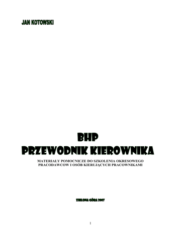MATERIAŁY POMOCNICZE DO SZKOLENIA OKRESOWEGO PRACODAWCOW I OSÓB KIERUJĄCYCH PRACOWNIKAMI 1 MATERIAŁY SZKOLENIOWE Z ZAKRESU BEZPIECZEŃSTWA I HIGIENY PRACY DLA PRACOWNIKÓW Zgodne z rozporządzeniem Ministra Gospodarki i Pracy z dnia 27 lipca 2004r. 9 (Dz. U. nr 180, poz.1860) w sprawie szkolenia w dziedzinie bezpieczeństwa i higieny pracy, ustawą z 26 czerwca 1974r. Kodeks pracy, (Dz.U.Nr.74 z 2002r, poz. 676. oraz Dz.U nr 135, poz. 1146, art. 237 2, 2373, 2374, 2375 z zm.) oraz art. 6 ust.1 ustawy z dnia 24 sierpnia 1991r. o ochronie przeciwpożarowej (Dz. U. Nr 81 poz. 351). Przewodnik może być wykorzystany do szkoleń pracowników w systemie samokształcenia kierowanego. Kopiowanie, zmienianie, przetwarzanie, rozpowszechnianie i wykorzystywanie materiałów w całości lub części, bez uzyskania zgody jest niedozwolone i stanowi naruszenie praw autorskich Zgodnie z Dz. U. 94 Nr 24 poz. 83, oraz Dz. U. 94 Nr 43 poz. 170, kopiowanie, i rozpowszechnianie tych materiałów w całości lub w części bez mojej zgody jest zabronione. 2 WSTĘP Ponieważ stosunek pracy powstaje w chwili podpisania umowy o pracę, na wcześniej obustronnie uzgodnionych warunkach wykonywania pracy, to zarówno pracodawca jak i pracownik powinni znać podstawowe zagadnienia prawa pracy, które są określone w kodeksie pracy. Warto pamiętać że część spraw nie uregulowanych w kodeksie pracy, jest regulowana w ustawach i rozporządzeniach rządu. Bardzo szczegółowe regulacje konkretnych, wymagających szczegółowych rozwiązań problemów znajduje się w Polskich Normach. Wykaz polskich norm, zharmonizowanych z dyrektywami europejskimi jest zawarty w pięciu załącznikach do Obwieszczenia Prezesa Polskiego Komitetu Normalizacyjnego z 6 kwietnia 2004 (M.P. nr 1, poz. 297). Trzeba pamiętać że Normy Europejskie są wprowadzane metodą uznania. Polska Norma w takim przypadku składa się z wydanej w języku polskim strony tytułowej oraz tekstu oryginału. Jest oznaczana znaczkiem (U). Jeśli przy symbolu normy spotkamy oznaczenie (H) oznacza to że mamy do czynienia z normą zharmonizowaną. Na szczeblu zakładu, uregulowania takie są zawarte w regulaminach pracy. Od 01 maja 2004 r. obowiązują w Polsce uregulowania Unii Europejskiej zawarte w Dyrektywach. Rozróżniamy dwie kategorie Dyrektyw Unii Europejskiej; a) Dyrektywy rynku wewnętrznego - wymagające pełnej harmonizacji z przepisami prawa obowiązującego w poszczególnych krajach członkowskich, b) Dyrektywy socjalne - wprowadzające tylko minimalne wymagania w zakresie, którego one dotyczą. Ważniejsze dyrektywy Unii Europejskiej, regulujące prawo pracy to: Dyrektywa Rady nr 93/104/WE z 23.11.1993r w sprawie pewnych aspektów czasu pracy. Dyrektywa Rady i Parlamentu Europejskiego nr 2000/34/WE z 22. 06. 2000 w sprawie pewnych aspektów czasu pracy w sektorach i działalności wyłączonej z tej dyrektywy. Dyrektywa Rady nr 91/533/WE z 14 października 1991 w sprawie obowiązku pracodawcy informowania pracowników o warunkach stosowania umowy o pracę lub stosunku pracy. Dyrektywa Rady nr 94/33/WE z dnia 22 lipca 1994r dotycząca ochrony młodocianych. Dyrektywa Rady nr 97/81/WE z dnia 15 grudnia 1997 dotycząca Umowy ramowej w sprawie zatrudniania w niepełnym wymiarze czasu pracy. Dyrektywa Rady nr 2000/78/WE z 27 listopada 2000 w sprawie ustanowienia ogólnych ram równego traktowania przy zatrudnianiu i wykonywaniu zawodu. Dyrektywa Rady nr 2000/43/WE z 29 czerwca 2000 w sprawie wdrożenia zasady równego traktowania osób bez względu na pochodzenie rasowe lub etniczne. Dyrektywa Rady nr 76/207/EWG z 9 lutego 1976 dotycząca wprowadzenia w życie zasady równego traktowania kobiet i mężczyzn, w zakresie dostępu do zatrudnienia, szkoleń zawodowych, awansu zawodowego, jak i warunków pracy. Dyrektywa Parlamentu Europejskiego i Rady nr 96/71/WE z dnia 16 grudnia 1996r dotycząca delegowania pracowników wykonywanego w ramach świadczenia usług. Dyrektywa Rady nr 99/70z dnia 28 czerwca 1999 dotycząca porozumienia ramowego w sprawie umów na czas określony. Dyrektywa Rady nr 89/391/EWG z dnia 12 czerwca 1989 o wprowadzeniu środków w celu zwiększenia bezpieczeństwa i poprawy zdrowia pracowników w czasie pracy. Jest to kluczowa dyrektyw socjalnych, inaczej zwana dyrektywą ramową. Kodeks pracy i Dyrektywy Unijne nie stawiają wymagań wyłącznie pracodawcom ale ustalają także obowiązki pracowników, nakładając na nich odpowiedzialność za własne bezpieczeństwo i zdrowie 3 innych osób, na które może wpływać ich praca dlatego należy zapoznać się z najwazniejszymi postanowieniami prawa pracy. CO POWINIENEŚ ZAPAMIĘTAĆ Z KODEKSU PRACY ? Ustawa z dnia 26 czerwca 1974 r. Kodeks pracy, uwzględniający zmiany prawne włącznie z nowelizacją ujętą w Dz.U.06.221.1615 z 2006.12.19r. - tekst jednolity. Rozdział I. PRZEPISY WSTĘPNE Art. 2. Pracownikiem jest osoba zatrudniona na podstawie umowy o pracę, mianowania, powołania, wyboru, lub spółdzielczej umowy o pracę. Art. 3. Pracodawcą jest jednostka organizacyjna, choćby nie posiadała osobowości prawnej, a także osoba fizyczna, jeżeli zatrudniają one pracowników. Art. 31.§ 1. Za pracodawcę będącego jednostką organizacyjną czynności w sprawach z zakresu prawa pracy dokonuje osoba lub zarządzający tą jednostką albo inna wyznaczona do tego osoba. Art. 9.§1. Ilekroć w Kodeksie mówi się o prawie pracy, rozumiemy przez to przepisy Kodeksu pracy, innych ustaw i aktów wykonawczych, określające prawa i obowiązki pracownika i pracodawcy, a także postanowienia układów zbiorowych pracy i innych opartych na ustawie porozumień zbiorowych, regulaminów i statutów określających prawa i obowiązki stron stosunku pracy. § 2. Postanowienia układów zbiorowych pracy i porozumień zbiorowych oraz regulaminów i statutów nie mogą być mniej korzystne dla pracowników niż przepisy Kodeksu pracy oraz innych ustaw i aktów wykonawczych. § 