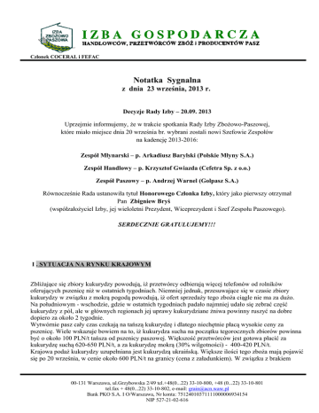 Członek COCERAL i FEFAC Notatka Sygnalna z dnia 23 września, 2013 r. Decyzje Rady Izby – 20.09. 2013 Uprzejmie informujemy, że w trakcie spotkania Rady Izby Zbożowo-Paszowej, które miało miejsce dnia 20 września br. wybrani zostali nowi Szefowie Zespołów na kadencję 2013-2016: Zespół Młynarski – p. Arkadiusz Barylski (Polskie Młyny S.A.) Zespół Handlowy – p. Krzysztof Gwiazda (Cefetra Sp. z o.o.) Zespół Paszowy – p. Andrzej Warnel (Golpasz S.A.) Równocześnie Rada ustanowiła tytuł Honorowego Członka Izby, który jako pierwszy otrzymał Pan Zbigniew Bryś (współzałożyciel Izby, jej wieloletni Prezydent, Wiceprezydent i Szef Zespołu Paszowego). SERDECZNIE GRATULUJEMY!!! I . SYTUACJA NA RYNKU KRAJOWYM Zbliżające się zbiory kukurydzy powodują, iż przetwórcy odbierają więcej telefonów od rolników oferujących pszenicę niż w ostatnich tygodniach. Niemniej jednak, przesuwające się w czasie zbiory kukurydzy w związku z mokrą pogodą powodują, iż ofert sprzedaży tego zboża ciągle nie ma za dużo. Na południowym - wschodzie, gdzie w ostatnich tygodniach padało najmniej udało się zebrać część kukurydzy z pól, ale w głównych regionach jej uprawy kukurydziane żniwa powinny ruszyć na dobre dopiero za około 2 tygodnie. Wytwórnie pasz cały czas czekają na tańszą kukurydzę i dlatego niechętnie płacą wysokie ceny za pszenicę. Wiele wskazuje bowiem na to, iż kukurydza sucha na początku tegorocznych zbiorów powinna być o około 100 PLN/t tańsza od pszenicy paszowej. Większość przetwórców jest gotowa płacić za kukurydzę suchą 620-650 PLN/t, a za kukurydzę mokrą (30% wilgotności) - 400-420 PLN/t. Krajowa podaż kukurydzy uzupełniana jest kukurydzą ukraińską. Większe ilości tego zboża mają pojawić się po 20 września, w cenie około 600 PLN/t na granicy (cena z załadunkiem). W związku z brakiem 00-131 Warszawa, ul.Grzybowska 2/49 tel.+48(0...22) 33-10-800, +48 (0...22) 33-10-801 tel.fax + 48(0...22) 33-10-802, e-mail: [email protected] Bank PKO S.A. I O/Warszawa, Nr konta: 75124010371111000006934154 NIP 527-21-02-616 2 opłacalności, na razie praktycznie nie jest realizowany import zbóż z Węgier czy Czech. Niewielkie partie ziarna sprowadzane są natomiast ze Słowacji. W połowie minionego tygodnia, ceny płacone przez przetwórców za tegoroczne ziarno z dostawą do wytwórni/elewatorów kształtowały się następująco: pszenica konsumpcyjna pszenica paszowa żyto konsumpcyjne żyto paszowe jęczmień paszowy pszenżyto kukurydza (zbiór 2012) - 730 - 770 PLN/t (w zależności od jakości ziarna); - 720 -760 PLN/t; - 490 - 530 PLN/t; - 490 - 520 PLN/t; - 700 - 750 PLN/t - 580 - 630 PLN/t; - 750 - 800 PLN/t; W portach cały czas notuje się wzmożony ruch, gdzie trwa eksport zbóż (głównie pszenicy i żyta oraz kukurydzy ze zbiorów 2012), ale głównie w ramach wcześniej zawartych kontraktów. Notowany w ostatnich dniach wyraźny wzrost kosztów frachtu, umocnienie złotego i mniejsze zapotrzebowanie na ziarno ze strony importerów wpłynęły na ograniczenie bieżących zakupów zbóż do portów przez eksporterów i spadki cen ziarna z dostawą do portów. II. CENY NA GIEŁDACH CBOT i MATIF Na przestrzeni minionego tygodnia ceny pszenicy na giełdzie w Chicago nieznacznie wzrosły. Wysoka sprzedaż pszenicy z rynku amerykańskiego na eksport w ostatnim tygodniu sprawozdawczym (ponad 700 tys. ton) wpłynęła na umocnienie jej cen. W piątek 23/09, na giełdzie w Chicago cena pszenicy SRW w kontrakcie grudniowym 2013 wzrosła o 0,8% w stosunku do ceny sprzed tygodnia do 237,44 USD/t, a w kontrakcie marcowym 2014 o 0,7% i wyniosła 241,41 USD/t. Z kolei, na giełdzie w Kansas City, cena pszenicy HRW w kontrakcie grudniowym 2013 wzrosła o 0,1% do 254,19 USD/t, a w kontrakcie marcowym 2014 spadła o 0,2% i wyniosła 256,18 USD/t. W analizowanym tygodniu, notowania cen pszenicy na MATIFie zniżkowały, ale skala spadków była niewielka. W ostatnich 8 tygodniach, ceny pszenicy w kontrakcie najbliższym na giełdzie w Paryżu cały czas poruszają się w przedziale 180-190 euro/t. Pomimo obfitych zbiorów pszenicy w UE, utrzymujący się wysoki poziom eksportu tego zboża z UE do krajów trzecich podtrzymuje ceny pszenicy na MATIFie. W piątek 23/09, cena pszenicy w kontrakcie najbliższym (listopad 2013) na MATIFie wyniosła 185,25 EUR/t i była o 0,3% niższa w stosunku do ceny sprzed tygodnia, a w kontrakcie styczniowym 2014 spadła o 0,1% do poziomu 186,25 EUR/t. Na przestrzeni analizowanego tygodnia, notowania cen soi na giełdzie w Chicago osłabły, głównie pod wpływem czynników pogodowych. Prognozy utrzymania się ciepłej pogody przynajmniej do początku października i sucha pogoda po ostatnich deszczach powinny wpłynąć na poprawę kondycji soi w kluczowych dla jej uprawy stanach USA (Iowa, Minnesota). W piątek 23/09, cena soi na giełdzie w Chicago w kontrakcie najbliższym (listopad 2013) wyniosła 483,25 USD/t i była o 4,8% niższa niż przed tygodniem. Z kolei, cena soi z terminem realizacji w styczniu 2014 roku spadła o 4,5% do 484,28 USD/t. W analizowanym tygodniu, ceny rzepaku na giełdzie MATIF także osłabły, do najniższego poziomu od połowy sierpnia br. Lepsze od spodziewanych zbiory canoli w Kanadzie oraz notowane spadki cen soi za oceanem wywołały korektę cen rzepaku na MATIFie. W piątek 23/09, cena rzepaku w kontrakcie najbliższym (listopad 2013) wyniosła 363,00 EUR/t i była o 3,5% niższa niż przed tygodniem, podczas gdy cena rzepaku w kontrakcie lutowym 2014 wyniosła 367,75 EUR/t i była o 3,3% niższa w stosunku do ceny sprzed tygodnia. Analiza opracowana przez Sparks Polska, Izbę Zbożowo-Paszową 3 NOTOWANIA CEN ZBÓŻ NA GIEŁDZIE W CHICAGO CBOT - KUKURYDZA USD/t 26.VII 2.VIII 9.VIII 16.VIII 23.VIII 30.VIII 6.IX 13.IX 20.IX 20.IX/13.IX XII'13 187,39 III'14 192,35 V'14 195,42 VII'14 198,02 IX'14 198,57 CBOT - PSZENICA SRW 182,51 187,55 190,62 
