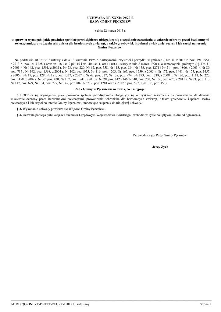 UCHWAŁA NR XXXI/179/2013 RADY GMINY PĘCZNIEW z dnia 22 marca 2013 r. w sprawie: wymagań, jakie powinien spełniać przedsiębiorca ubiegający się o uzyskanie zezwolenia w zakresie ochrony przed bezdomnymi zwierzętami, prowadzenia schroniska dla bezdomnych zwierząt, a także grzebowisk i spalarni zwłok zwierzęcych i ich części na terenie Gminy Pęczniew. Na podstawie art. 7 ust. 3 ustawy z dnia 13 września 1996 r. o utrzymaniu czystości i porządku w gminach ( Dz. U. z 2012 r. poz. 391 i 951, z 2013 r., poz. 21 i 228 ) oraz art. 18 ust. 2 pkt 15 i art. 40 ust. 1, art.41 ust.1 ustawy z dnia 8 marca 1990 r. o samorządzie gminnym (t.j. Dz. U. z 2001 r. Nr 142, poz. 1591, z 2002 r. Nr 23, poz. 220, Nr 62, poz. 558, Nr 113, poz. 984, Nr 153, poz. 1271 i Nr 214, poz. 1806, z 2003 r. Nr 80, poz. 717 , Nr 162, poz. 1568, z 2004 r. Nr 102, poz.1055, Nr 116, poz. 1203, Nr 167, poz. 1759, z 2005 r. Nr 172, poz. 1441, Nr 175, poz. 1457, z 2006 r. Nr 17, poz. 128, Nr 181, poz. 1337, z 2007 r. Nr 48, poz. 327, Nr 138, poz. 974 , Nr 173, poz. 1218, z 2008 r. Nr 180, poz. 1111, Nr 223, poz. 1458, z 2009 r. Nr 52, poz. 420, Nr 157, poz. 1241, z 2010 r. Nr 28, poz. 142 i 146, Nr 40, poz. 230, Nr 106, poz. 675, z 2011 r. Nr 21, poz. 113, Nr 117, poz. 679, Nr 134, poz. 777, Nr 149, poz. 887, Nr 217, poz. 1281 oraz z 2012 r. poz. 567, z 2013 r., poz. 153) Rada Gminy w Pęczniewie uchwala, co następuje: § 1. Określa się wymagania, jakie powinien spełniać przedsiębiorca ubiegający się o uzyskanie zezwolenia na prowadzenie działalności w zakresie ochrony przed bezdomnymi zwierzętami, prowadzenia schroniska dla bezdomnych zwierząt, a także grzebowisk i spalarni zwłok zwierzęcych i ich części na terenie Gminy Pęczniew , stanowiące załącznik do niniejszej uchwały. § 2. Wykonanie uchwały powierza się Wójtowi Gminy Pęczniew . § 3. Uchwała podlega publikacji w Dzienniku Urzędowym Województwa Łódzkiego i wchodzi w życie po upływie 14 dni od ogłoszenia. Przewodniczący Rady Gminy Pęczniew Jerzy Zych ———————————————————————————————————————————————————————————— Id: DIXQO-BNLYT-DNTTF-OFGRK-HJHXI. Podpisany Strona 1 Załącznik do Uchwały Nr XXXI/179/2013 Rady Gminy Pęczniew z dnia 22 marca 2013 r. WYMAGANIA JAKIE POWINIEN SPEŁNIAĆ PRZEDSIĘBIORCA UBIEGAJĄCY SIĘ O UZYSKANIE ZEZWOLENIA NA PROWADZENIE DZIAŁALNOŚCI W ZAKRESIE OCHRONY PRZED BEZDOMNYMI ZWIERZĘTAMI, PROWADZENIA SCHRONISKA DLA BEZDOMYCH ZWIERZĄT, A TAKŻE GRZEBOWISK I SPALARNI ZWŁOK ZWIERZĘCYCH I ICH CZĘŚCI NA TERENIE GMINY PĘCZNIEW. § 1. Określa się wymagania, jakie powinien spełniać przedsiębiorca ubiegający się o uzyskanie zezwolenia na prowadzenie działalności w zakresie ochrony przed bezdomnymi zwierzętami, prowadzenia schronisk dla bezdomnych zwierząt, a także grzebowisk i spalarni zwłok zwierzęcych i ich części. § 2. 1. Przedsiębiorca ubiegający się o uzyskanie zezwolenia na prowadzenie działalności w zakresie ochrony przed bezdomnymi zwierzętami winien spełniać następujące wymagania: 1) posiadać potencjał kadrowy i techniczny, zapewniający stałe świadczenie usług; 2) posiadać środek transportu, spełniający wymagania w zakresie transportu zwierząt, określone w ustawie z dnia 21 sierpnia 1997 r. o ochronie zwierząt zapewniając prowadzenie transportu w odpowiednich warunkach, a w szczególności: a) środki transportu zwierząt powinny spełniać warunki trzymania odpowiedniej temperatury, wentylacji, przestrzeni oraz naturalnej pozycji; b) podłogi pojazdów używanych do transportu zwierząt powinny mieć odpowiednią nawierzchnię, zapewniającą przyczepność kończyn oraz umożliwiającą utrzymanie higieny; 3) posiadać atestowane urządzenia i środki do wyłapywania zwierząt, nie stwarzające zagrożenia dla ich życia i zdrowia ani nie zadające im cierpień; 4) zapewniać, w razie potrzeby, pomoc weterynaryjną wyłapanym zwierzętom; 5) zapewniać, w razie potrzeby, odbiór zwłok zwierząt przez podmiot zajmujący się unieszkodliwianiem zwłok zwierząt; 6) posiadać tytuł prawny do nieruchomości, na której prowadzona jest działalność gospodarcza w zakresie przetrzymywania wyłapanych zwierząt przed przewiezieniem ich do schroniska; 7) przedsiębiorca nie może być karany z art.. 35, art. 37 lub art. 37 b ustawy z dnia 21 sierpnia 1997 r. o ochronie zwierząt. 2. Do wniosku należy dodatkowo dołączyć: 1) zaświadczenie o niekaralności; 2) zaświadczenie o braku zaległości podatkowych i zaległości w płaceniu składek na ubezpieczenie zdrowotne lub społeczne; 3) odpis z właściwego rejestru albo zaświadczenie o wpisie do ewidencji działalności gospodarczej; 4) oświadczenie o posiadanych kadrach, w tym: a) kierowcy i konwojenci zatrudnieni przy transporcie zwierząt, winni posiadać zaświadczenia potwierdzające ich kwalifikacje niezbędne przy transporcie zwierząt, wystawione przez powiatowego lekarza weterynarii, właściwego dla miejsca zatrudnienia tych osób, b) pracownicy mający kontakt z wyłapywanymi lub transportowanymi zwierzętami, nie mogą być karani z art. 35, art. 37 lub art. 37b ustawy z dnia 21 sierpnia 1997 r. o ochronie zwierząt. 3. Spełnienie powyższych wymagań przedsiębiorca winien udokumentować poprzez dołączenie do składanego wniosku o uzyskanie zezwolenia na prowadzenie działalności w zakresie ochrony przed bezdomnymi zwierzętami oryginałów lub kserokopii dokumentów potwierdzonych za zgodność z oryginałem przez osobę upoważnioną do reprezentowania przedsiębiorcy. § 3. 1. Przedsiębiorca ubiegający się o uzyskanie zezwolenia na prowadzenie działalności w zakresie prowadzenia schronisk dla bezdomnych zwierząt winien spełniać następujące wymagania: 1) posiadać potencjał kadrowy i techniczny, zapewniający stałe świadczenie usług; 2) posiad