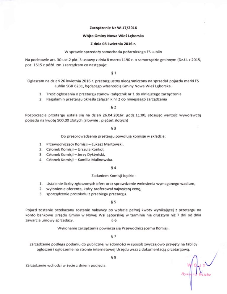 Zarządzenie Nr W-17/2016 Wójta Gminy Nowa Wieś Lęborska Z dnia 08 kwietnia 2016 r. W sprawie sprzedaży samochodu pożarniczego FS Lublin Na podstawie art. 30 ust.2 pkt. 3 ustawy z dnia 8 marca 1190 r. o samorządzie gminnym (Dz.U. z 2015, poz. 1515 z późń. zm.) zarządzam co następuje: §1 Ogłaszam na dzień 26 kwietnia 2016 r. przetarg ustny nieograniczony na sprzedaż pojazdu marki FS Lublin SGR 6231, będącego własnością Gminy Nowa Wieś Lęborska. 1. Treść ogłoszenia o przetargu stanowi załącznik nr 1 do niniejszego zarządzenia 2. Regulamin przetargu określa załącznik nr 2 do niniejszego zarządzenia §2 Rozpoczęcie przetargu ustala się na dzień 26.04.2016r. godz.11:00, stosując wartość wywoławczą pojazdu na kwotę 500,00 złotych (słownie : pięćset złotych) §3 Do przeprowadzenia przetargu powołuję komisje w składzie: 1. 2. 3. 4. Przewodniczący Komisji - Łukasz Mertowski, Członek Komisji - Urszula Konkol, Członek Komisji - Jerzy Dyktyński, Członek Komisji - Kamilla Malinowska. §4 Zadaniem Komisji będzie: 1. Ustalenie liczby zgłoszonych ofert oraz sprawdzenie wniesienia wymaganego wadium, 2. wyłonienie oferenta, który zaoferował najwyższą cenę, 3. sporządzenie protokołu z przebiegu przetargu. §5 Pojazd zostanie przekazany zostanie nabywcy po wpłacie pełnej kwoty wynikającej z przetargu na konto bankowe Urzędu Gminy w Nowej Wsi Lęborskiej w terminie nie dłuższym niż 7 dni od dnia zawarcia umowy sprzedaży. §6 Wykonanie zarządzenia powierza się Przewodniczącemu Komisji. §7 Zarządzenie podlega podaniu do publicznej wiadomości w sposób zwyczajowo przyjęty na tablicy ogłoszeń i ogłoszenie na stronie internetowej Urzędu wraz z dokumentacją przetargową. §8 Zarządzenie wchodzi w życie z dniem podjęcia. Załącznik nr 1 do zarządzenia Wójta Gminy Nowa Wieś Lęborska Nr W-17/2016 z dnia 08 kwietnia 2016 r. OGŁOSZENIE Wójt Gminy Nowa Wieś Lęborska ogłasza przetarg ustny nieograniczony na zbycie samochodu pożarniczego 1. Opis przedmiotu sprzedaży Przedmiotem zbycia jest samochód pożarniczy marki FS Lublin nr rejestracyjny SGR 6231stanowiący własność Gminy Nowa Wieś Lęborska. Dane identyfikacyjne pojazdu: Marka i model: FS Lublin, samochód specjalny Rodzaj pojazdu: samochód pożarniczy Nr rejestracyjny: SGR 6231 Pierwsza rejestracja: 1972 Nr ramy: 674372 Producent: FS Lublin Kolor: czerwony Pojemność i moc silnika: 2120 ccm, 51 kW Samochód można obejrzeć po uprzednim skontaktowaniu się z Panem Leszkiem Kilanowskim tel. 729 240 012 2. Cena wywoławcza samochodu wynosi 500,00 złotych brutto 3. Warunki uczestnictwa: W przetargu mogą wziąć udział wszystkie osoby fizyczne i prawne, oraz inne podmioty mające zdolność prawną, które wniosły wadium w wysokości 50,00 (nr rachunku bankowego 27 9324 0008 0002 7209 2000 0010), najpóźniej w dniu poprzedzającym przetarg. Nabywca, który zaoferował najwyższą cenę będzie zobowiązany do zapłaty pełnej kwoty w terminie wyznaczonym przez przewodniczącego Komisji Przetargowej, nie dłuższym niż 7 dni. Należność powinna być wniesiona na konto Urzędu Gminy w Nowej Wsi Lęborskiej 27 9324 0008 0002 7209 2000 0010. Sprzedawca nie bierze odpowiedzialności za stan techniczny zbywanego samochodu, bowiem ryzyko w tym zakresie przechodzi na kupującego, który zapoznał się/miał możliwość zapoznania się ze stanem technicznym zbywanego pojazdu Postępowanie przetargowe odbędzie się w siedzibie zbywającego: Urząd Gminy w Nowej Wsi Lęborskiej, ul. Grunwaldzka 24 pokój 117 o godz. 11:00 Zbywający zastrzega sobie prawo odwołania sprzedaży w każdym czasie bez podania przyczyny. Wydanie przedmiotu zbycia nastąpi po wpłacie pełnej kwoty w terminie nie dłuższym niż 7 dni od dnia zawarcia umowy sprzedaży. Załącznik nr 2 do zarządzenia Wójta Gminy Nowa Wieś Lęborska Nr W-17/2016 z dnia 8 kwietnia 2016 r. Regulamin przetargu Na sprzedaż pojazdu marki FS Lublin, będącego własnością Gminy Nowa Wieś Lęborska 1. Do przetargu mogą stanąć osoby fizyczne i prawne oraz podmioty posiadające zdolność prawną, które okażą komisji przetargowej dowód wpłaty wadium. 2. Wadium ustala się w wysokości 50,00 zł. Należy je wpłacić do kasy lub na konto Urzędu (nr rachunku 27 9324 0008 0002 7209 2000 0010), najpóźniej w dniu poprzedzającym przetarg. Cena wywoławcza wynosi 500,oo zł brutto 3. Postąpienie nie może wynosić mniej niż 1% ceny wywoławczej z zaokrągleniem w górę do pełnych dziesiątek złotych i więcej niż wysokość wadium, lecz o wysokości postąpienia decydują uczestnicy przetargu. 4. Wadium wpłacone przez uczestnika przetargu, który przetarg wygra, zostanie zaliczone na poczet ceny nabycia. 5. Po ustaniu postąpień przewodniczący komisji przetargowej wywołuje trzykrotnie ostatnią, najwyższą cenę i zamyka przetarg, a następnie ogłasza imię i nazwisko lub nazwę firmy, która przetarg wygrała. 6. Przetarg jest ważny bez względu na liczbę uczestników, jeżeli chociaż jeden uczestnik zaoferował co najmniej jedno postąpienie powyżej ceny wywoławczej. 7. Osoba wygrywająca przetarg zobowiązana jest do wpłaty pełnej kwoty na konto bankowe urzędu (nr rachunku 27 9324 0008 0002 7209 2000 0010) lub w kasie urzędu w terminie wskazanym przez przewodniczącego komisji, nie dłuższym niż 7 dni. 8. Jeżeli osoba, która przetarg wygrała przetarg, nie stawi się do podpisania umowy w terminie wskazanym przez przewodniczącego komisji organizator przetargu może odstąpić od zawarcia umowy, a wpłacone wadium nie podlega zwrotowi. 9. Komisja przetargowa sporządza protokół zawierający: - określający miejsce i datę przetargu, - skład komisji przetargowej, - wysokość stawki wywoławczej licytowanej ruchomości, - wylicytowaną stawkę za ruchomość będącą przedmiotem przetargu, - imię i nazwisko osoby wygrywającej przetarg, - wnioski i oświadczenia osób uc