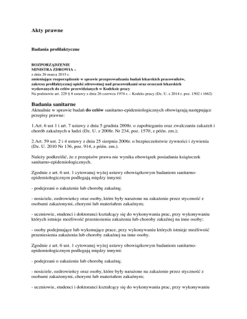 Akty prawne Badania profilaktyczne ROZPORZĄDZENIE MINISTRA ZDROWIA 1) z dnia 26 marca 2015 r. zmieniające rozporządzenie w sprawie przeprowadzania badań lekarskich pracowników, zakresu profilaktycznej opieki zdrowotnej nad pracownikami oraz orzeczeń lekarskich wydawanych do celów przewidzianych w Kodeksie pracy Na podstawie art. 229 § 8 ustawy z dnia 26 czerwca 1974 r. – Kodeks pracy (Dz. U. z 2014 r. poz. 1502 i 1662) Badania sanitarne Aktualnie w sprawie badań do celów sanitarno-epidemiologicznych obowiązują następujące przepisy prawne: 1.Art. 6 ust 1 i art. 7 ustawy z dnia 5 grudnia 2008r. o zapobieganiu oraz zwalczaniu zakażeń i chorób zakaźnych u ludzi (Dz. U. z 2008r. Nr 234, poz. 1570, z późn. zm.); 2.Art. 59 ust. 2 i 4 ustawy z dnia 25 sierpnia 2006r. o bezpieczeństwie żywności i żywienia (Dz. U. 2010 Nr 136, poz. 914, z późn. zm.). Należy podkreślić, że z przepisów prawa nie wynika obowiązek posiadania książeczek sanitarno-epidemiologicznych. Zgodnie z art. 6 ust. 1 cytowanej wyżej ustawy obowiązkowym badaniom sanitarnoepidemiologicznym podlegają między innymi: - podejrzani o zakażenie lub chorobę zakaźną; - nosiciele, ozdrowieńcy oraz osoby, które były narażone na zakażenie przez styczność z osobami zakażonymi, chorymi lub materiałem zakaźnym; - uczniowie, studenci i doktoranci kształcący się do wykonywania prac, przy wykonywaniu których istnieje możliwość przeniesienia zakażenia lub choroby zakaźnej na inne osoby; - osoby podejmujące lub wykonujące prace, przy wykonywaniu których istnieje możliwość przeniesienia zakażenia lub choroby zakaźnej na inne osoby. Zgodnie z art. 6 ust. 1 cytowanej wyżej ustawy obowiązkowym badaniom sanitarnoepidemiologicznym podlegają między innymi: - podejrzani o zakażenie lub chorobę zakaźną; - nosiciele, ozdrowieńcy oraz osoby, które były narażone na zakażenie przez styczność z osobami zakażonymi, chorymi lub materiałem zakaźnym; - uczniowie, studenci i doktoranci kształcący się do wykonywania prac, przy wykonywaniu których istnieje możliwość przeniesienia zakażenia lub choroby zakaźnej na inne osoby; - osoby podejmujące lub wykonujące prace, przy wykonywaniu których istnieje możliwość przeniesienia zakażenia lub choroby zakaźnej na inne osoby. Należy podkreślić, że wykonanie badań każdorazowo z chwilą podjęcia pracy, również przy zmianie pracodawcy jest merytorycznie uzasadnione, gdyż w zależności od rodzaju wykonywanej pracy istnieje ryzyko szerzenia się różnych zakażeń lub szerzenia się ich różnymi drogami. Obowiązek wykonania badań do celów sanitarno-epidemiologicznych określa również art. 59 ust. 2 ustawy o bezpieczeństwie żywności i żywienia, zgodnie z którym osoba pracująca w styczności z żywnością powinna uzyskać określone przepisami o zapobieganiu oraz zwalczaniu zakażeń i chorób zakaźnych u ludzi orzeczenie lekarskie dla celów sanitarnoepidemiologicznych o braku przeciwwskazań do wykonywania prac, przy wykonywaniu których istnieje możliwość przeniesienia zakażenia na inne osoby. Kopie orzeczenia lekarskiego winny znajdować się w miejscu wykonywania pracy przez osobę, której dotyczy to orzeczenie (art. 59 ust. 4 i 5 ustawy o bezpieczeństwie żywności i żywienia). Zgodnie z art. 7 ust. 1 ustawy o zapobieganiu oraz zwalczaniu zakażeń i chorób zakaźnych u ludzi badanie sanitarno-epidemiologiczne przeprowadzają lekarze podstawowej opieki zdrowotnej lub lekarze wykonujący zadania służby medycyny pracy, w rozumieniu przepisów ustawy z dnia 27 czerwca 1997r. o służbie medycyny pracy (Dz. U. z 2004r. Nr 125, poz. 1317, z późn. zm.) Badanie obejmuje badanie lekarskie i badanie laboratoryjne. W skład badań laboratoryjnych wchodzi badanie kału w kierunku zakażenia pałeczkami duru brzusznego, durów rzekomych A, B i C, innych pałeczek z rodzaju Salmonella i Shigella. Jeżeli z próby uzyskany zostanie wynik dodatni, to uznaje się, że osoba u której przeprowadzono to badanie, jest identyfikowana jako osoba zakażona odpowiednim czynnikiem chorobotwórczym. Jeżeli w trakcie badania lekarskiego zachodzi podejrzenie gruźlicy lub zakażenia innym czynnikiem chorobotwórczym niż ww. to powinny być przeprowadzone dodatkowe badania laboratoryjne. Na podstawie badania lekarskiego oraz wyników badań laboratoryjnych lekarz wydaje orzeczenie o braku przeciwwskazań, czasowym lub trwałym przeciwwskazaniu do wykonywania prac lub odbywania nauki. Należy stwierdzić, iż obowiązkiem pracodawcy jest przechowywanie orzeczeń lekarskich o braku przeciwwskazań bądź o czasowym lub trwałym przeciwwskazaniu do wykonywania prac, natomiast książeczka badań dla celów sanitarnoepidemiologicznych (dokument obowiązujący do dnia 31.12.2011r.) stanowi dokumentację osoby, u której przeprowadzono badania. Osoby, u których orzeczono czasowe lub trwałe przeciwwskazania do wykonywania prac nie mogą tych prac wykonywać. Pracodawca lub zlecający wykonanie prac zobowiązany jest z zachowaniem poufności, niezwłocznie odsunąć pracownika lub wykonującego prace od ich wykonywania, o czym mówi art. 10 ust. 1 ustawy o zapobieganiu oraz zwalczaniu zakażeń i chorób zakaźnych u ludzi. Aktualnie obowiązujące przepisy prawne nie wskazują czy i jak często badanie do celów sanitarno-epidemiologicznych ma być odnawiane. Lekarz, w oparciu o posiadaną wiedzę medyczną oraz po uzyskaniu informacji od pracownika o rodzaju i miejscu świadczenia pracy ma możliwość wskazania następnego terminu przeprowadzenia przedmiotowych badań. Jeżeli nie istnieją przesłanki wskazujące na zakażenie czynnikami uniemożliwiającymi wykonywanie określonych prac, to orzeczenie lekarskie jest ważne. O aktualności badań decyduje również kontynuacja pracy w tym samym zakładzie. W celu ujednolicenia sposobu wykonywania tych badań Główny Inspektor Sanitarny zajął stanowisko, że kolej