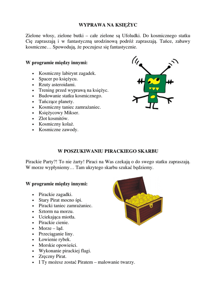 WYPRAWA NA KSIĘŻYC Zielone włosy, zielone butki – całe zielone są Ufoludki. Do kosmicznego statku Cię zapraszają i w fantastyczną urodzinową podróż zapraszają. Tańce, zabawy kosmiczne… Spowodują, że poczujesz się fantastycznie. W programie między innymi: • • • • • • • • • • • Kosmiczny labirynt zagadek. Spacer po księżycu. Rzuty asteroidami. Trening przed wyprawą na księżyc. Budowanie statku kosmicznego. Tańczące planety. Kosmiczny taniec zamrażaniec. Księżycowy Mikser. Zlot kosmitów. Kosmiczny kolaż. Kosmiczne zawody. W POSZUKIWANIU PIRACKIEGO SKARBU Pirackie Party?! To nie żarty! Piraci na Was czekają o do swego statku zapraszają. W morze wypłyniemy… Tam ukrytego skarbu szukać będziemy. W programie między innymi: • • • • • • • • • • • • • Pirackie zagadki. Stary Pirat mocno śpi. Piracki taniec zamrażaniec. Sztorm na morzu. Uciekająca miotła. Pirackie cienie. Morze – ląd. Przeciąganie liny. Łowienie rybek. Morskie opowieści. Wykonanie pirackiej flagi. Zręczny Pirat. I Ty możesz zostać Piratem – malowanie twarzy. BAL U ALICJI Z KRAINY CZARÓW W czarodziejskiej krainie zabawa z Alicją Cię nie ominie! Zaczarowane tańce i zagadki poznasz, gdy przyjdziesz na urodziny do Przedszkolnej Chatki. Alicja i królik czekają do zabawy wszystkich zapraszają. W programie między innymi: • • • • • • • • • • • • • Poszukiwanie królika. Zagadki z zaczarowanego kapelusza. Krasnoludek. Gąsienicowy kolaż. Gąsienicowe wyścigi. Idzie stonoga, aż się trzęsie podłoga. Kraina zaczarowanych instrumentów. Taniec kwiatów i motyli. Uciekający królik. Zaczarowane sukienki. Puzzle. Kwiaty w wazonie. Kolorowe malowane twarze. SPOTKANIE Z KUBUSIEM PUCHATKIEM Już pora wstać, wyruszyć z domu i Puchatka spotkać znów. Weź go za łapkę i odwiedź Przedszkolna Chatkę. Urodziny w Stumilowym lesie wyprawimy, z przyjaciółmi Puchatka się pobawimy. W programie między innymi: • • • • • • • • • • • • Puchatkowe pląsy. Sowa – zagadki z Puchatka Chatki. Tygrysek – brykanie, zabawa z balonami. Kłapouchy – poszukiwanie ogonka. Kubusiu ile kroków do Ciebie. Przyjaciel do przyjaciela. Puchatkowa nić przyjaźni. Lot na owadzie. Leśny taniec zamrażaniec. Przysmaki Kangurzycy, czyli małe, co nieco. Pszczółki i miód. Puchatkowy kolaż. BAL MAŁEJ KSIĘŻNICZKI Czary mary, hokus pokus… A na zamku mnóstwo pokus. Księżniczki pięknie się uśmiechają i na królewskie urodziny zapraszają. Zamek zwiedzać będziemy tu mnóstwo tajemnic odkryjemy. W programie między innymi: • • • • • • • • • • • • Poszukiwanie królewskich skarbów. Królewskie zagadki. Krasnoludek. Pocałuj żabkę. Salon śmiesznych min. Uciekający królewski poczęstunek. Budowanie zamku. Królewskie kalambury. Wybór króla/ królowej balu. Królewskie zawody. Królewskie gry i zabawy z balonami, wstążkami. Salon piękności – malowanie twarzy. SMERFNE URODZINY Hej dzieci, jeśli chcecie zobaczyć Smerfów świat… Na urodziny Smerfetka zaprasza Was. Czekają smerfne gry, zabawy, zgadywanki oraz inne niespodzianki. Gargamela tam spotkamy - więc nie zwlekaj zapraszamy! W programie między innymi: • • • • • • • • • • • • • Spotkanie ze Smerfetką. Zagadki Papa Smerfa. Smerfna dyskoteka ze Smerfetką. Ucieczka przed Gargamelem. Zgrywusowe wygłupy Łasuchowe pyszności. Malowane twarze w salonie Lalusia. Niespodzianki od Marzyciela. Gry, zabawy piosenki z Poetą. Plastyczne niespodzianki z Pracusiem. Smerfne puzzle. Uciekający kocur. Uwaga Smerfy Gargamel nadchodzi. URODZINY W AFRYKAŃSKIEJ DŻUNGLI Król lew i zwierzęta z Afryki zapraszają na urodzinowe wybryki. Mamę, tatę pożegnamy - z mieszkańcami dżungli w fantastyczną podróż zapraszamy. Spotkasz tam przyjaciół wielu, więc nie zwlekaj przyjacielu. Przyjdź dziś do nas z kolegami do Afryki wyruszamy! W programie między innymi: • • • • • • • • • • • • • • Podróż samolotem do Afryki. Zwierzęca pantomima. Czyje to ślady…gra z wykorzystaniem kostki i śladów zwierząt? Maski zwierzęce – zabawa plastyczna. Stary lew mocno śpi. Kto się ukrył w dżungli, czyj to głos? Nakarm małpkę. Wyścigi tygrysów. Polowanie na arbuzy. Afrykańskie powitanie. Zwierzęce zagadki. Bananowy kolaż. Afrykańskie tańce. Puzzle. W INDIAŃSKIEJ WIOSCE Indianie przybywają na solenizanta wezwanie i chcą się zabawić w życzeń spełnianie. Wigwam szeroko otwierają do zabawy zapraszają, czarne stopy się skradają i wiele uciech indiańskich dla wszystkich mają. W programie między innymi: • • • • • • • • • • • • • • • • • • Powitanie wszystkich z plemienia „Siuksów”. Mianowanie jubilata na wielkiego wodza. Nadanie indiańskich imion uczestnikom. Wykonanie pióropuszy. Fajka pokoju przy ognisku. Obrady Rady Starszych Plemienia. Zabawa w polowanie. Wykonanie bizonów. Barwy wojenne – malowanie twarzy. Indiański poczęstunek. Wykonanie totemów. Zabawa tropiąca – poszukiwanie pióropusza. Indiański taniec i kalambury Strzelanie z łuku. Indiańskie kręciołki. Rzucanie strzałą. Indiański tor przeszkód. Taniec pożegnalny przy ognisku. HAWAJSKIE URODZINY Hawajskie urodziny wyprawiamy, wszystkich chętnych do nas zapraszamy. Będzie śmiesznie, kolorowo no i bardzo owocowo. Taniec hula zatańczymy i każdego rozbawimy. W programie między innymi: • • • • • • • • • • • • • • Taniec hula. Ananasowe kręgle. Kręcenie hula hop. Szukanie ukrytego skarbu w ogrodzie. Gra w hawajskiego balonika. Hawajskie zawody. Tworzenie wspólnej girlandy. Uwolnienie Hawajki. Chodzenie po kamieniach. Hawajski makijaż. Łowienie ryb. Hawajskie tańce z pomponami i wstążkami. Przechodzenie pod liną. Taca pełna owoców. RYCERSKIE BITWY Czary mary, hokus pokus… A na zamku m