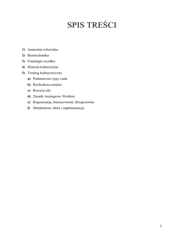 SPIS TREŚCI 1) Anatomia człowieka 2) Biomechanika 3) Fizjologia wysiłku 4) Historia kulturystyki 5) Trening kulturystyczny a) Podstawowe typy ciała b) Rozbudowa mięśni c) Rozwój siły d) Zasady treningowe Weidera e) Regeneracja, Intensywność, Rozgrzewka f) Metabolizm, dieta i suplementacja ! 1! ANATOMIA CZŁOWIEKA Anatomia Człowieka Anatomia – to dział nauk biologicznych, opisujący budowę, skład i kształt ciała człowieka. Termin Anatomia pochodzi od greckiego słowa „anatemnein” znaczącego krojenie, sekcja i odzwierciedla metody poznawania budowy ciała. Anatomię prawidłową człowieka przedstawia się w sposób opisowy (systematyczny), według uporządkowanej kolejności układów i narządów, lub topograficznie, według przestrzennego położenia narządów i układów względem siebie. W skład aparatu ruchu wchodzą: układ kostny, układ połączeń kostnych oraz układ mięśniowy. Układ szkieletowy (systema skeletale) Szkielet człowieka zbudowany jest z 206 kości, które spełniają wiele mechanicznych i metabolicznych funkcji. Szkielet utrzymuję masę ciała, zapewnia kształt ciała, chroni narządy wewnętrzne (mózg, serce, płuca), służy jako miejsce przyczepu ścięgien mięśni i więzadeł. W kościach zgromadzone są składniki mineralne, głównie wapń i fosfor, są one także miejscem wytwarzania szpiku kostnego. Budowa strukturalna kości. Tkanka kostna charakteryzuje się dużą twardością i lekkością, przy czym zachowuje bardzo dużą odporność na działanie sił zewnętrznych, zawdzięczając to swej budowie strukturalnej. Tkanka kostna zbudowana jest z blaszek kostnych. Układ i gęstość tych blaszek warunkuję właściwości mechaniczne tkanki kostnej. Dzieli się ją na: - istotę gąbczastą, w której blaszki kostne łącząc się, tworzą zwarte struktury nazywane beleczkami kostnymi. Beleczki kostne wytwarzają określony układ przebiegu uwarunkowany działaniem sił zewnętrznych. Istota gąbczasta występuje w środkowej części kości płaskich oraz wypełnia nasady kości długich. Między beleczkami kostnymi istoty gąbczastej znajduje się szpik kostny czerwony. - istota zbita, która głównie tworzy trzony kości długich i warstwę zewnętrzną kości płaskich. Istota zbita składa się z osteonów, które tworzą system Haversa, składający się z koncentrycznie ułożonych blaszek kostnych, tworzących w środku kanał, w którym przebiegają naczynia krwionośne i nerwy. Wewnątrz trzonu występuje jama szpikowa, gdzie wytwarzany jest szpik kostny żółty. 1 Zewnętrzna powierzchnia kości, z wyjątkiem powierzchni stawowych, pokryta jest tkanką łączną zwaną okostną, która jest mocno unaczyniona i unerwiona i pełni ważną funkcję w procesach rozrodczych, wzrostowych i regeneracyjnych kości. Kości dzielą się pod względem kształtu: - kości krótkie – kości śródręcza, śródstopia; - różnokształtne - kości nadgarstka, stępu, kręgi; - kości płaskie – kości czaszki, mostek, łopatka; - kości pneumatyczne – kość czołowa, sitowa, klinowa, szczękowa; - kości długie – udowa, ramienna, kości podudzia, przedramienia, obojczyk. Kościec człowieka dzieli się na: Kościec osiowy – zalicza się do niego kręgosłup, żebra i mostek, tworzący rusztowanie tułowia i sylwetki człowieka. Kręgosłup (columna vertebralis) składa się z 33-34 kręgów oraz 23 krążków międzykręgowych. Kręgosłup dzieli się na: - odcinek szyjny (pars cervicalis) - 7 kręgów, - odcinek piersiowy (pars thoracica) – 12 kręgów, - odcinek lędźwiowy (pars lumbalis) - 5 kręgów, - odcinek krzyżowy - 5 kręgów, u osoby dorosłej tworzy kość krzyżową (os sacrum), - kość guziczna (os coccygis) składająca się z - 4 lub 5 kręgów w stanie zaniku, niewpływająca na mechanikę kręgosłupa. W budowie kręgu wyróżnia się trzon, jako główną część nośną, a kształt jego zależny jest od odcinka kręgosłupa, im niżej, tym trzon jest masywniejszy. Ku tyłowi od trzonu kręgu znajduje się łuk kręgu zamykający otwór kręgowy, od którego odchodzi 7 wyrostków: 2 poprzeczne (processus transversus), 1 kolczysty (processus spinosus), 4 wyrostki stawowe (processus articularis). W każdym odcinku kręgosłupa występują różnice w kształcie lub ilości wyrostków – w odcinku lędźwiowym występują obustronnie wyrostki żebrowe (processus costalis), para wyrostków dodatkowych (processus acceserius) oraz wyrostki suteczkowate (processus mammillaris), Funkcje kręgosłupa: - amortyzacyjna – poprzez krzywizny: lordozę szyjną i lędźwiową, kifozę piersiową i krzyżowo-guziczną oraz krążki międzykręgowe, chroni narządy wewnętrzne, głównie centralny układ nerwowy przed wstrząsami; - ochronna – poprzez kanał rdzeniowy chroni rdzeń przed urazami zewnętrznymi; - podporowa – rusztowanie górnej części szkieletu oraz miejsce przyczepu mięśni. 2 W szkielecie człowieka występuje 12 par żeber (costae): - 7 par prawdziwych, - 5 par rzekomych, z czego 3 pary łączą się z mostkiem za pośrednictwem chrząstki siódmej pary żeber oraz 2 pary żeber wolnych - niełączących się z mostkiem. Mostek (sternum) jest kością płaską, składa się z rękojeści, trzonu i wyrostka mieczykowatego. Krążki międzykręgowe (discus intervertabralis), pokryte są od górnej i dolnej strony warstwą chrząstki szklistej, stanowią jedną czwartą wysokości całego kręgosłupa. W płaszczyźnie strzałkowej kształt ich jest klinowaty. Krążek międzykręgowy składa się z pierścienia włóknistego (anulus fibrosus) oraz jądra miażdżystego w części środkowej (nucleus pulposus). Zadaniem krążków międzykręgowych jest wytworzenie krzywizn oraz tłumienie i amortyzowanie wstrząsów mechanicznych. Kości czaszki (cranium) dzielą się na część mózgową i trzewną (twarzową). Do części mózgowej zalicza się 7 kości: - czołową (front