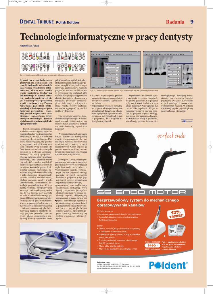 DTP0708_09-11_IR 15.07.2008 10:56 Uhr DENTAL TRIBUNE Seite 1 Badania Polish Edition 9 Technologie informatyczne w pracy dentysty Artur Olesch, Polska Ryc. 1: Na diagramie elektronicznym łatwiej zidentyfikować rozpoznanie. Dynamiczny wzrost liczby oprogramowań dla stomatologii i ich rozwój doskonale odzwierciedlają rosnącą świadomość informatyczną lekarzy oraz oczekiwania pacjentów. Tradycyjna dokumentacja w postaci kartotek i archiwów papierowych nie jest w stanie sprostać potrzebom współczesnej medycyny. Zagwarantowanie pacjentom profesjonalnej opieki wymaga – poza fachowym personelem – wysokiej jakości wyposażenia technicznego i zastosowania nowoczesnych technologii. Jednym z jej elementów jest niewątpliwie oprogramowanie. Nawet ograniczona konkurencja w służbie zdrowia spowodowała w ostatnich latach wzrost jakości usług medycznych, nie tylko w sektorze prywatnym, lecz i publicznym. Placówki stomatologiczne, aby sprostać wymaganiom swoich klientów, musiały zmienić swój stosunek do funkcjonowania na rynku – nastąpiła ewolucja od podejścia „świadczeniodawcy” do „relacji z pacjentem”. Obecnie mówimy o tzw. healthcare marketingu, czyli zestawie metod i narzędzi, których celem jest dbałość o satysfakcję pacjenta z naciskiem na rozwijanie kontaktów partnerskich. Według założeń marketingu healthcare, usługa zdrowotna składa się z kilku elementów strategicznych: personel (wiedza, doświadczenie), obsługa pacjenta, zasoby trwałe (umeblowanie, wyposażenie), interakcja personel-pacjent. Z tego punktu widzenia oprogramowanie awansuje z roli zwykłego wyposażenia do roli zasobu, który pozwala na stałe udoskonalanie obsługi pacjenta. Oddziaływanie systemów informatycznych jest wielokierunkowe – wspomagają budowanie pozytywnego wizerunku nowoczesnej i świetnie zaopatrzonej placówki, pozwalają poprawić standardy obsługi pacjenta, powodują znaczny wzost jakości dokumentacji medycznej. Funkcję terminarza może pełnić zwykły zeszyt lub kalendarz, ale harmonogram elektroniczny pozwala na szybkie i optymalne zorganizowanie grafiku pracy. Kartoteki pacjentów można archiwizować w przepełnionych szufladach albo wyświetlić w przejrzystej postaci na ekranie komputera; dokumentację medyczną (wywiady stomatologiczne, informacje o kolejnym terminie wizyty, recepty, rachunki) też można wypisywać ręcznie lub szybko wydrukować. Czy oprogramowanie w gabinecie stomatologicznym jest w dzisiejszych czasach koniecznością, czy stanowi tylko dodatkowy element wyposażenia oferujący ograniczone korzyści? W ostatnich latach obserwujemy bardzo dynamiczny funkcjonalny rozwój oprogramowania dla stomatologii. Kartoteki pacjentów oraz terminarz wizyt należą do opcji standardowych. Coraz częściej za pomocą systemu możemy komunikować się z pacjentem oraz tworzyć rozbudowane plany leczenia. Mówiąc w skrócie, celem oprogramowania jest przyspieszenie i usprawnienie procesów zachodzących w placówce medycznej, a zwłaszcza: • wspomaganie szeroko rozumianego procesu (logistyki) obsługi pacjenta: od chwili pierwszego kontaktu z pacjentem (czyli jego rejestracji) poprzez kompleksową organizację kolejnych wizyt, • gromadzenie oraz archiwizacja dokumentacji medycznej, prosta i przejrzysta prezentacja danych na ekranie komputera (w postaci graficznej), wydruk obligatoryjnej dokumentacji w formie papierowej, • płynna komunikacja systemu z otoczeniem (np. wymiana danych z połączonymi siecią stanowiskami pracy, z innymi placówkami ochrony zdrowia, z pacjentem poprzez rejestrację internetową, czy system wiadomości interaktywnych), Ryc. 2: Obróbka graficzna oraz analiza zdjęć stomatologicznych w systemie informatycznym. • aktywne wspomaganie procesu leczenia stomatologicznego dzięki możliwości obróbki zgromadzonych danych, • wspomaganie procesów zarządzania poprzez wielowymiarową analizę zebranych danych oraz wbudowane algorytmy ich przetwarzania, • rozwijanie indywidualnych relacji z pacjentami, bez względu na liczbę leczonych osób. Wymienione możliwości oprogramowania przynoszą bezpośrednie profity gabinetom. Czy pacjenci będą mogli również odnieść z tego jakieś korzyści? Niewątpliwie tak i to w kilku aspektach. Wizyta w zinformatyzowanym miejscu oznacza dla pacjenta: szybszą obsługę, możliwość nawiązania i podtrzymania trwalszych relacji z gabinetem, wizualizację procesu leczenia sto- matologicznego, łatwiejszą komunikację, czy chociażby komfort psychiczny związany z leczeniem w profesjonalnym i nowocześnie wyposażonym miejscu. W usłudze zdrowotnej aspekt psychologiczny odgrywa bardzo istotną rolę. DT strona 10 AD DTP0708_09-11_IR 15.07.2008 10:56 Uhr Seite 2 DENTAL TRIBUNE 10 Badania DT strona 9 Korzyści praktyczne Systemy informatyczne dla stomatologii oferują kompleksowe wspomaganie pracy gabinetu zarówno w sferze administracyjnej, jak i medycznej. Dobrej jakości oprogramowanie harmonijnie łączy ze sobą te dwie sfery. Uwzględnia je klasyfikacja głównych grup funkcji, które musi realizować dobry system. Należą do nich następujące funkcje: • medyczne: archiwizacja kartotek medycznych, prezentacja stanu uzębienia na diagramie graficznym, planowanie leczenia, wywiady stomatologiczne, generowanie oraz wydruk pełnej dokumentacji medycznej (np. skierowań, recept), uzupełnianie indywidualnej dokumentacji pacjenta o zdjęcia uzyskane z zewnątrz, • finansowe: wszelkie rozliczenia finansowe z pacjentami oraz jednostkami zewnętrznymi (np. Narodowym Funduszem Zdrowia), • organizacyjne: czynności związane z organizacją oraz planowaniem wizyt pacjentów, gromadzeniem, przechowywaniem oraz wydrukiem dokumentacji medycznej; tworzenie harmonogramów pracy lekarzy, gabinetów, planowanie wizyt w terminarzu graficznym, wyszukiwanie wolnych terminów wizyt, zarządzanie planem wizyt oraz organizacja kolejki oczekujących, powiadamianie pacjentów